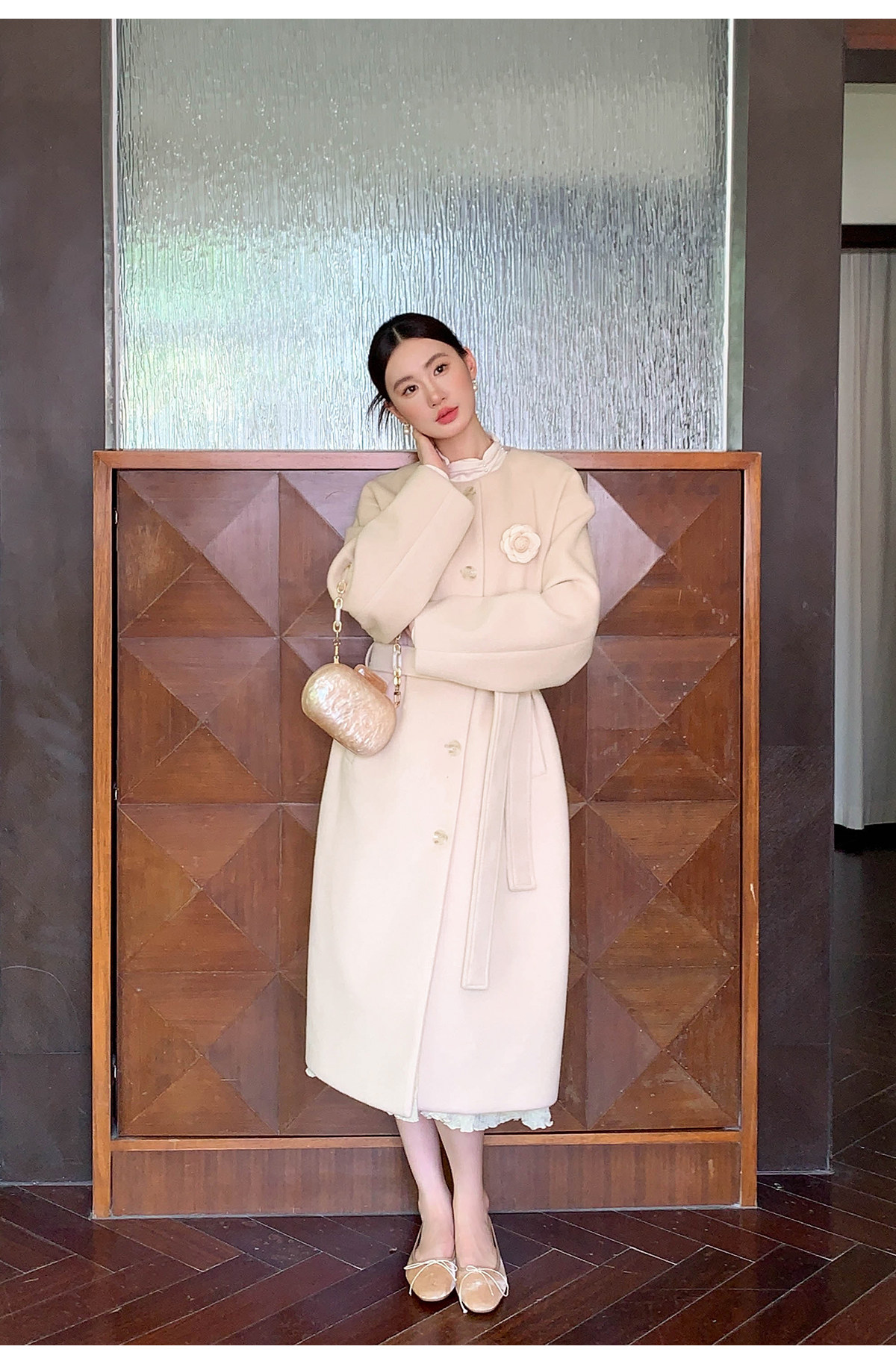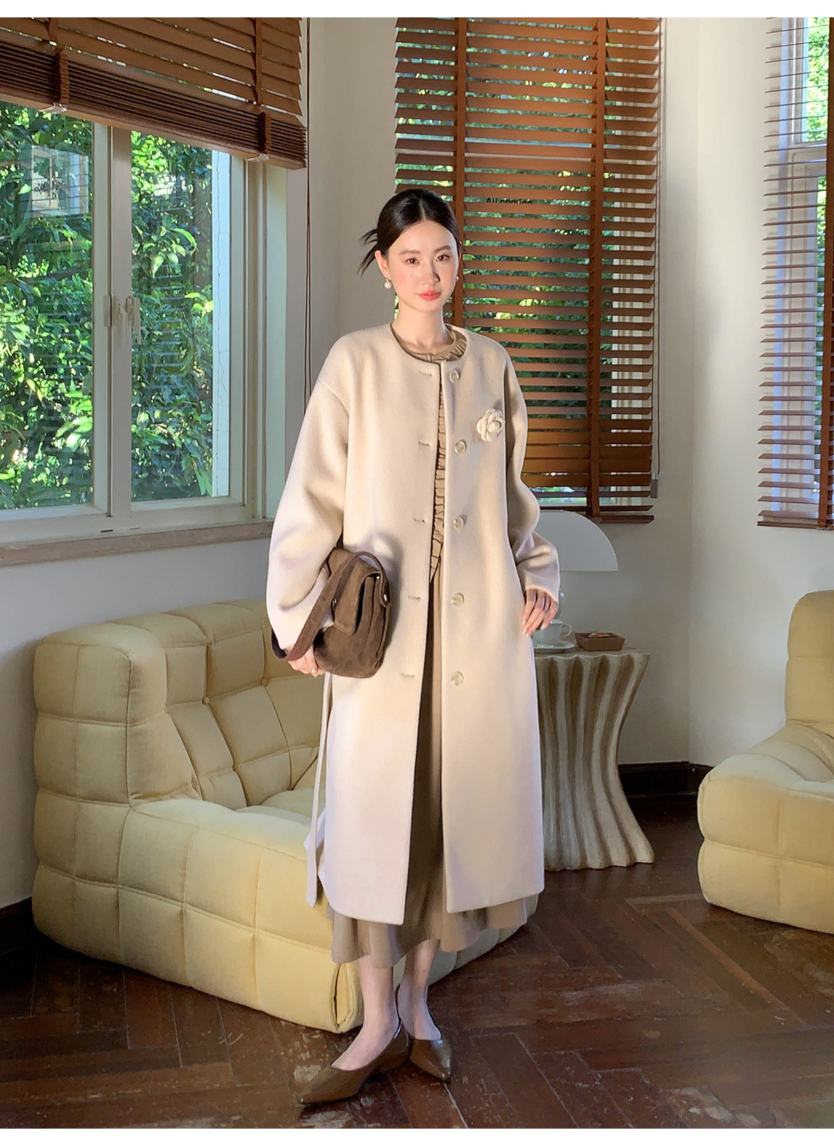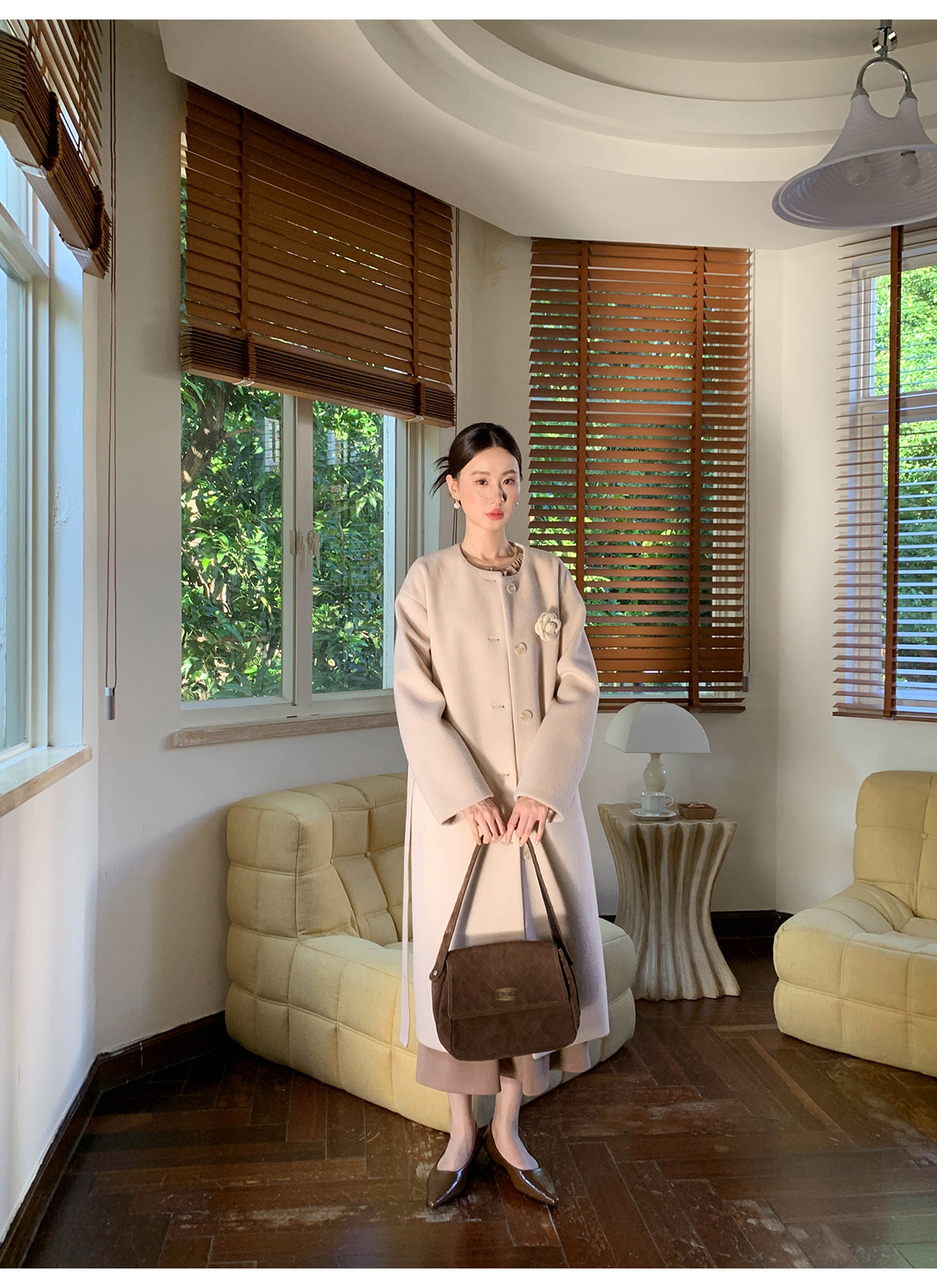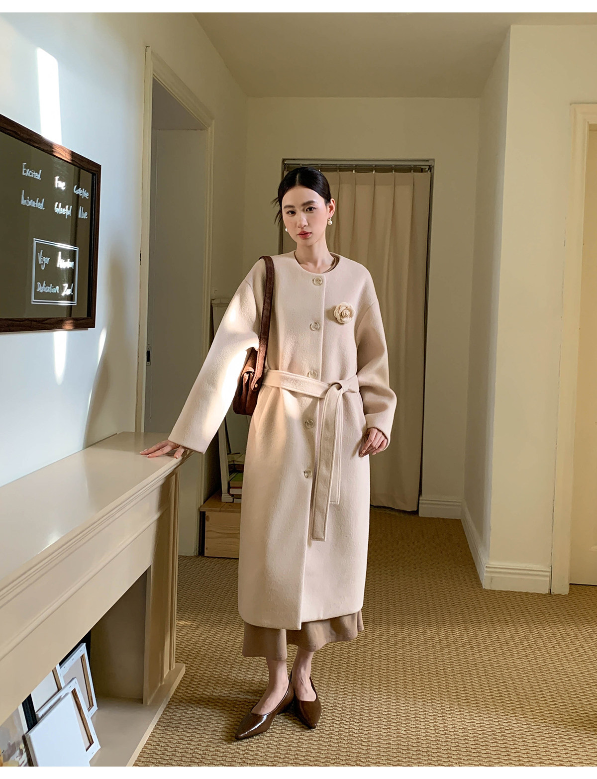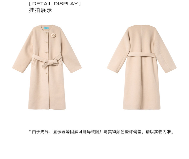 Xxning French Floral Brooch Woolen Long Coat for Women, Autumn High-End Woolen Coat for Wealthy Young Ladies