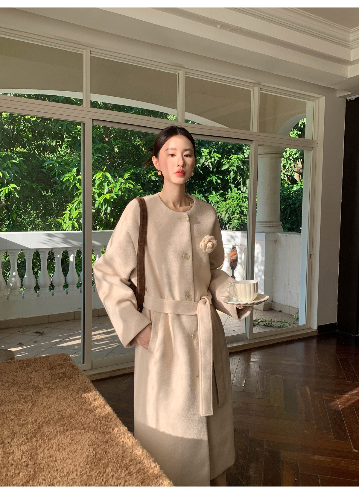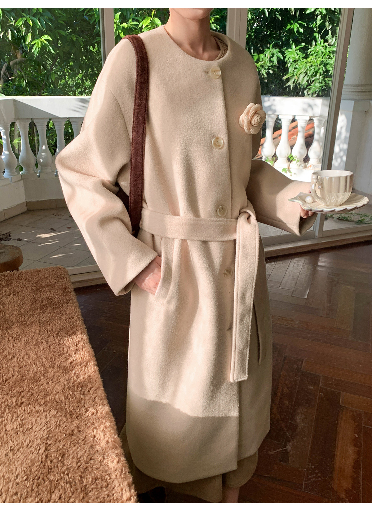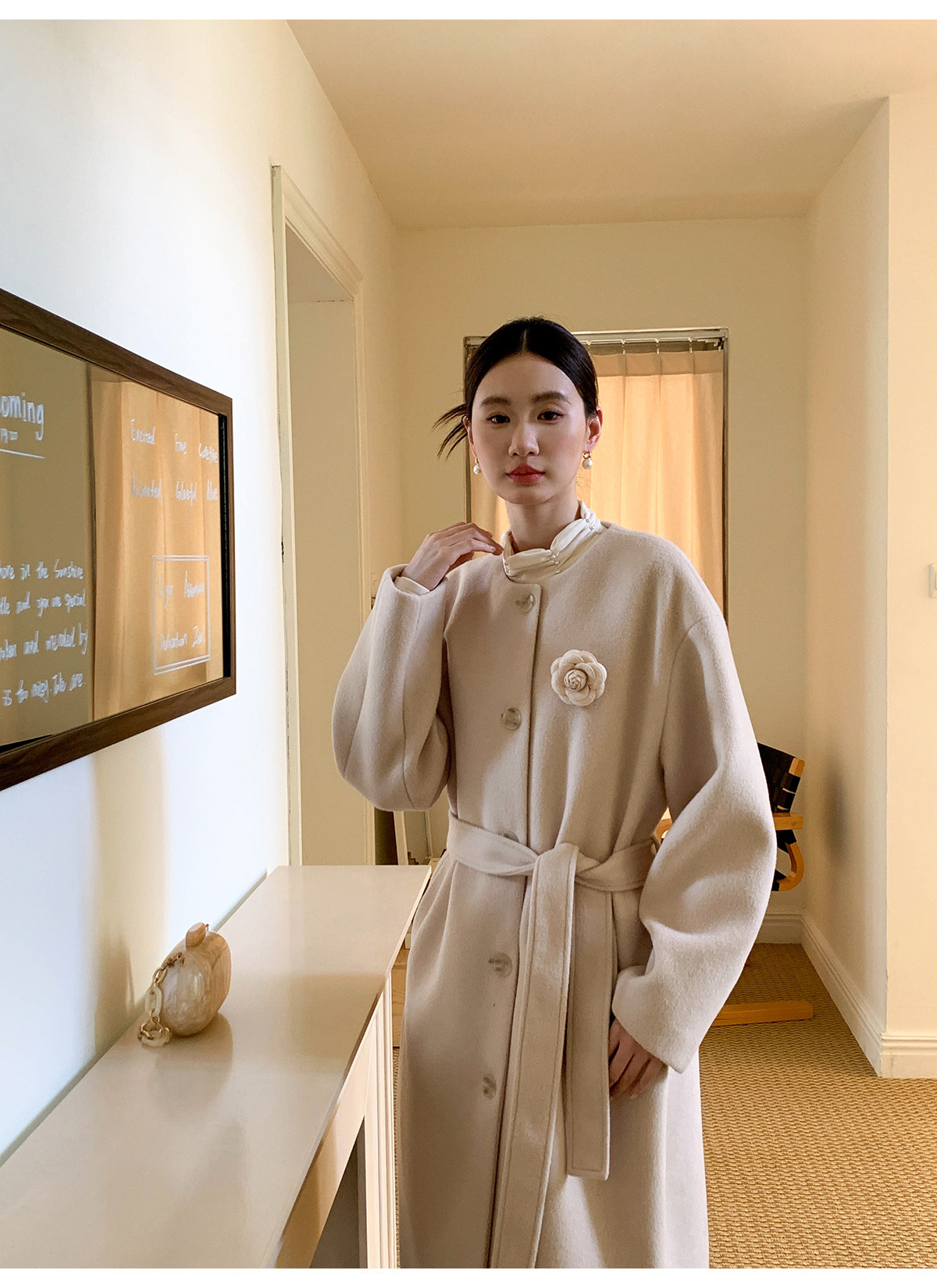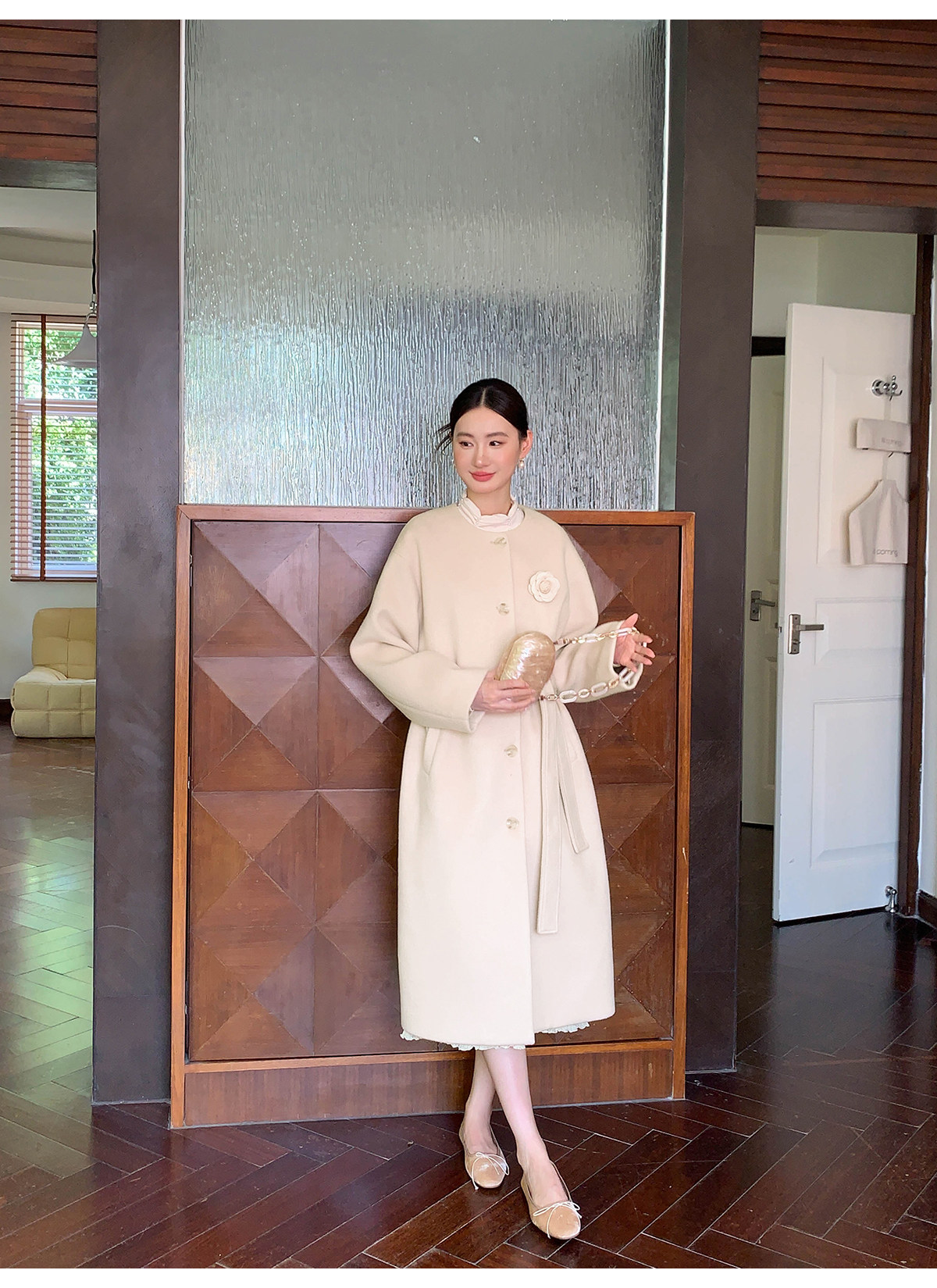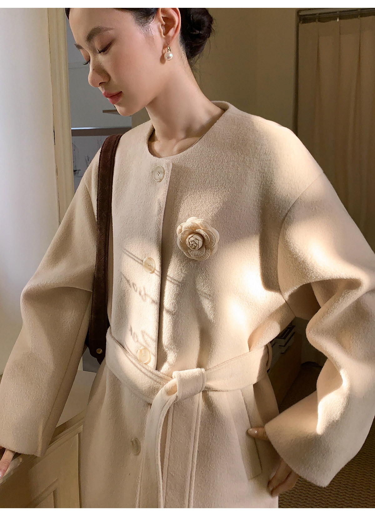 Xxning French Floral Brooch Woolen Long Coat for Women, Autumn High-End Woolen Coat for Wealthy Young Ladies