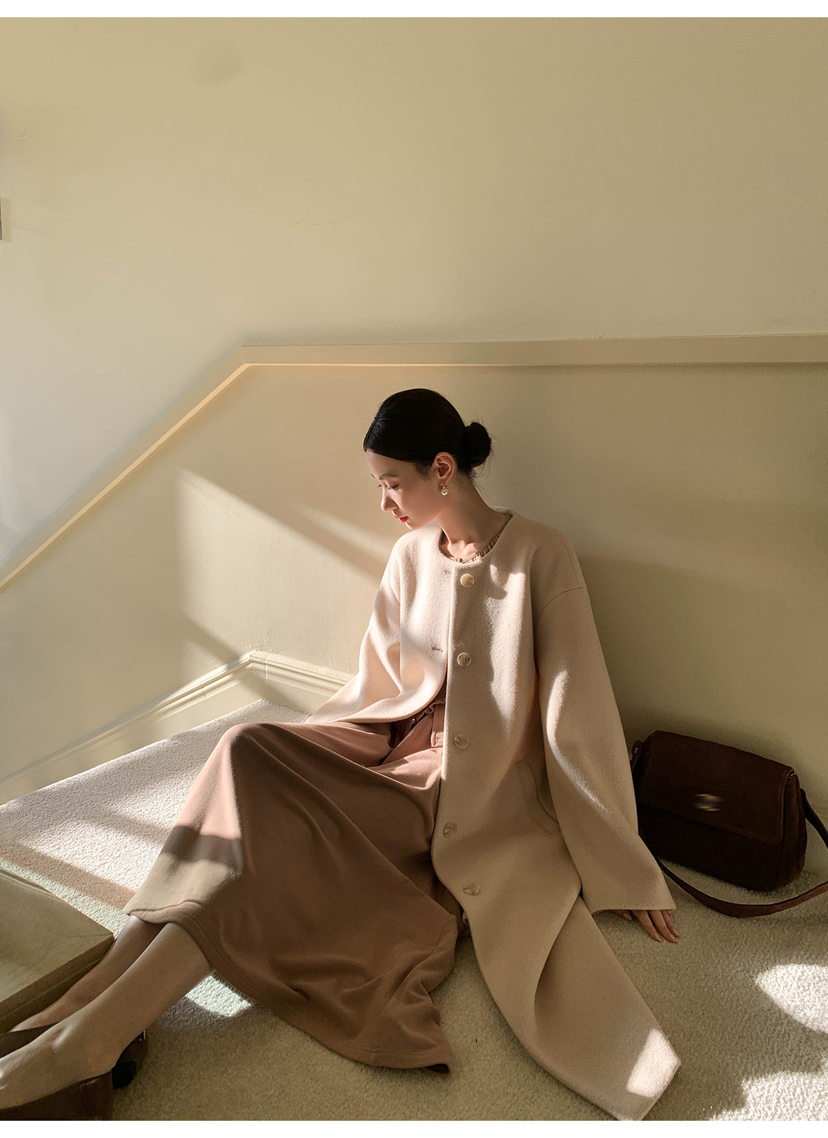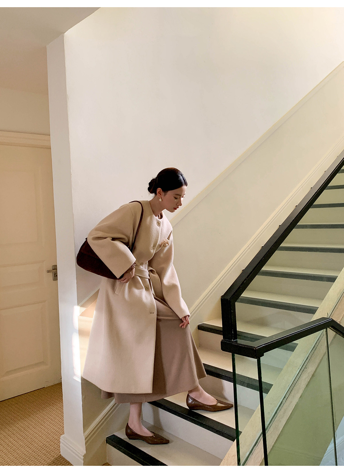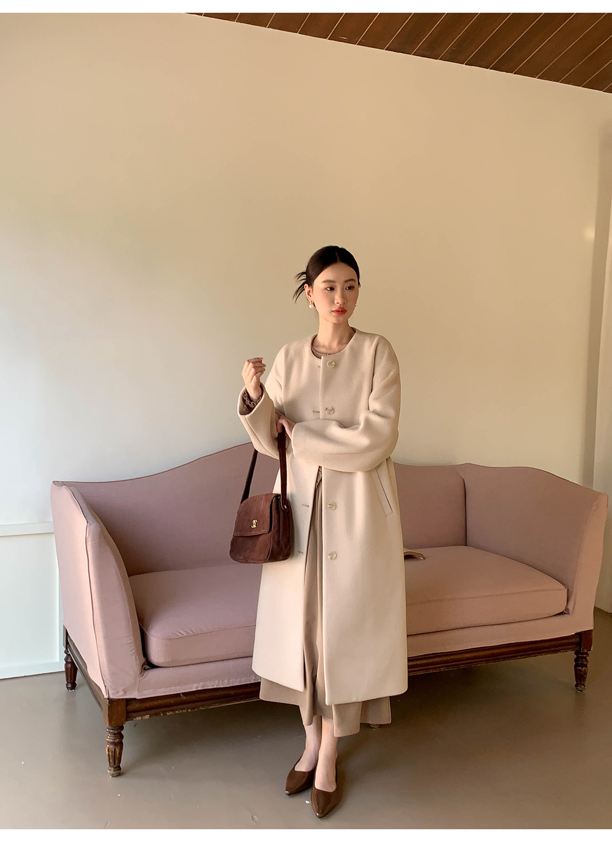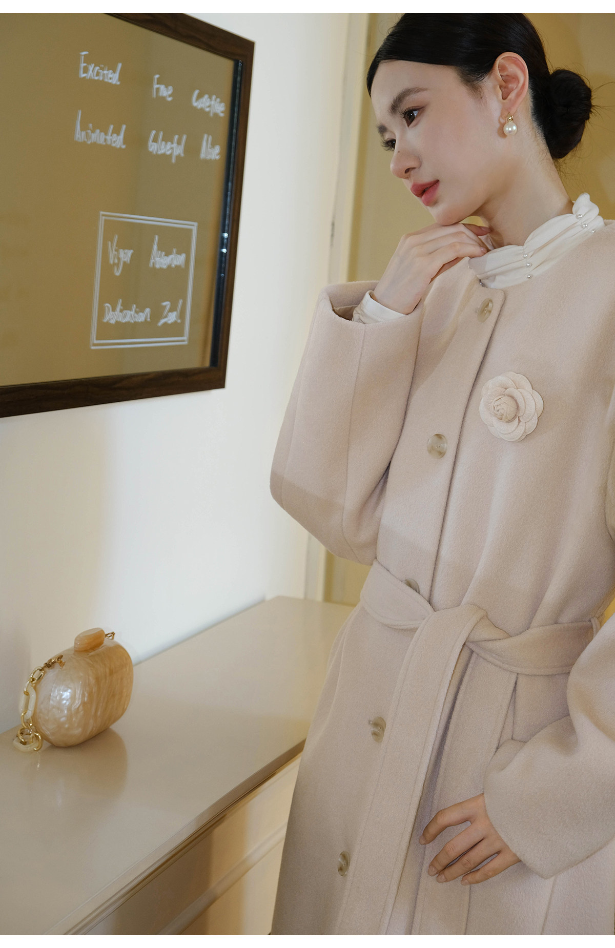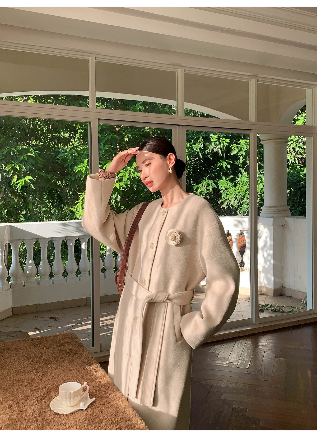 Xxning French Floral Brooch Woolen Long Coat for Women, Autumn High-End Woolen Coat for Wealthy Young Ladies