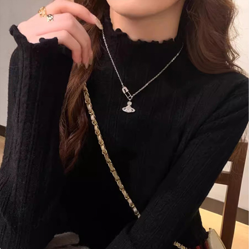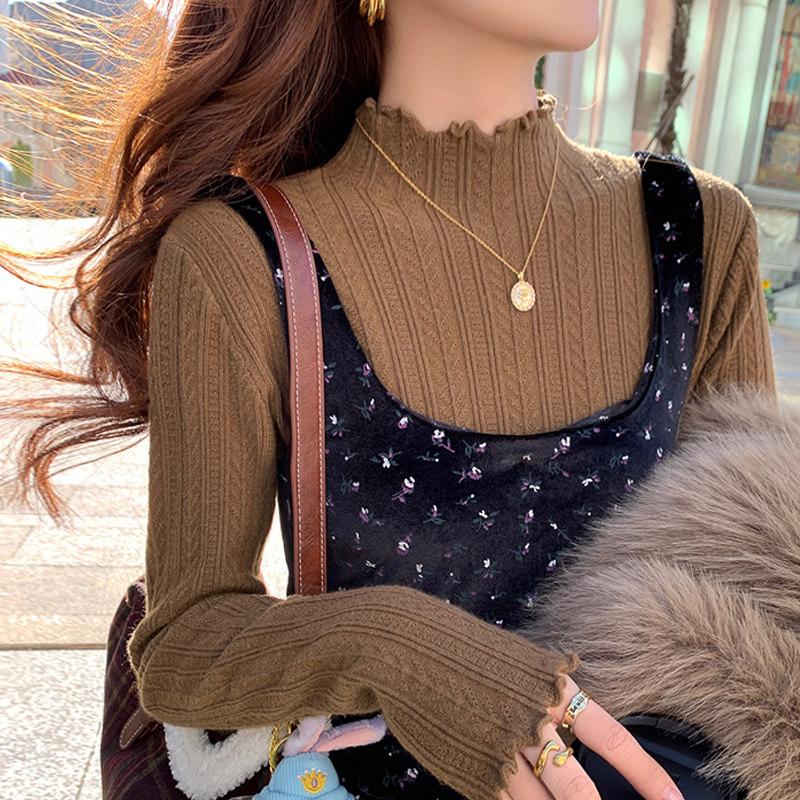Sweet Hollow-Out Ruffled Half-High Collar Knit Sweater for Women, New Spring Korean Style Slim Fit Warm Base Shirt Women's Sweater