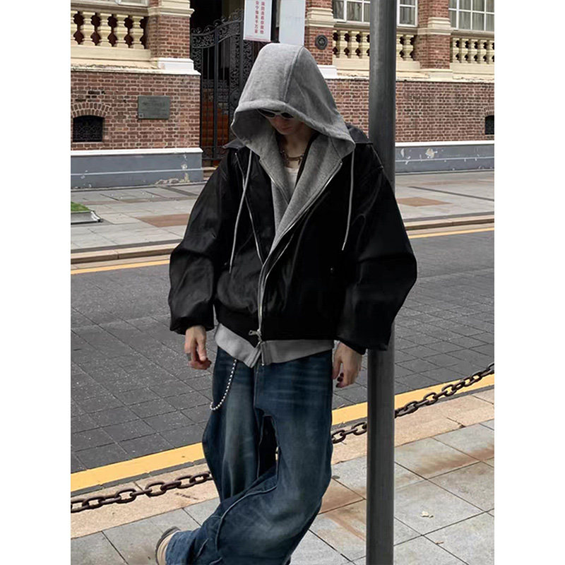 Fake Two-Piece Hooded Patchwork Pu Leather Jacket for Men, New Autumn Style, High-End, Loose, Casual, Cool and Handsome Couple Style Top