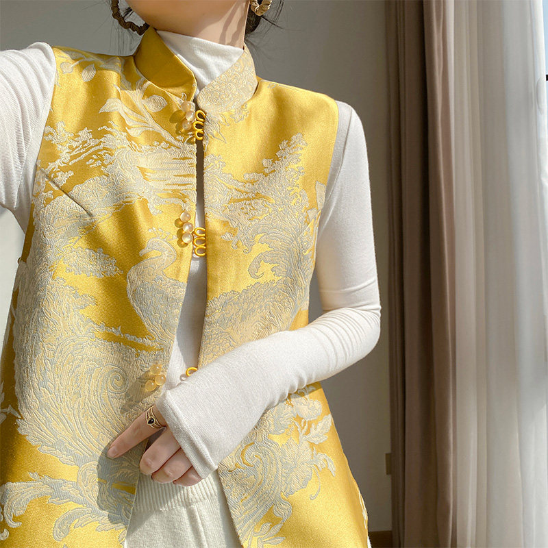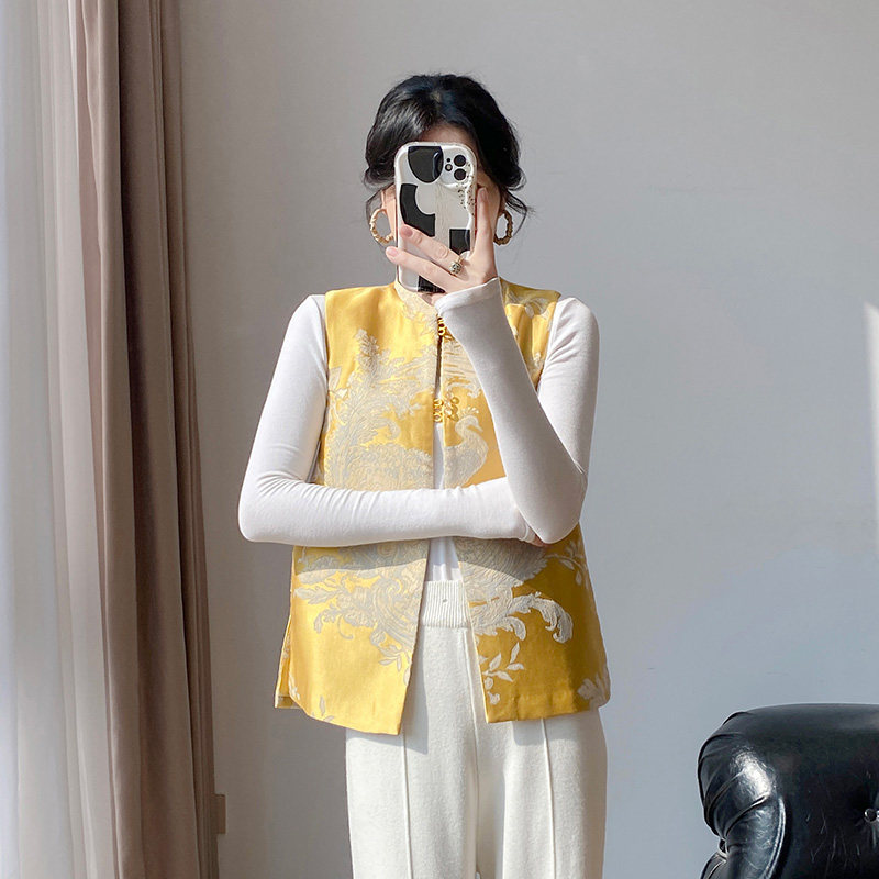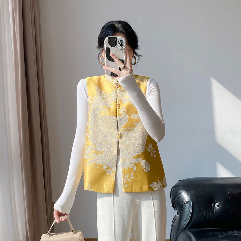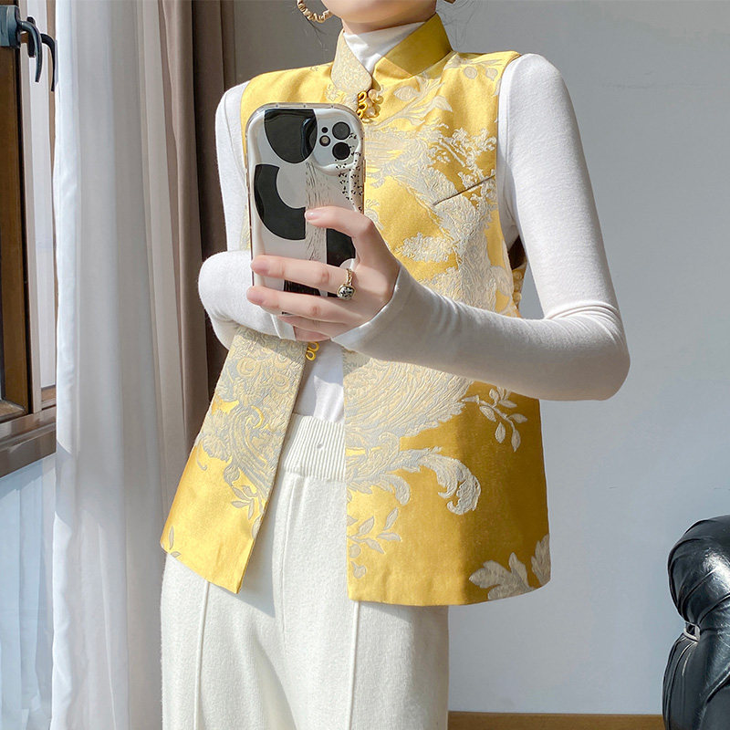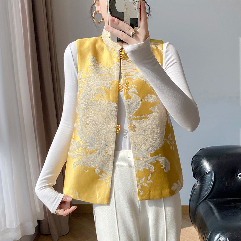 Lingze X's Spring and Autumn New Chinese-Style Phoenix Embroidery Acetate Button Yellow Vest for Women