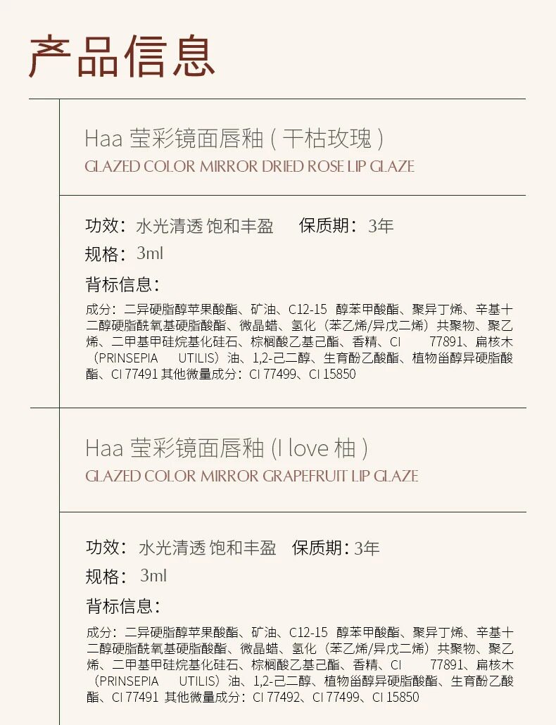 Color Classification ---- Haa Radiant Mirror Lip Glaze ----,Princess on the Run,I Love Pomelo,Dry Rose,Hong Kong Style Frozen Milk Tea,----Haa Velvet Mist Lip Mud----,Oats,Hua Mei,Lychee White Tea,Sweetheart Guava