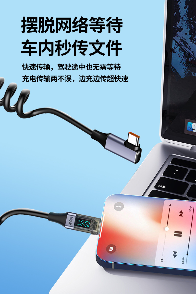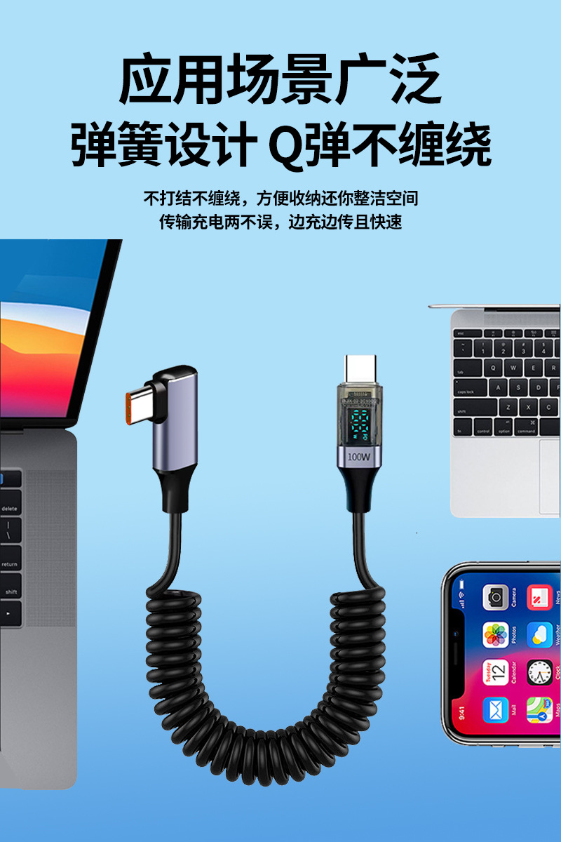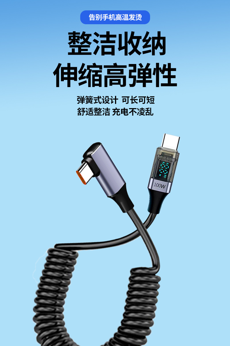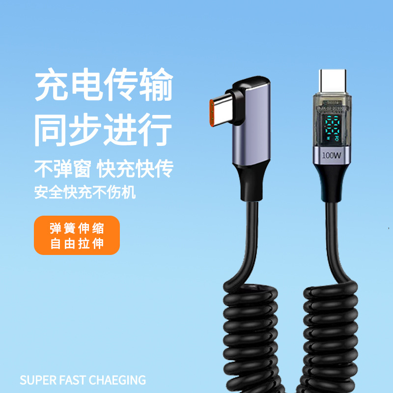 100W Super Fast Charging Dual Type-C Spring Retractable Data Cable with Smart Digital Display Usb, Suitable for Huawei Mate60 Flash Charging, Android iPhone 15 /16 Elbow Charger, Dual-Head Tpc Mobile Phone Charger