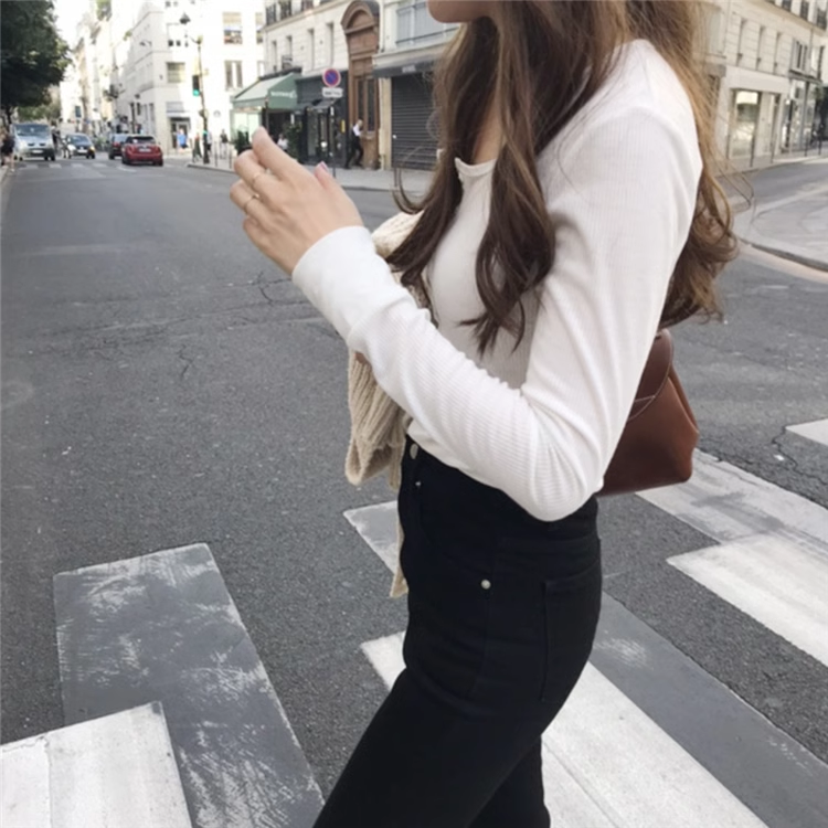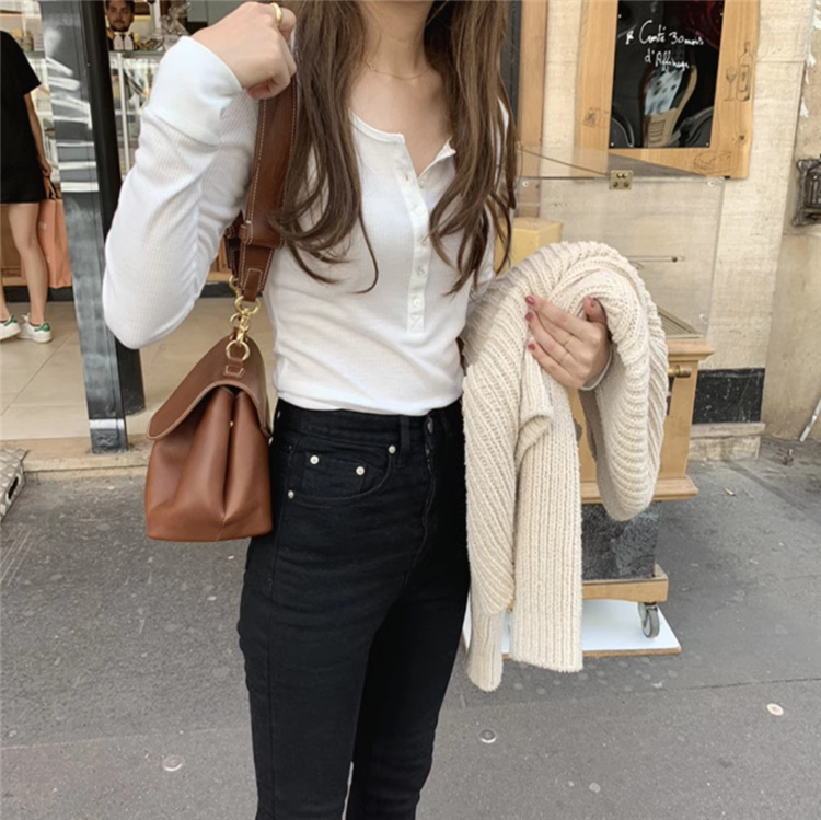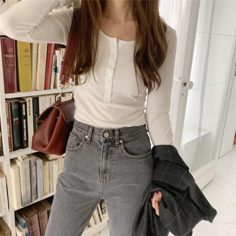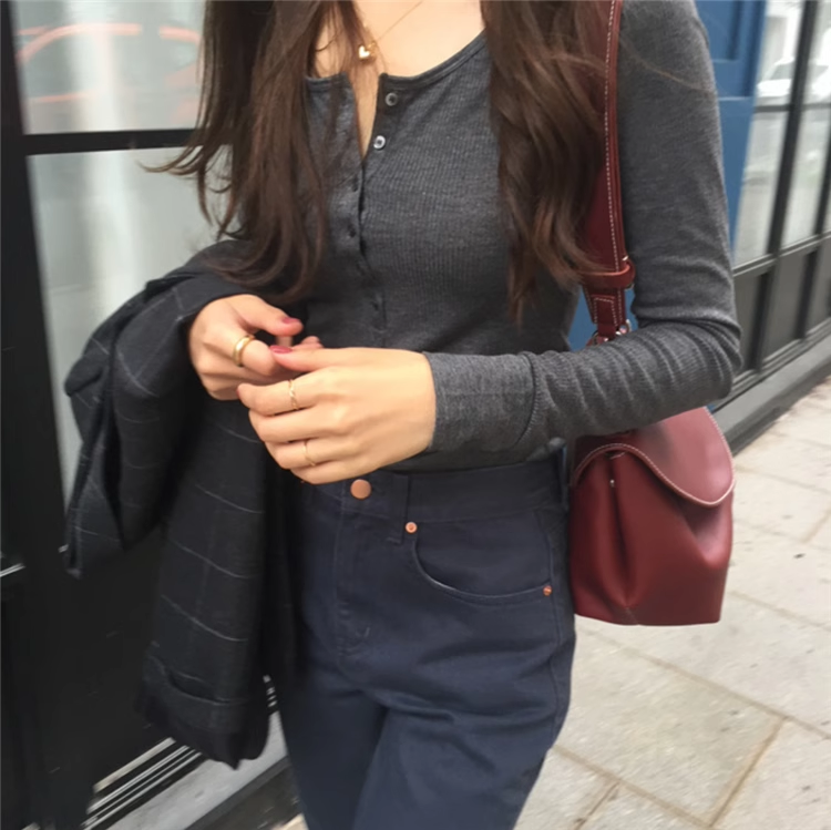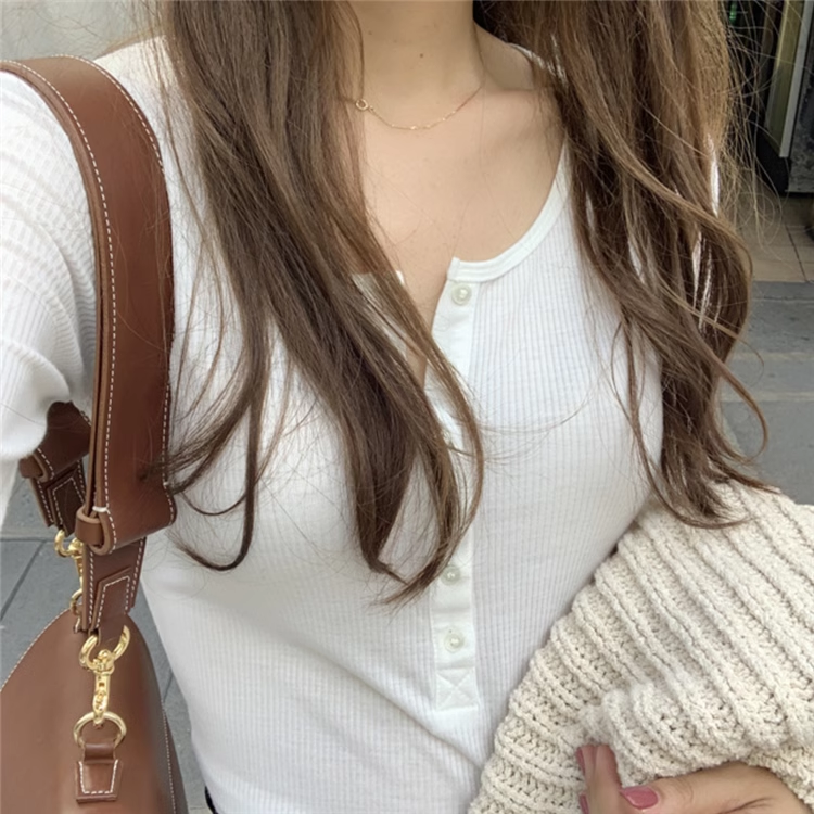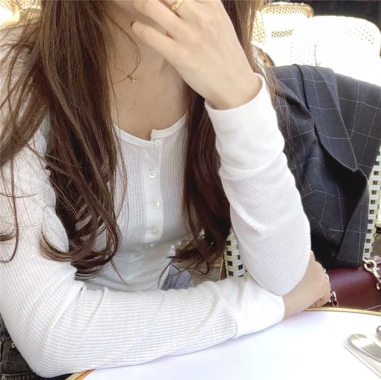 Unique and Chic Henry Collar Inner Layering Shirt for Women, Autumn and Winter Design with Buttons, Slimming, Regular Shoulder, Long-Sleeved T-Shirt Top