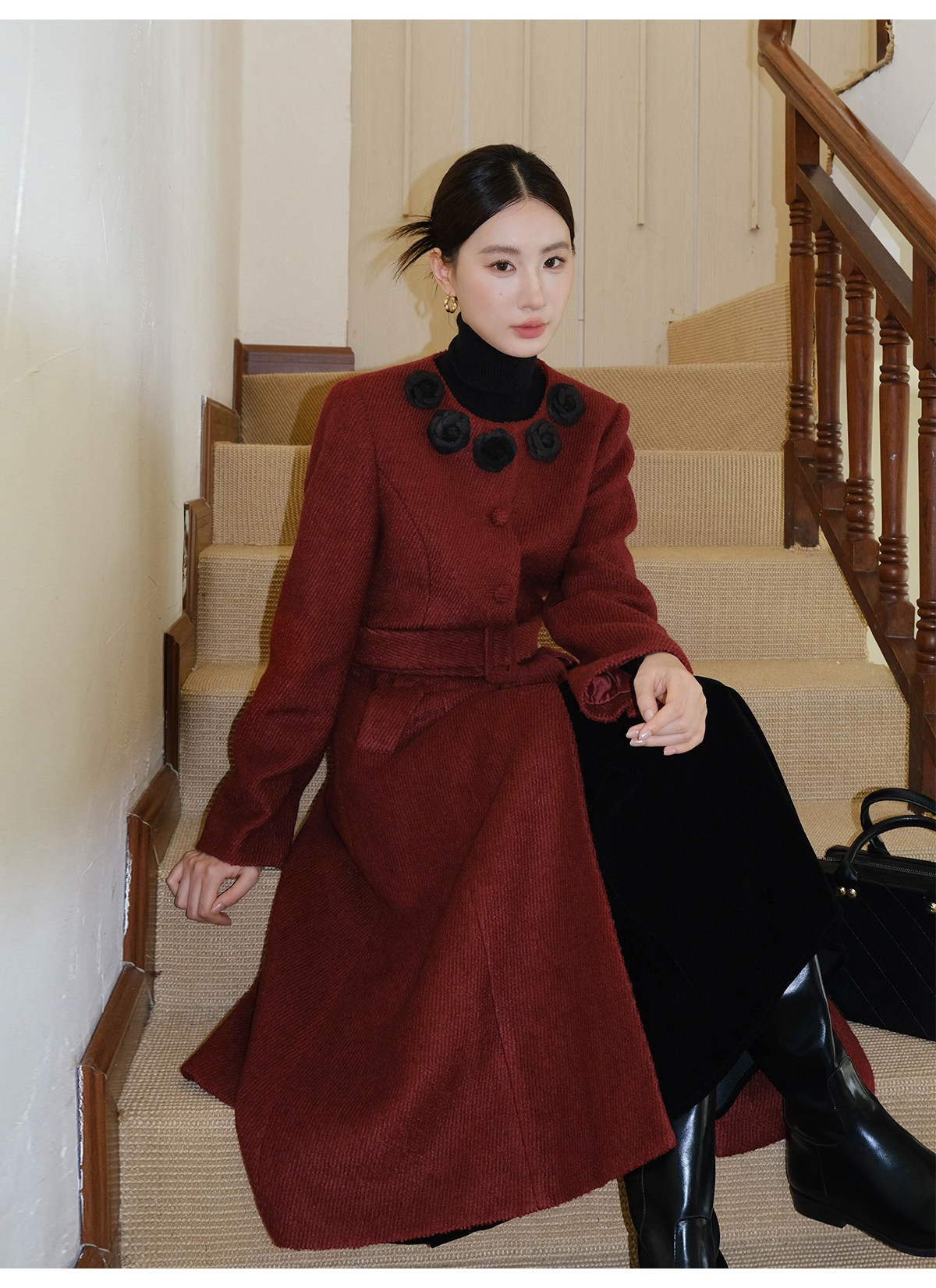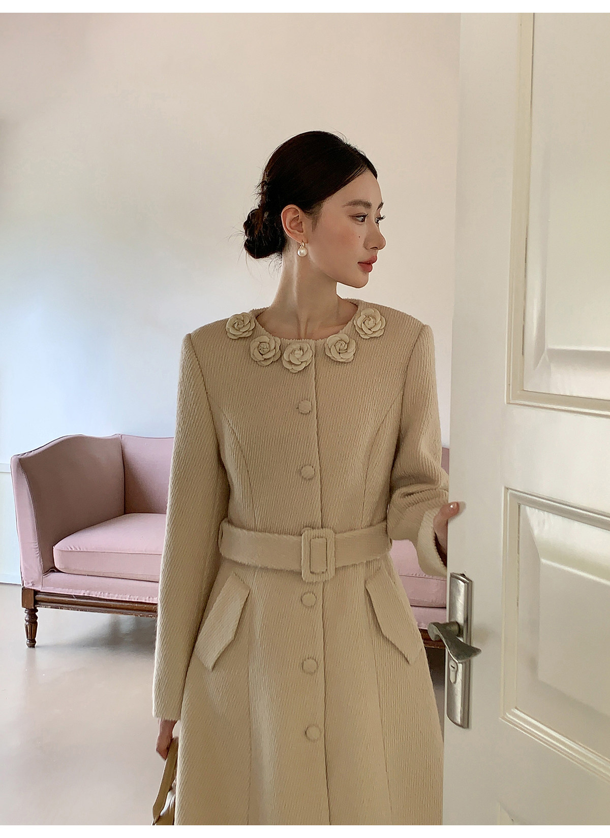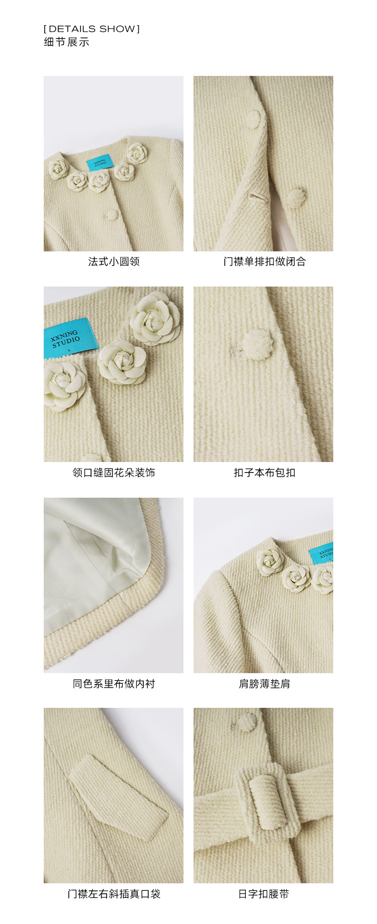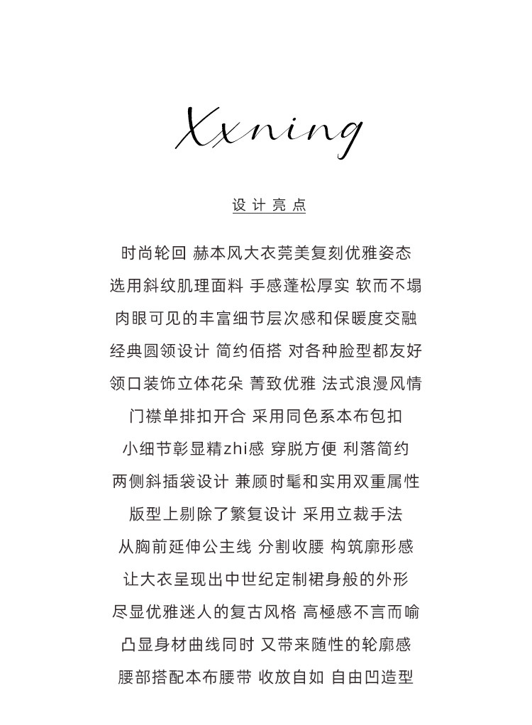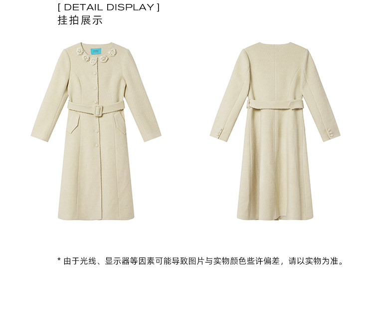 XXNING French retro palace style flower collar waisted woolen coat for women in autumn waist slimming long coat