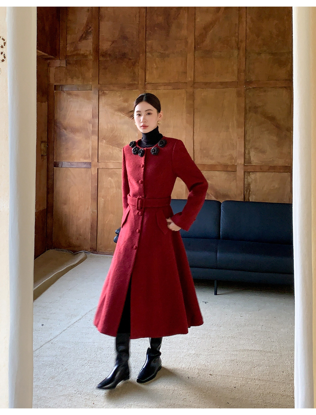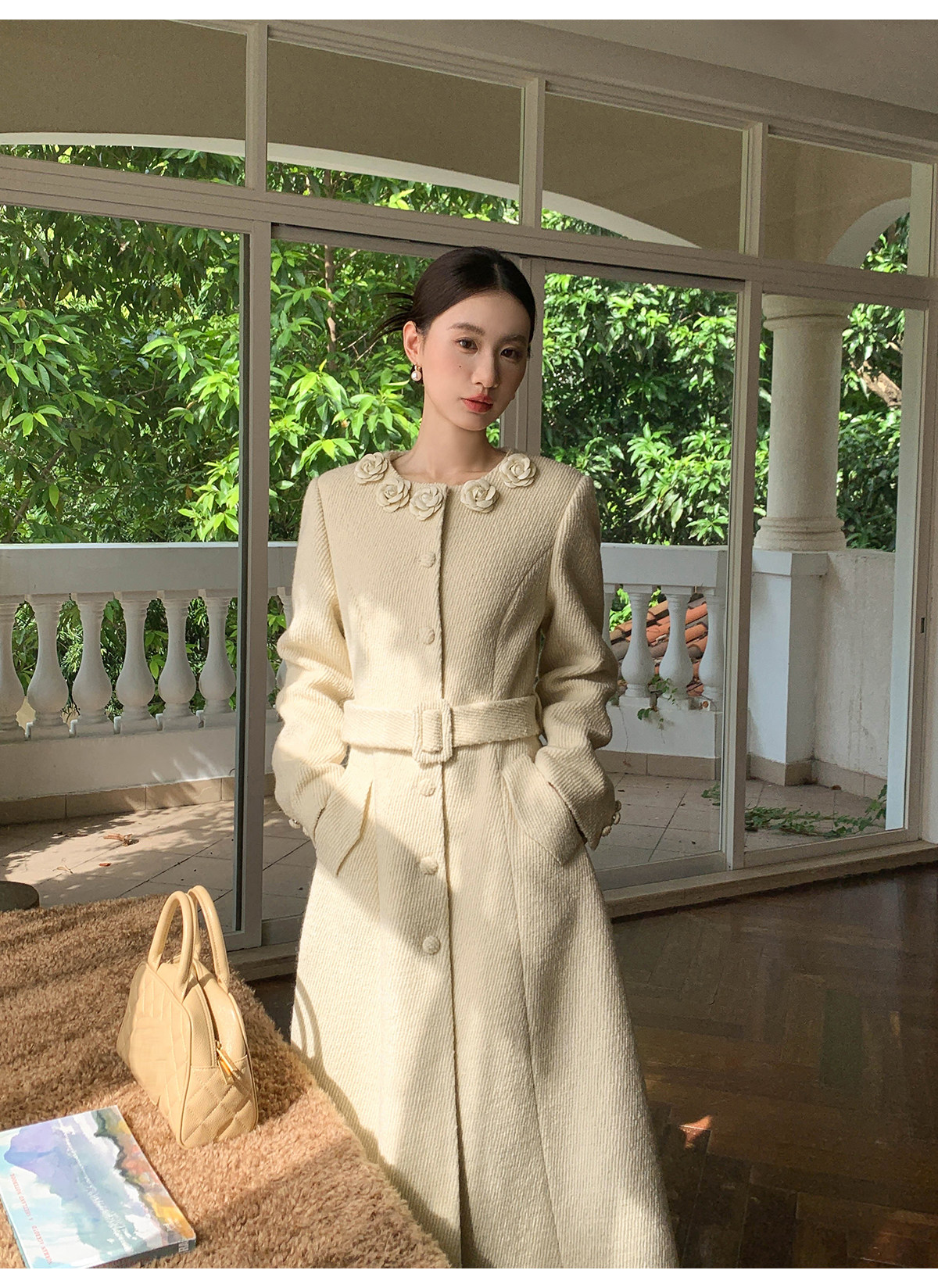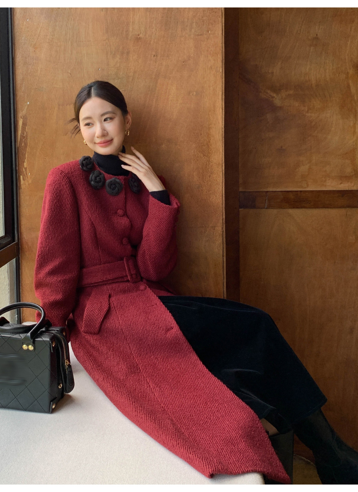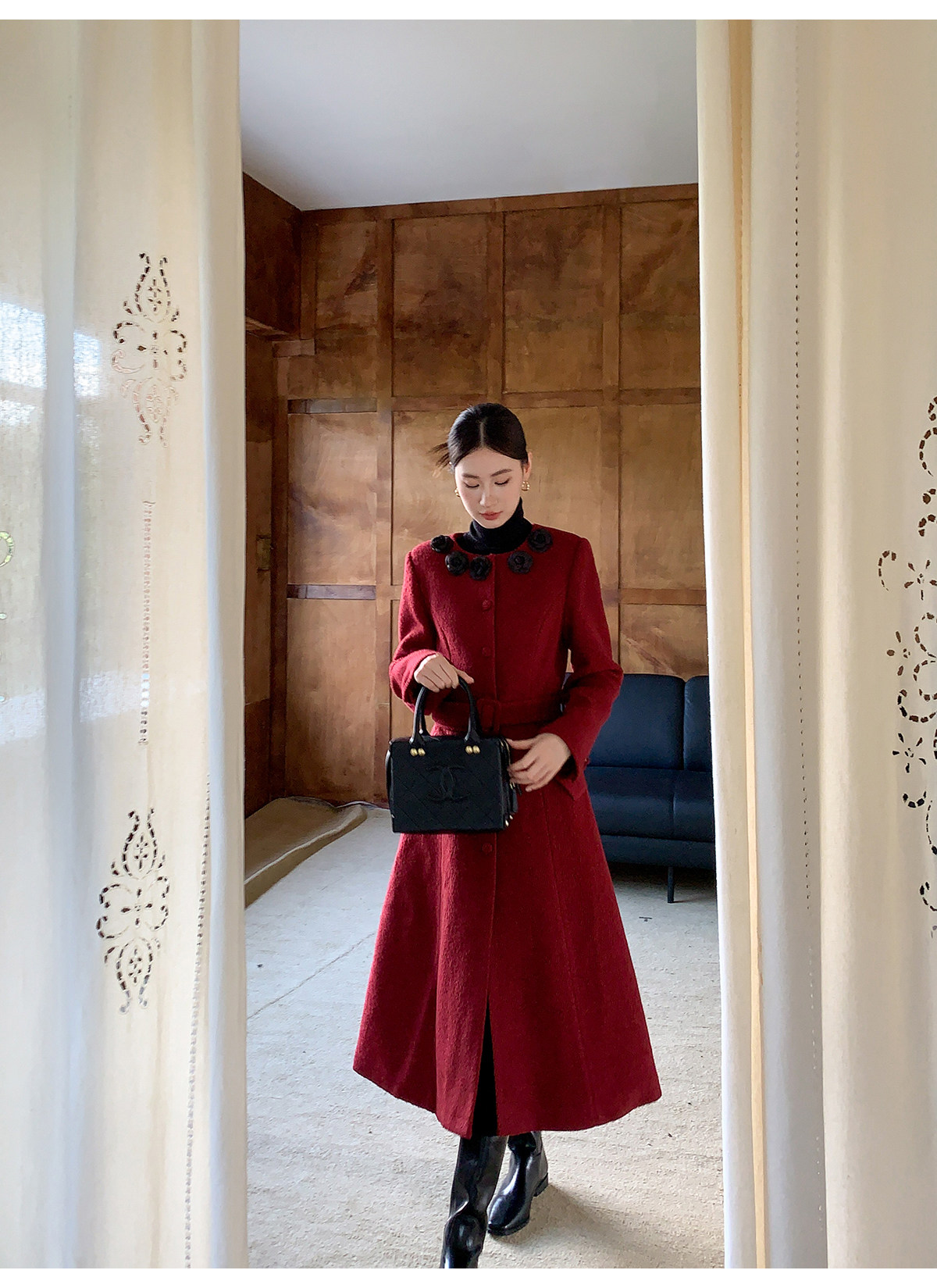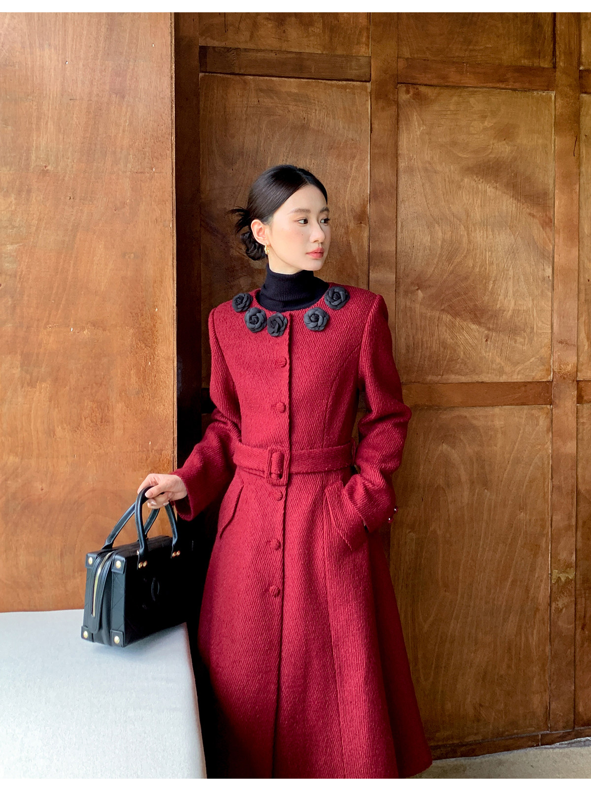 XXNING French retro palace style flower collar waisted woolen coat for women in autumn waist slimming long coat