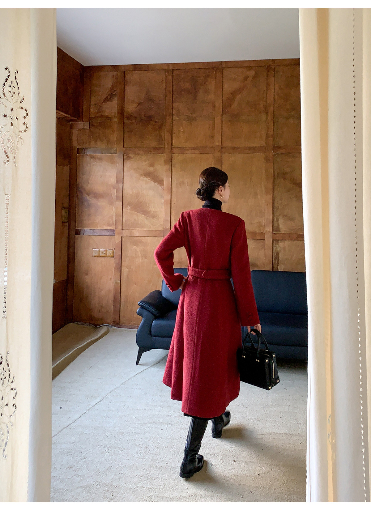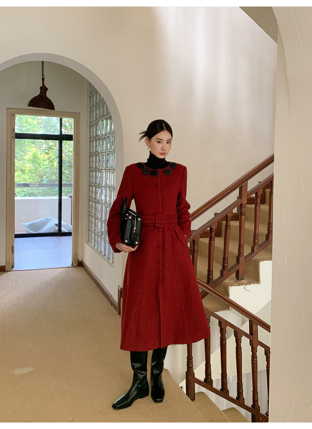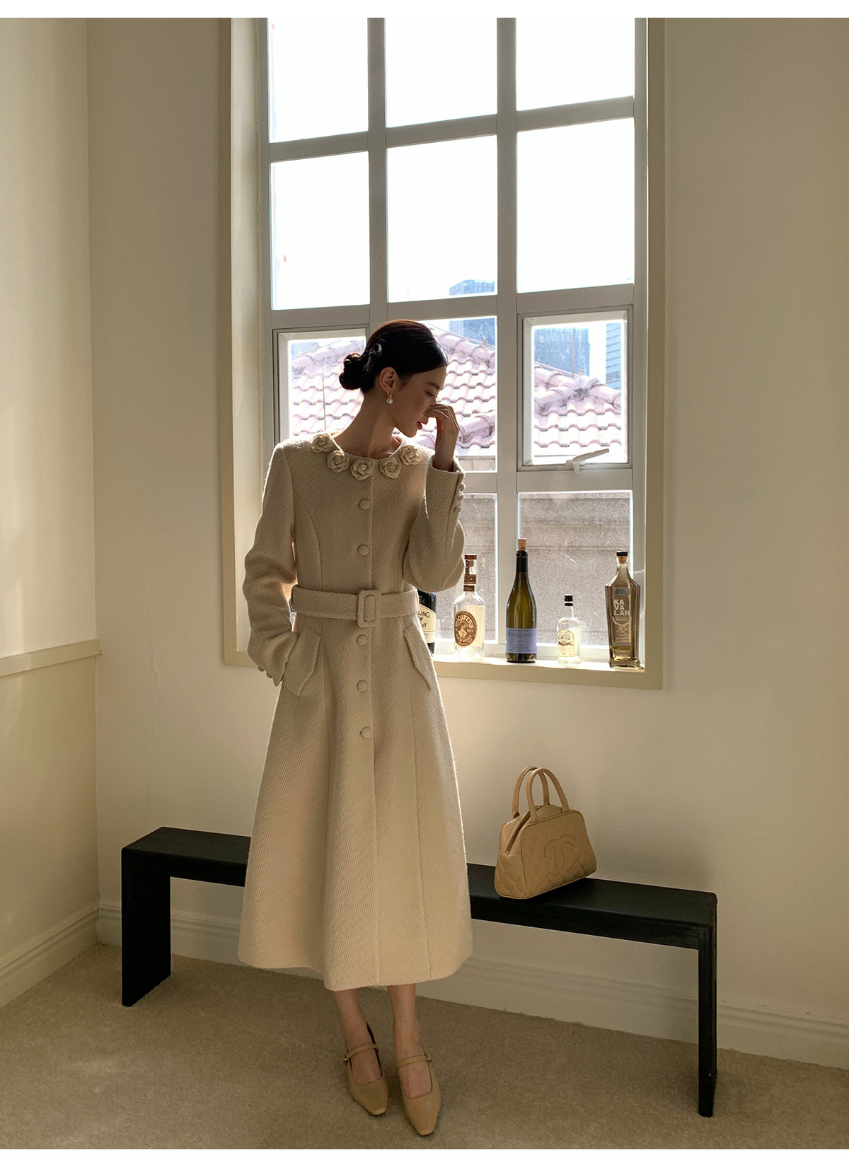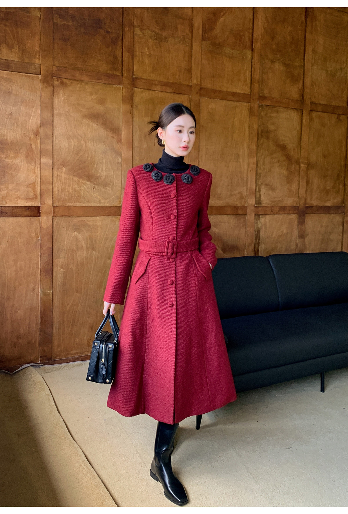 XXNING French retro palace style flower collar waisted woolen coat for women in autumn waist slimming long coat