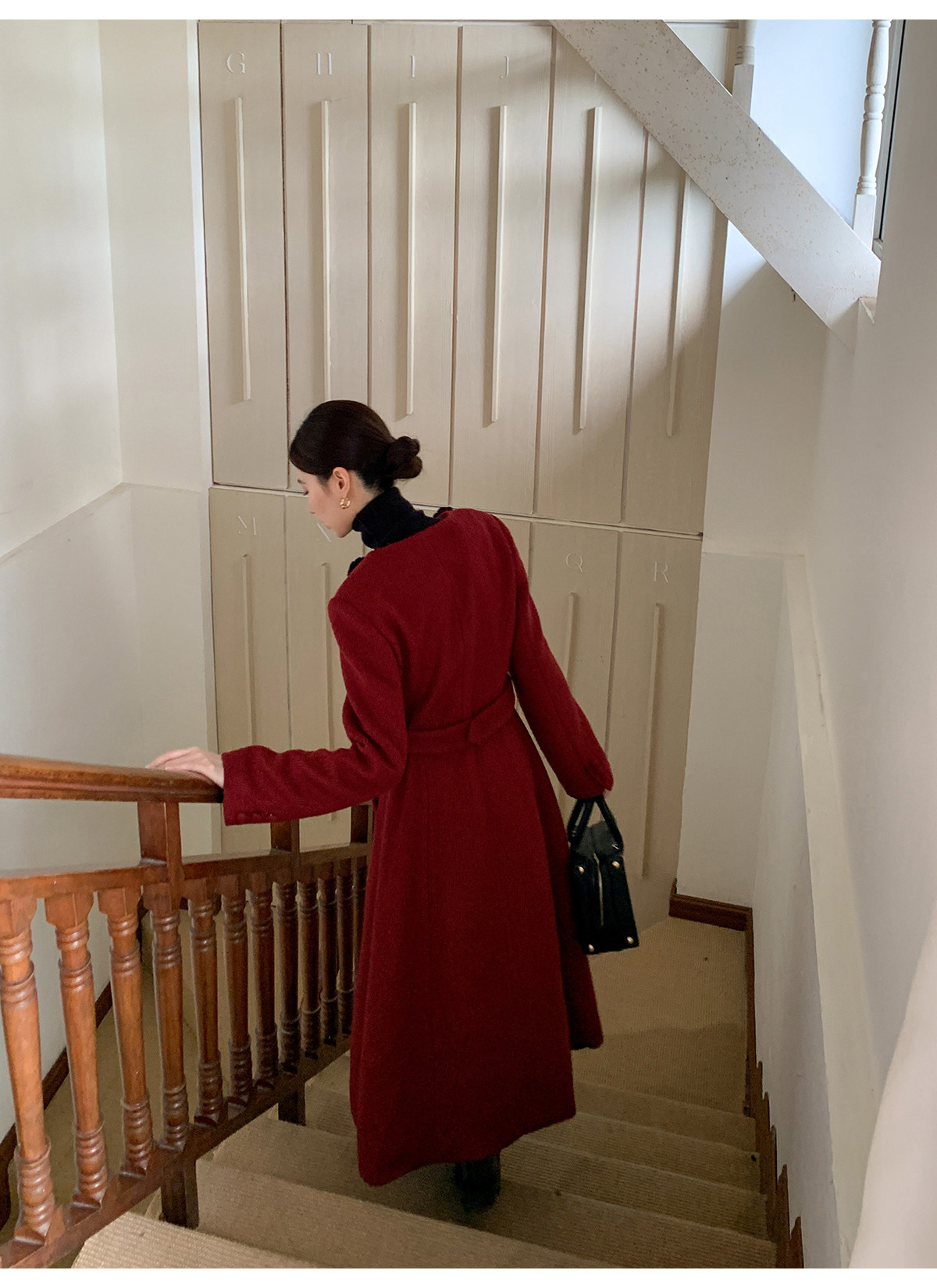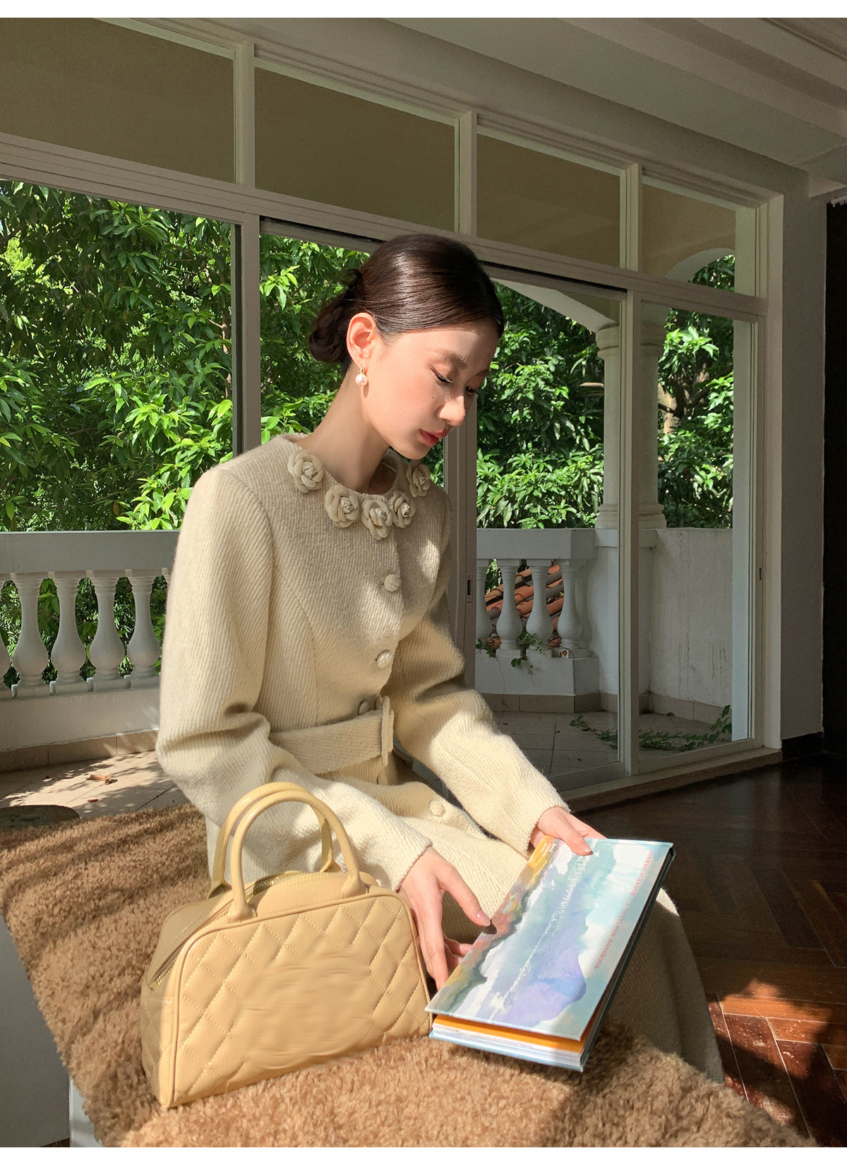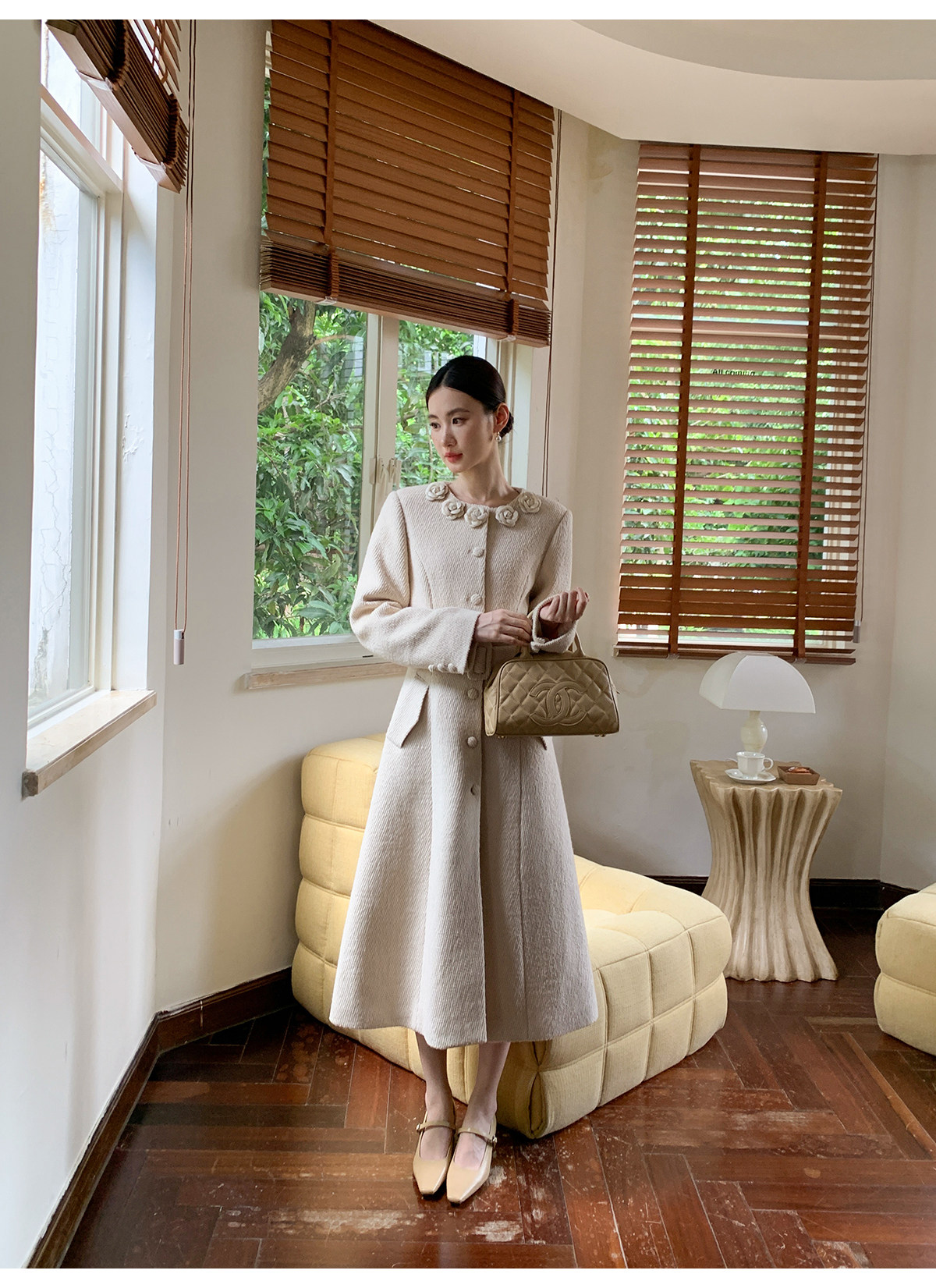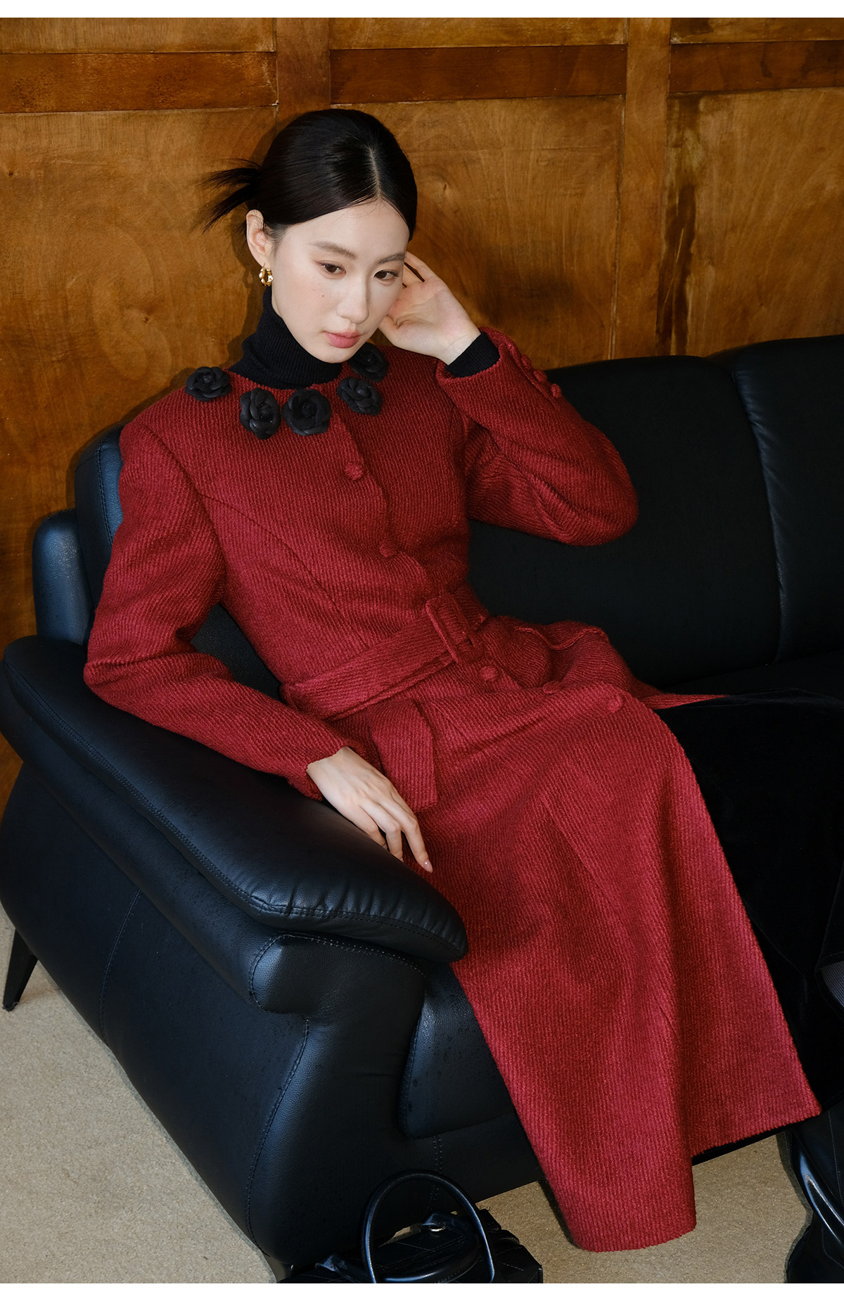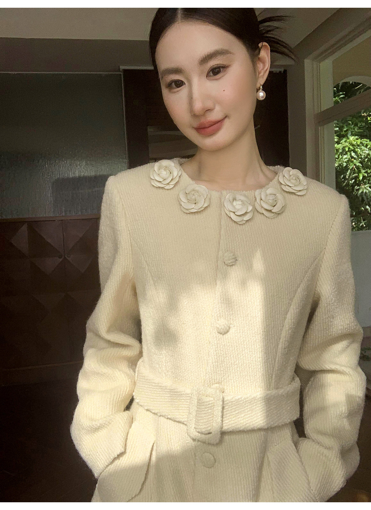 XXNING French retro palace style flower collar waisted woolen coat for women in autumn waist slimming long coat
