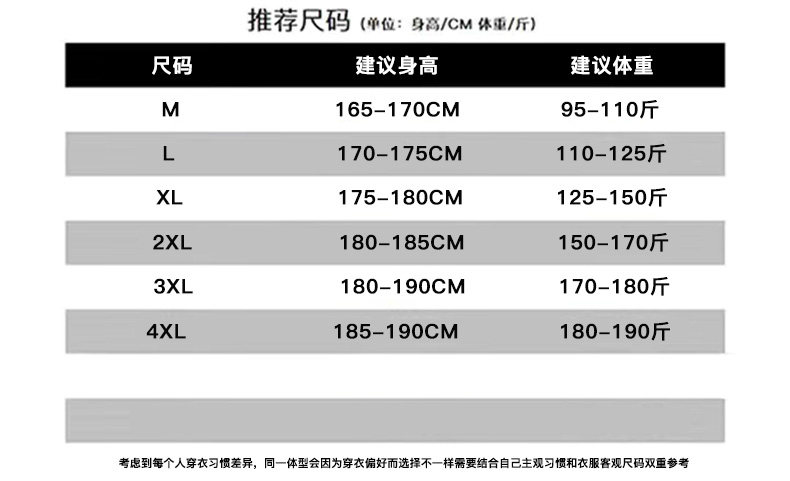 China (cm) 165 / 88-90 170 / 96-98 175 / 108-110 180 / 118-122 185 / 126-130