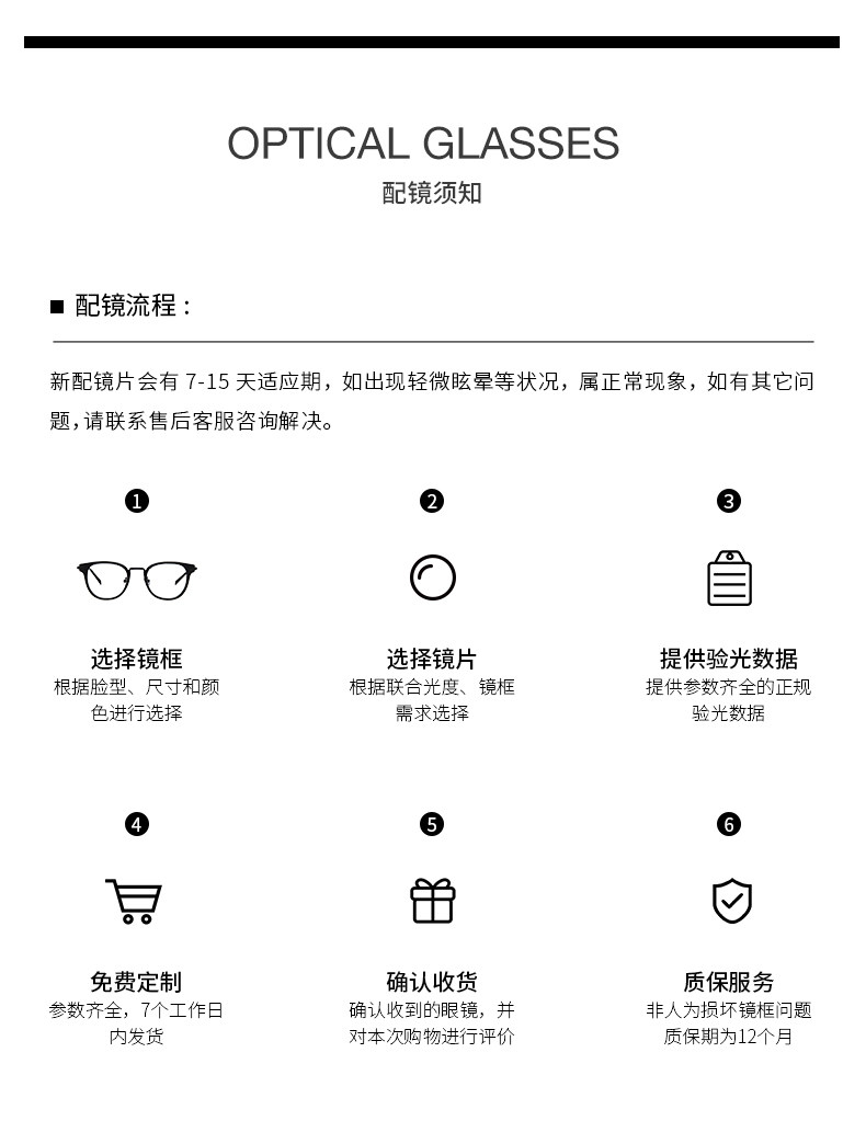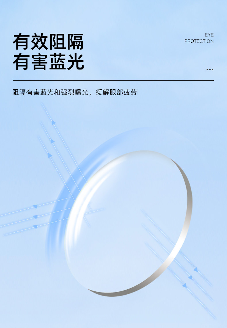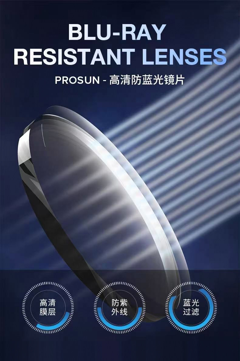 Lens refractive index Single frame,0 degree anti-blue light film,PROSUN anti-blue light film 1.60 (within combined luminosity of 600 degrees),PROSUN anti-blue light film 1.67 (within combined luminosity of 800 degrees),PROSUN anti-blue light lens 1.74 (more than medium height),Excellent visual 1.60 high definition (recommended within 600 degrees),Excellent visual 1.67 HD (recommended within 800 degrees),UVisual 1.74 HD (recommended for medium to high resolution),UVis 1.60 anti-blue light (recommended within 600 degrees),UVis 1.67 anti-blue light (recommended within 800 degrees),UV 1.74 anti-blue light (more than medium height),Frame + Excellent Visibility 1.60 (color-changing film, recommended within 600 degrees)