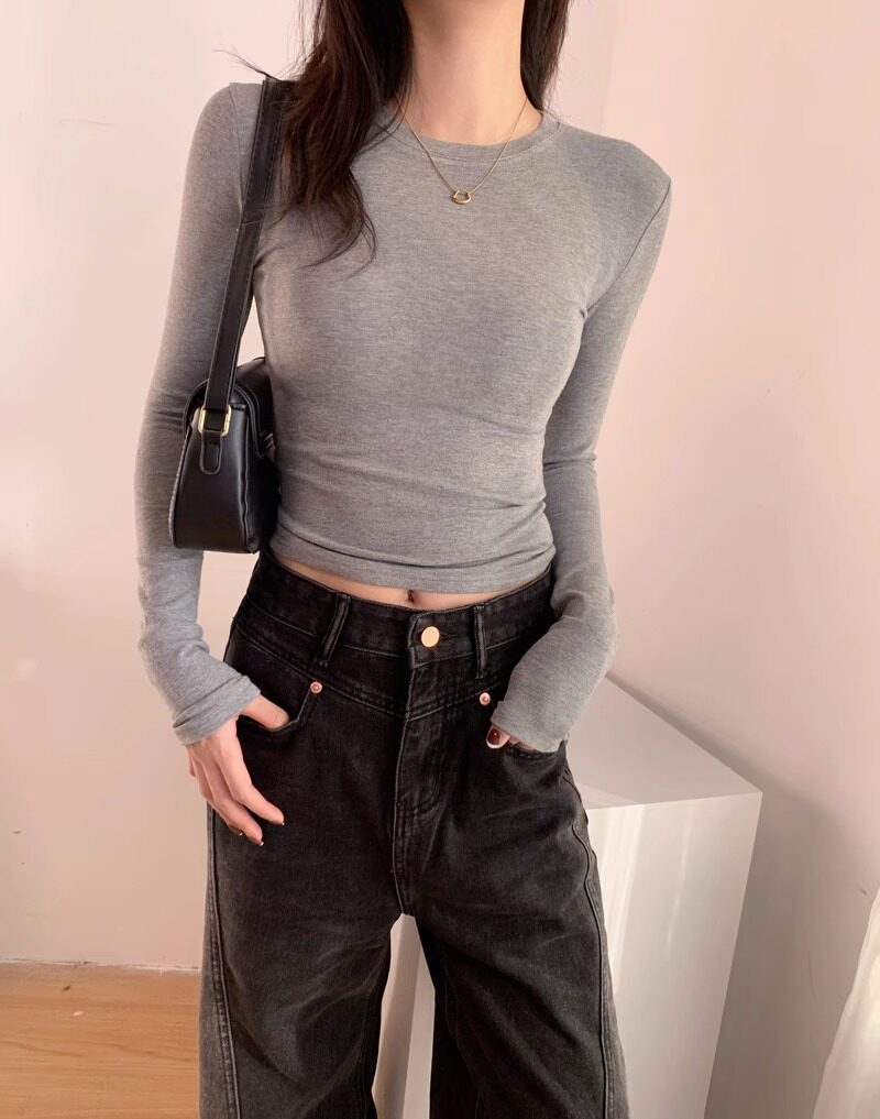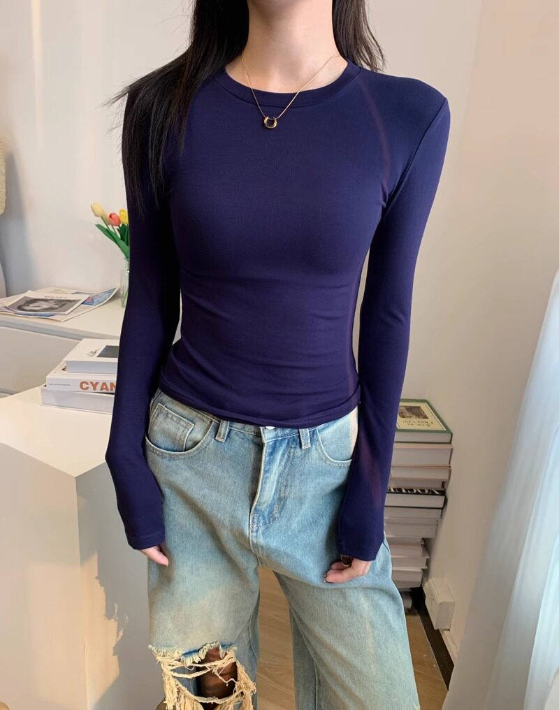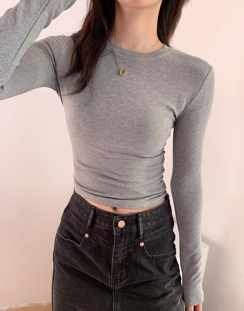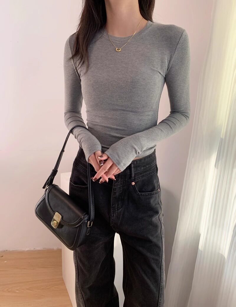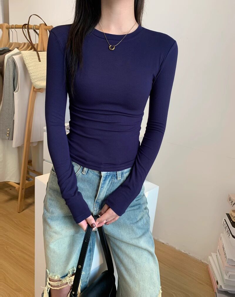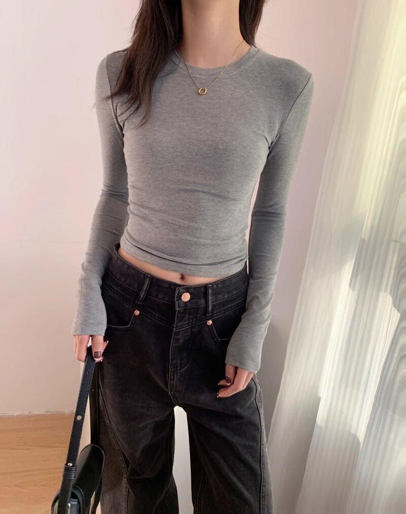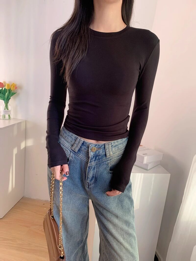 Trendy Hot Girl Long-Sleeve T-Shirt with Mask Design, Women's Autumn and Winter Slim-Fit Top with Cinched Waist, Regular Shoulders, Slimming Inner Layer, Round Neck Base Shirt
