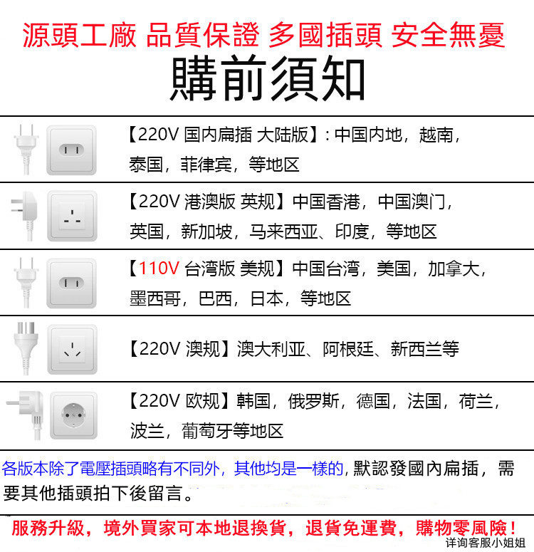 Plug type 220V Hong Kong and Macao version of Malaysian British regulations,110V Taiwan version,Domestic flat plug,European plug,Australian regulations