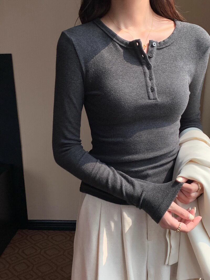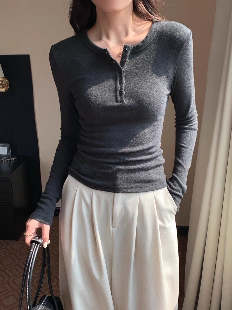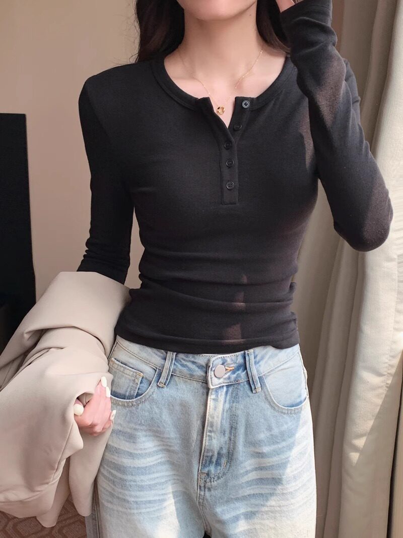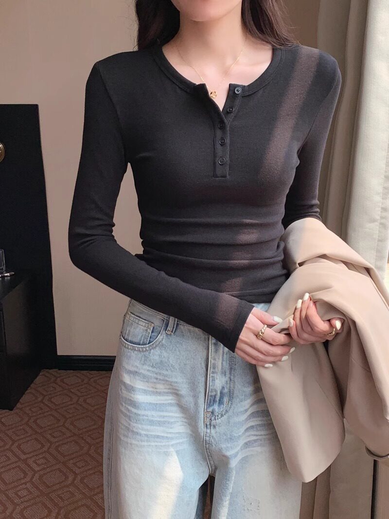 American Retro Sexy Half Open Collar Long-Sleeved T-Shirt for Women in Autumn and Winter with Unique Button Design Round Neck Knitted Top