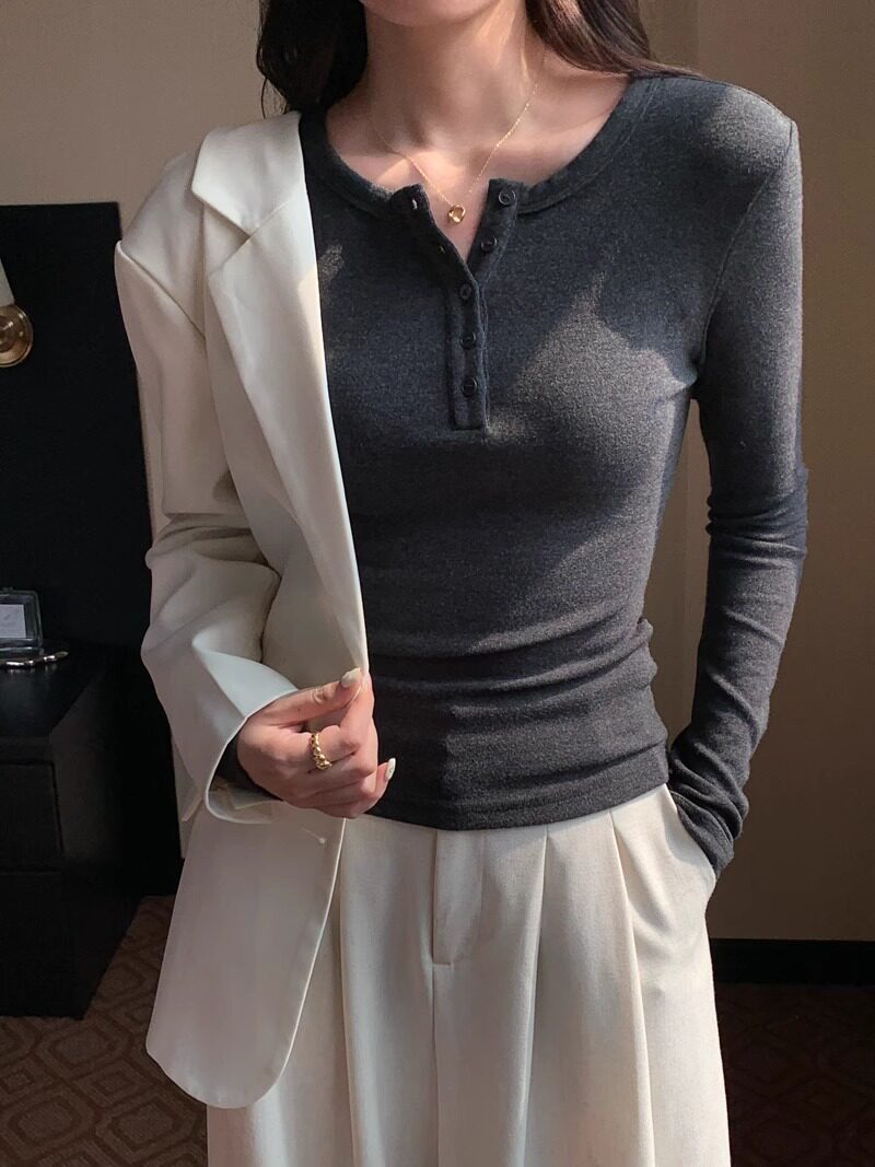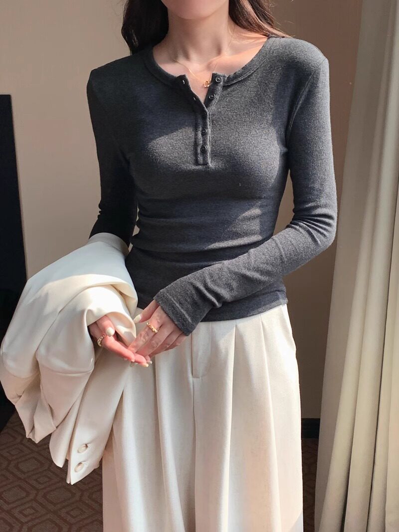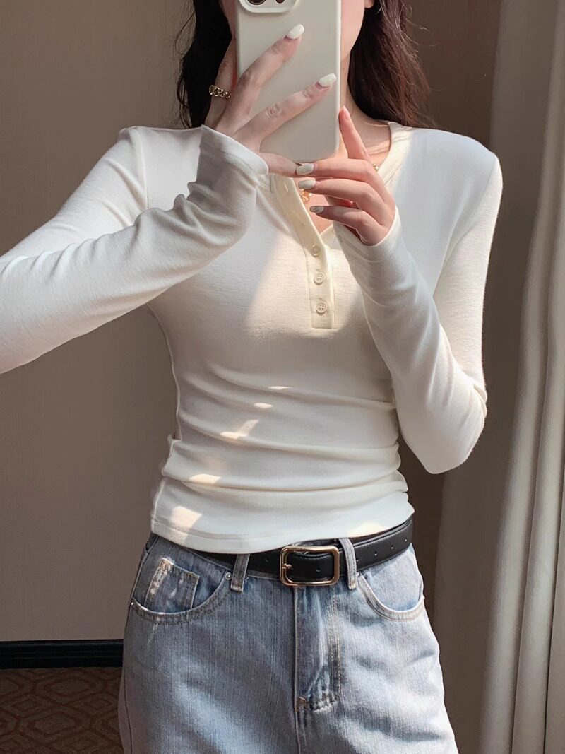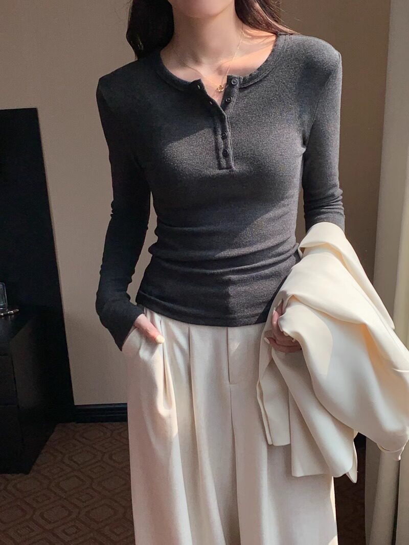 American Retro Sexy Half Open Collar Long-Sleeved T-Shirt for Women in Autumn and Winter with Unique Button Design Round Neck Knitted Top