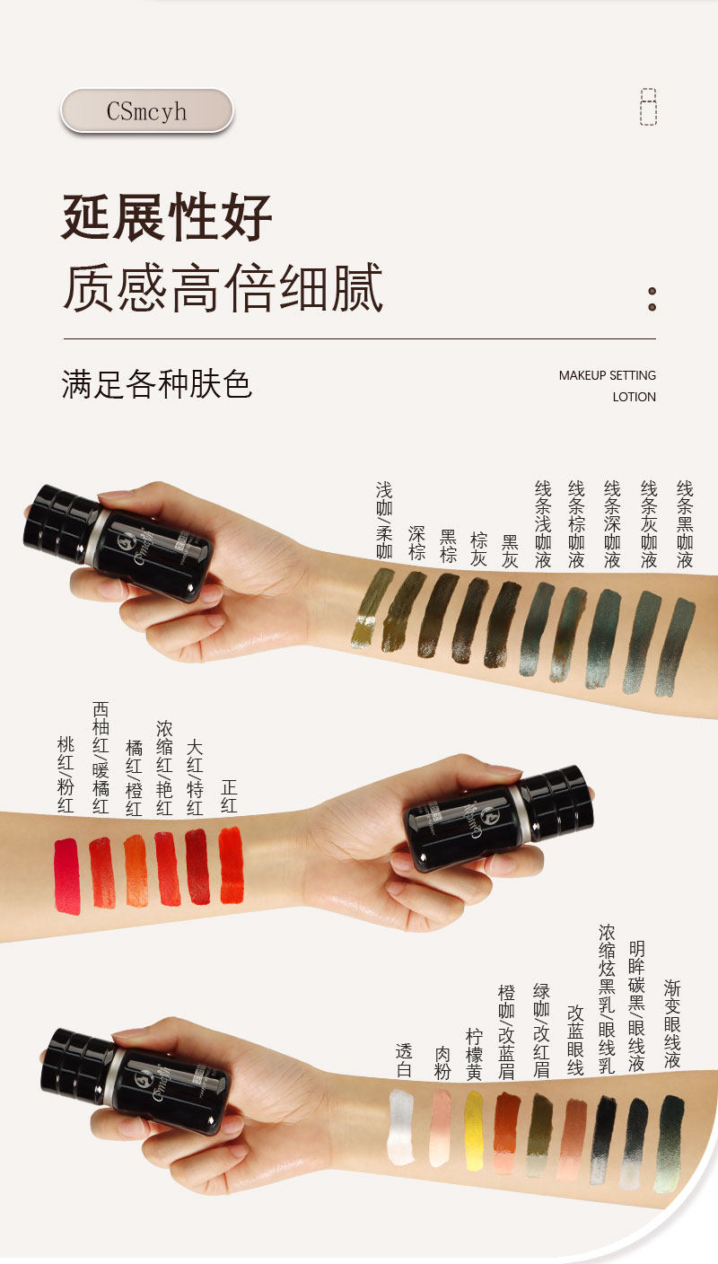 Color Classification Cs New Makeup Color: Black and Gray,Cs New Makeup Color: Black Brown,Cs New Makeup Color: Dark Brown,Cs New Makeup Color: Brown Gray,Cs New Color Setting Cream: Blush Pink,Cs New Makeup Color: True Red,Cs New Color-Lock Pigment: Crimson Red (Extra Red),Cs New Color Fixing Cream: Orange Red (Orange Red),Cs New Color Fixing Pigment: Concentrated Red (Crimson),Cs New Color Setting Cream: Peach Pink,Cs New Color Fixing Cream: Grapefruit Red (Warm Orange Red),Cs New Color Mousse: Light Coffee (Soft Coffee),Cs New Color Fixing Cream: Translucent White (White),Cs New Makeup Color: Lemon Yellow (Bright Yellow),Cs New Color Fixing Cream: Correcting Blue Eyeliner,Cs New Color Fixing Liquid: Gradient Eyeliner,Cs New Color Fixing Eyeliner: Bright Eyes Carbon Black Eyeliner,Cs New Color Locking Eyeliner: Intense Black Eyeliner Cream,Cs New Color Correcting Pigment: Orange-Brown to Blue Eyebrow,Cs New Color Correcting Pigment: Green Coffee to Red Eyebrow,Cs New Color Fixing Cream: Line Black Coffee Liquid,Cs New Color Fixing Cream: Line Gray Coffee Liquid,Cs New Color Fixing Cream: Light Brown Liquid Eyeliner,Cs New Color Fixing Cream: Line Dark Coffee Liquid,Cs New Color Setting Cream: Line Brown Liquid