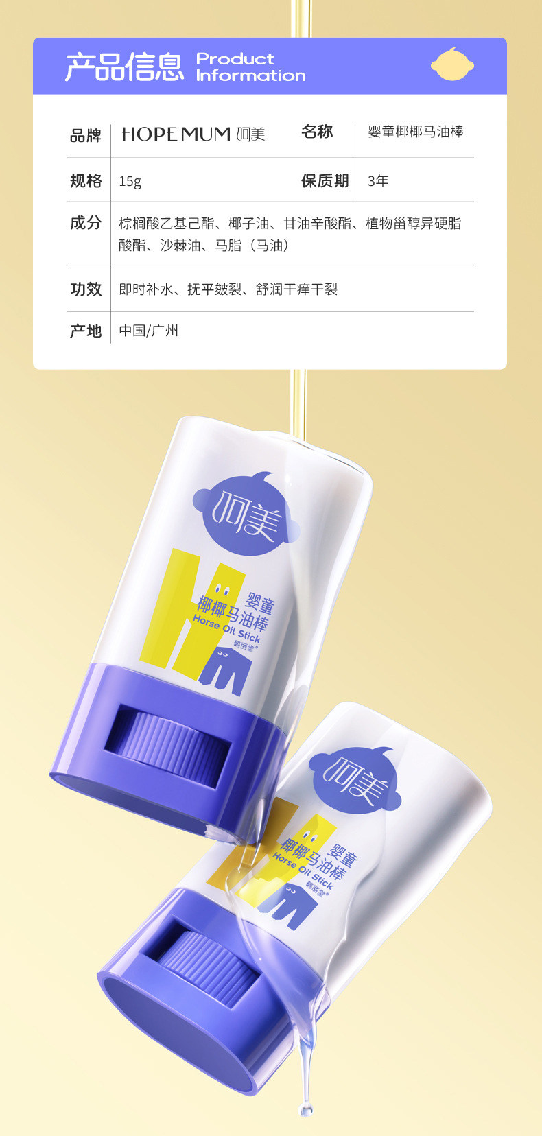 Baby Coconut Horse Oil Stick for Dry Skin, Hydrating, Moisturizing, Anti-Cracking, Special for Babies, Genuine Product for Autumn and Winter