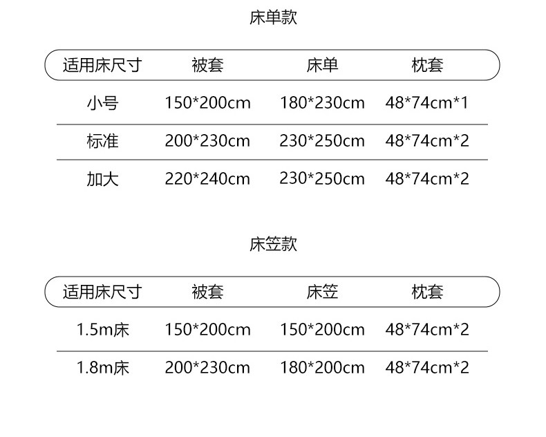 Applicable bed size Three-piece set for student dormitory suitable for 150x200cm quilt,1.2m three-piece bed sheet set, bed sheet 180x230, quilt cover 150x200,1.5 meters sheet four-piece set bed sheet 230x250 quilt cover 200x230,1.8 meters bed sheet four-piece set bed sheet 230x250 quilt cover 200x230,2.0m bed sheet four-piece set bed sheet 230x250 quilt cover 220x240,1.5 meters 4-piece set of bed cover 150x200 quilt cover 200x230,1.8 meters 4-piece set of bed cover 180x200 quilt cover 200x230