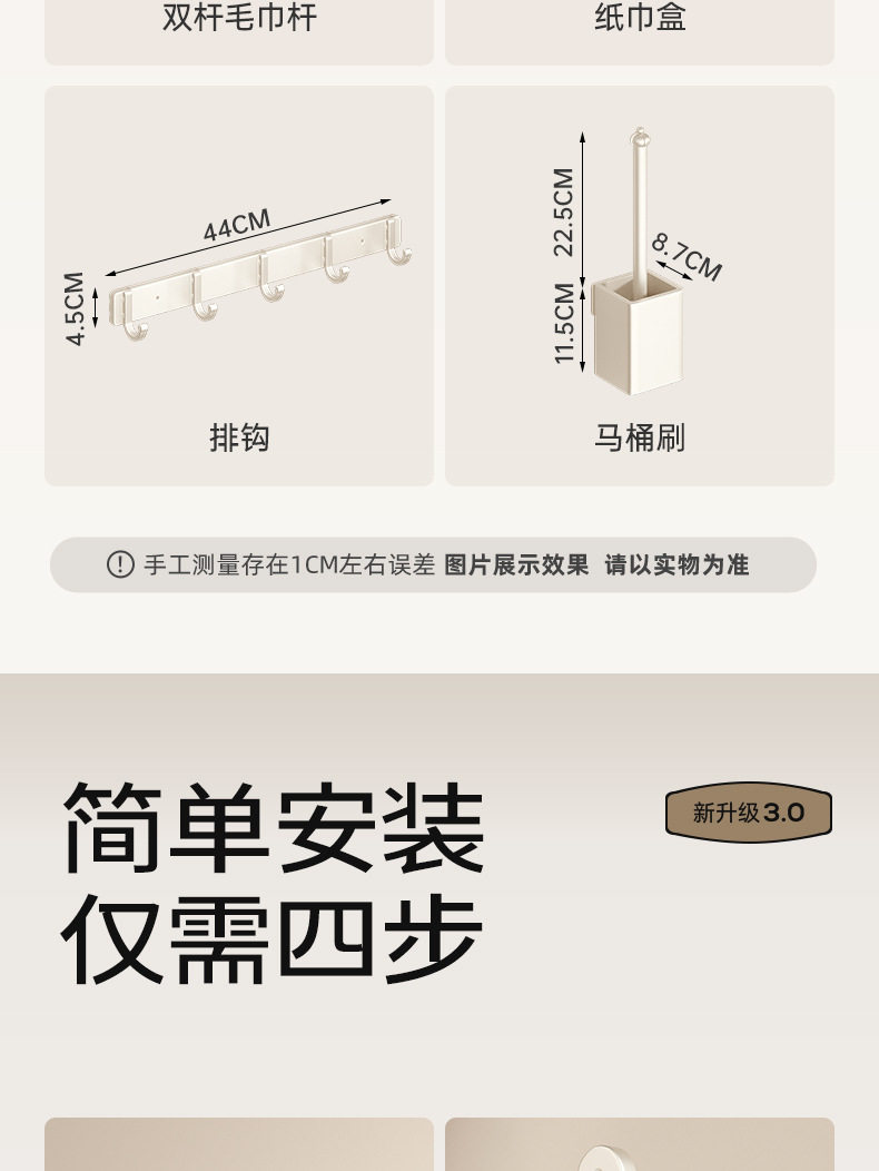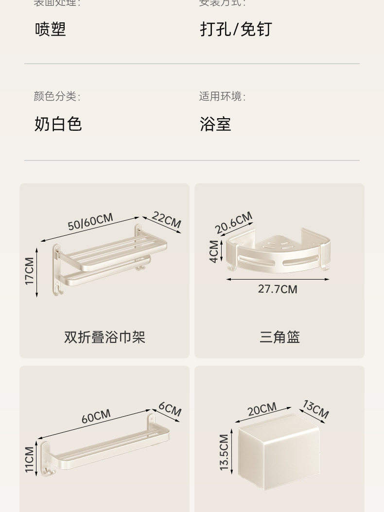 Color Classification Cream White Classic 50cm,Cream White Classic 60cm,Cream White Towel Bar,Cream White Double Layer Tripod,Cream White Five-Row Hook,Cream White Toilet Brush,Cream White Tissue Box,Classic Two-Piece Set,Classic Three-Piece Set,Classic Four-Piece Set,Classic Five-Piece Set,Classic Six-Piece Set