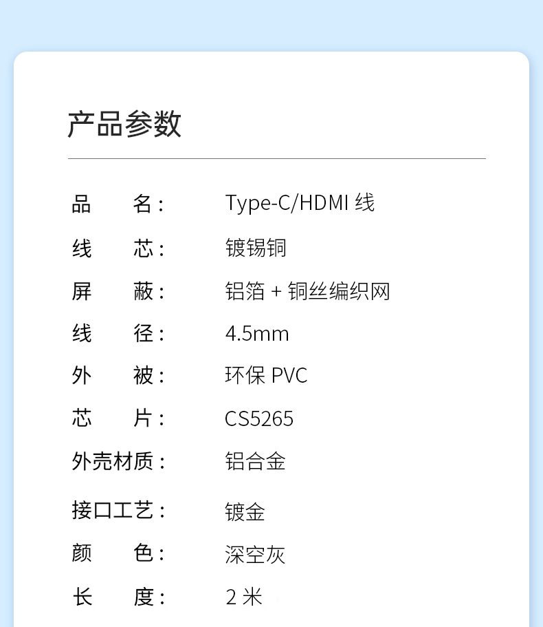 Color Classification 2m●Type-C to HDMI [4K30Hz] Gold-Plated Interface★Pvc Wire,2m●Type-C to HDMI [4K60Hz] Gold-Plated Interface★Pvc Wire,2m●Type-C to HDMI [4K30Hz] Pvc Cable,2m●Type-C to HDMI [4K60Hz] Pvc Cable,2m ● Type-C to HDMI [4K30Hz] Braided Cable,2m●Type-C to HDMI [4K60Hz] Braided Cable,1m●Newly Upgraded★Type-C to HDMI [4K30Hz] Deep Gray★Braided Wire,2m●Newly Upgraded★Type-C to HDMI [4K30Hz] Deep Gray★Braided Wire,1m●Newly Upgraded★Type-C to HDMI [4K60Hz] Deep Gray★Braided Wire,2m●Newly Upgraded★Type-C to HDMI [4K60Hz] Deep Gray★Braided Wire