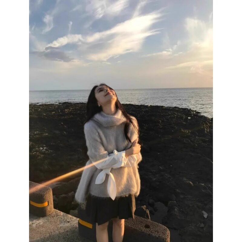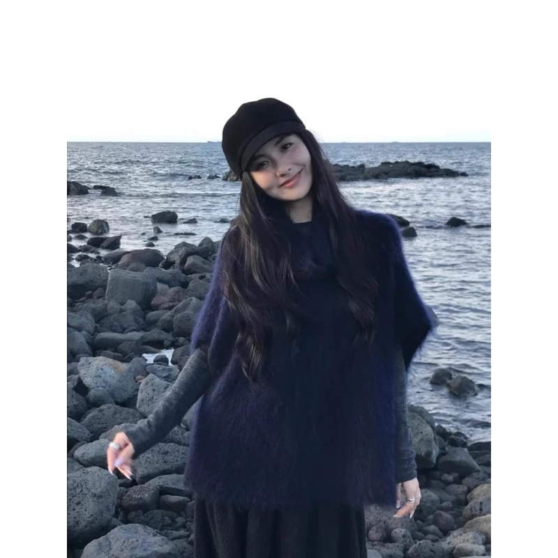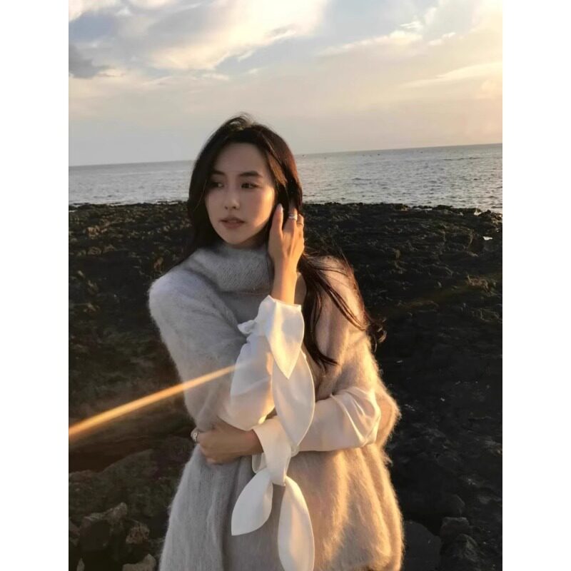 Mohair Turtleneck Knitted Vest for Women, Autumn and Winter Layering Sleeveless Loose Outerwear Cape Shawl Top