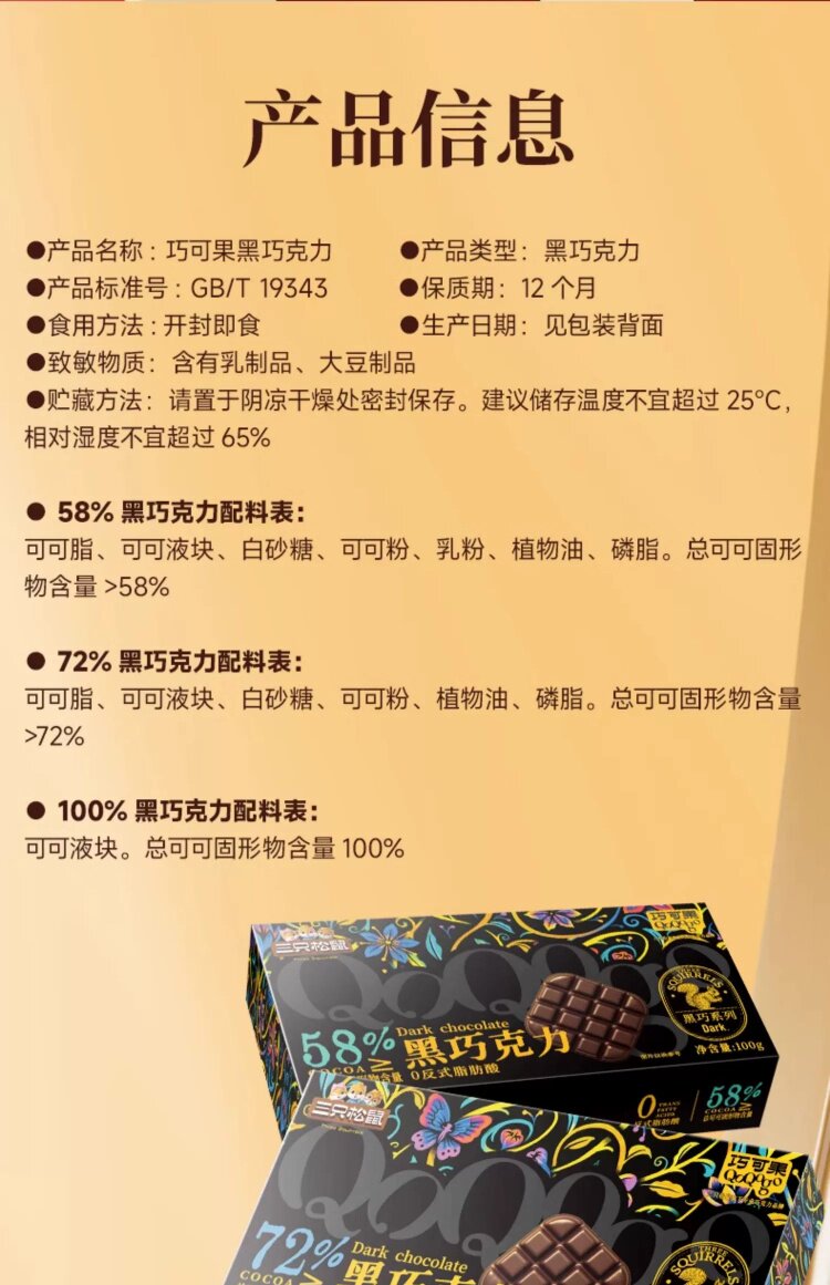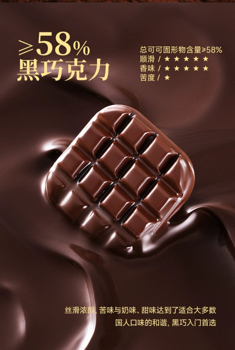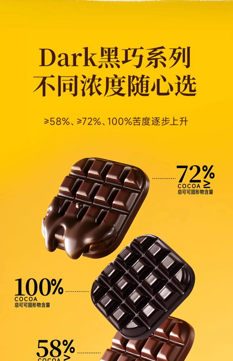 Food Taste [75 Packs in Total]58%, 72%, 100% Each 1 Box,[150 Packs in Total]2 Boxes Each for 58%, 72% and 100%,[Slightly Sweet_25 Packs in Total]58% Dark Chocolate 100g*1,[Slightly Sweet_50 Packs in Total]58% Dark Chocolate 100g*2,[Slightly Sweet_100 Packs in Total]58% Dark Chocolate 100g*4,[Bitter First and Sweet Later_25 Packs in Total]72% Dark Chocolate 100g*1,[Bitter First and Sweet Later_50 Packs in Total]72% Dark Chocolate 100g*2,[Bitter First and Sweet Later_100 Packs in Total]72% Dark Chocolate 100g*4,[Self-Discipline Is Hard_0 Added Sucrose, 25 Packs in Total]100% Dark Chocolate 100g*1,[Self-Discipline Is Hard_0 Added Sucrose, 50 Packs in Total]100% Dark Chocolate 100g*2,[Self-Discipline Is Hard_0 Added Sucrose, 100 Packs in Total]100% Dark Chocolate 100g*4