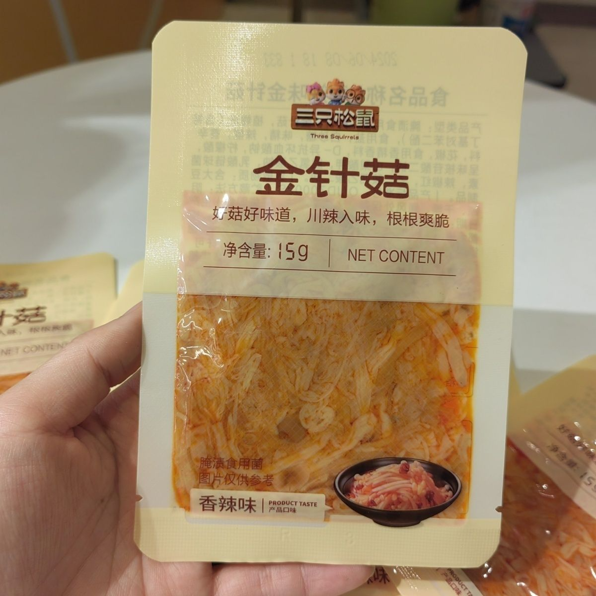 Three Squirrels Spicy Enoki Mushrooms 15G/Pack Cold Spicy Hot and Sour Cravings Dormitory Snacks for Drinking