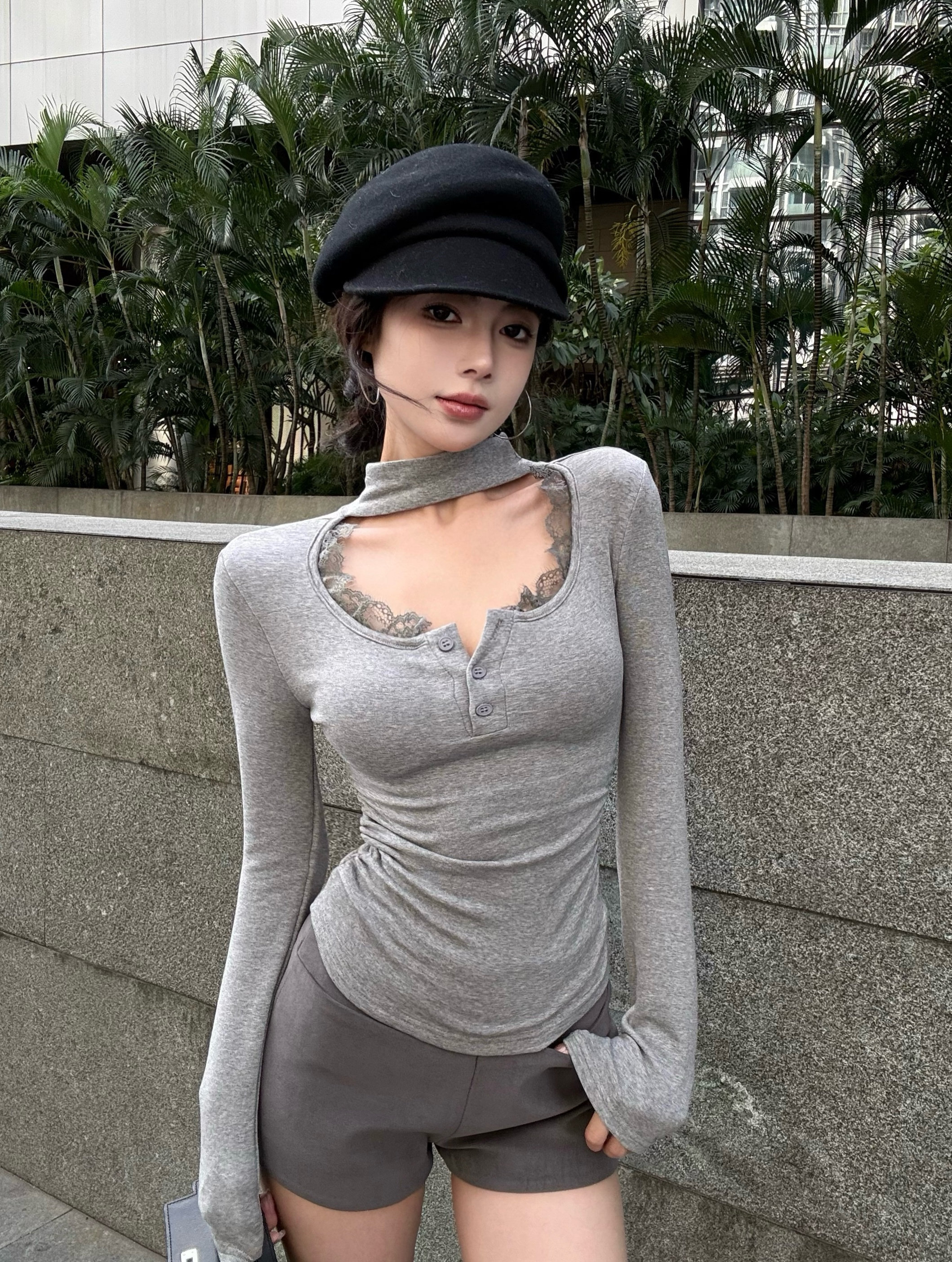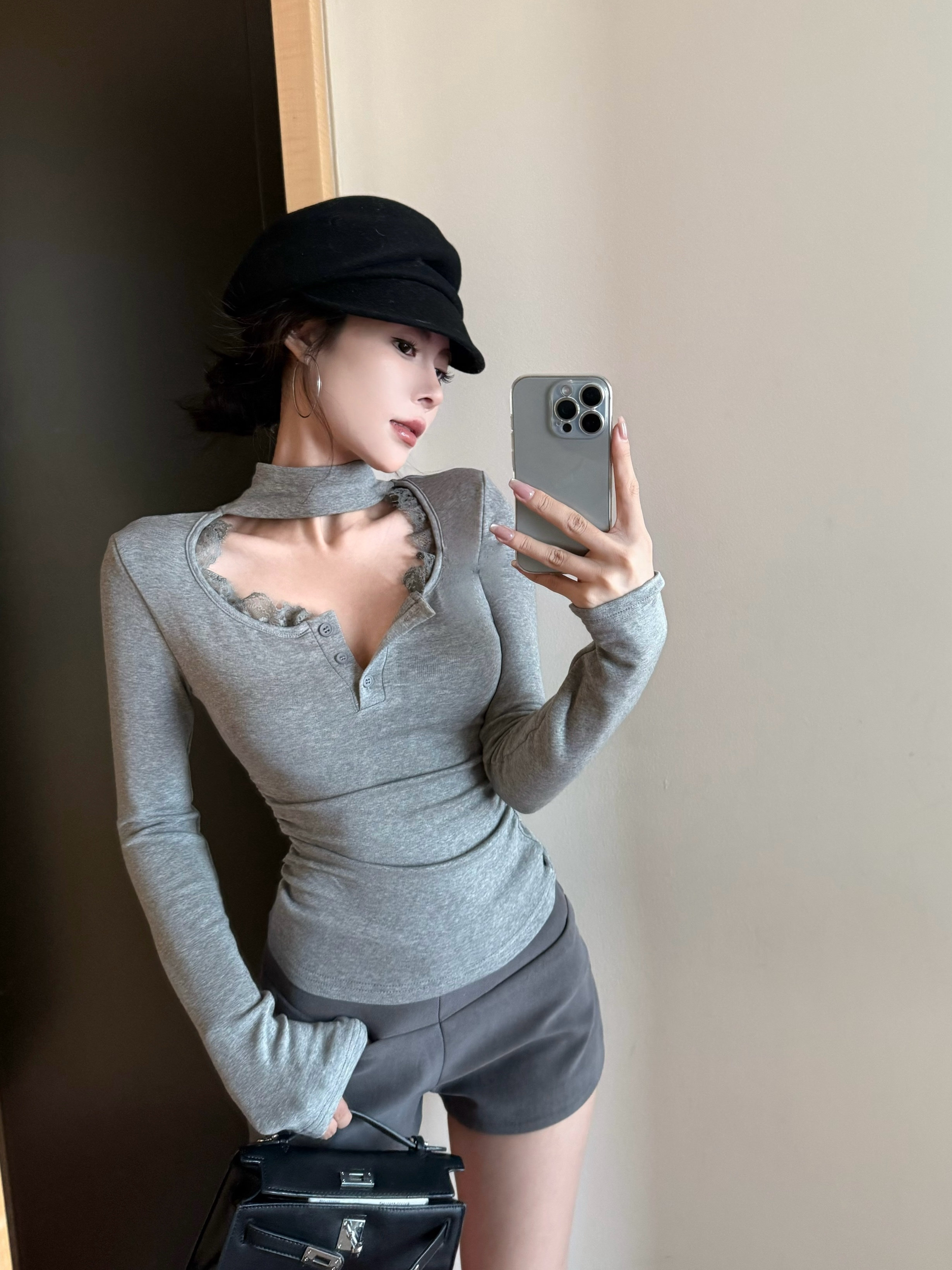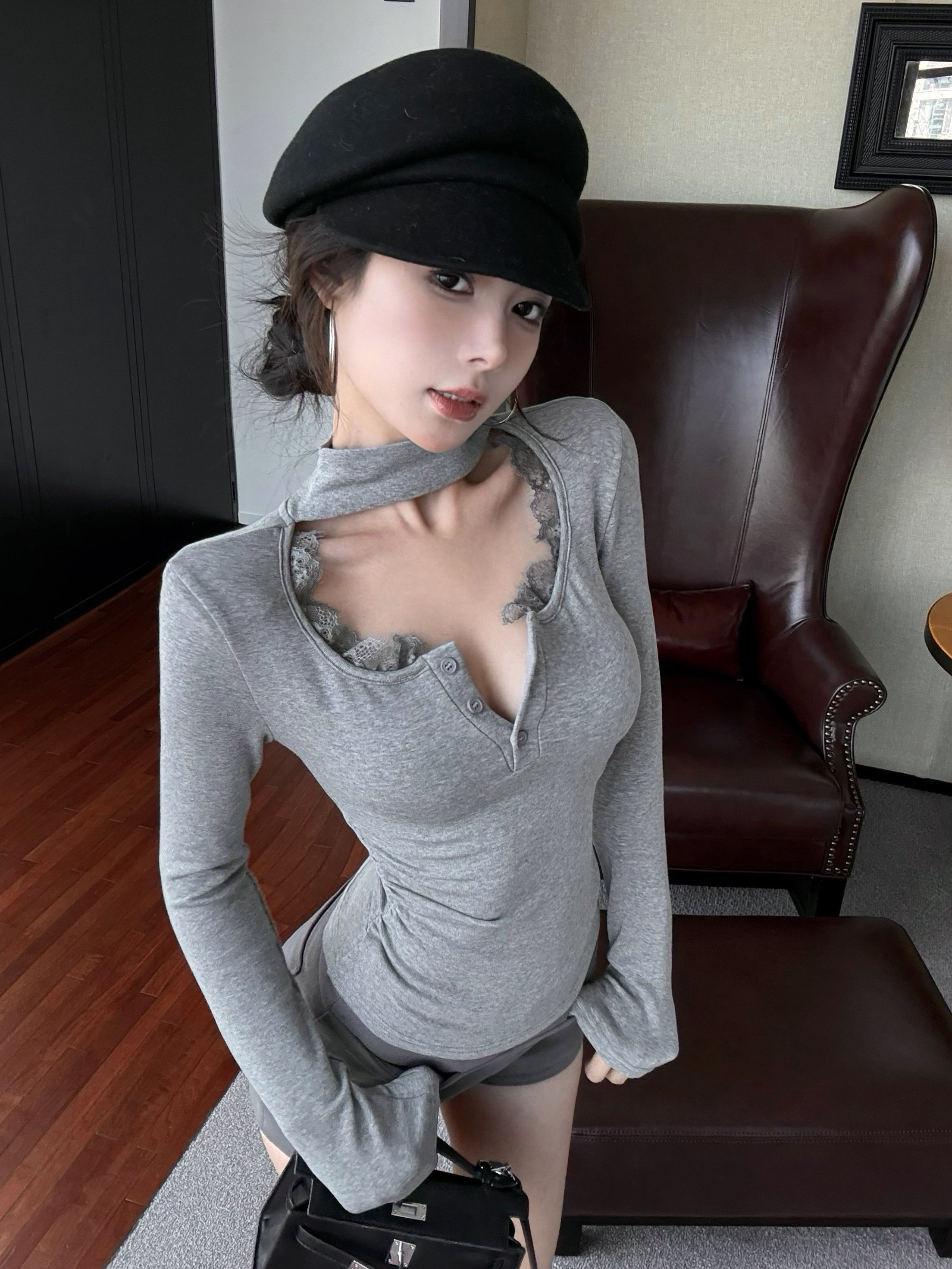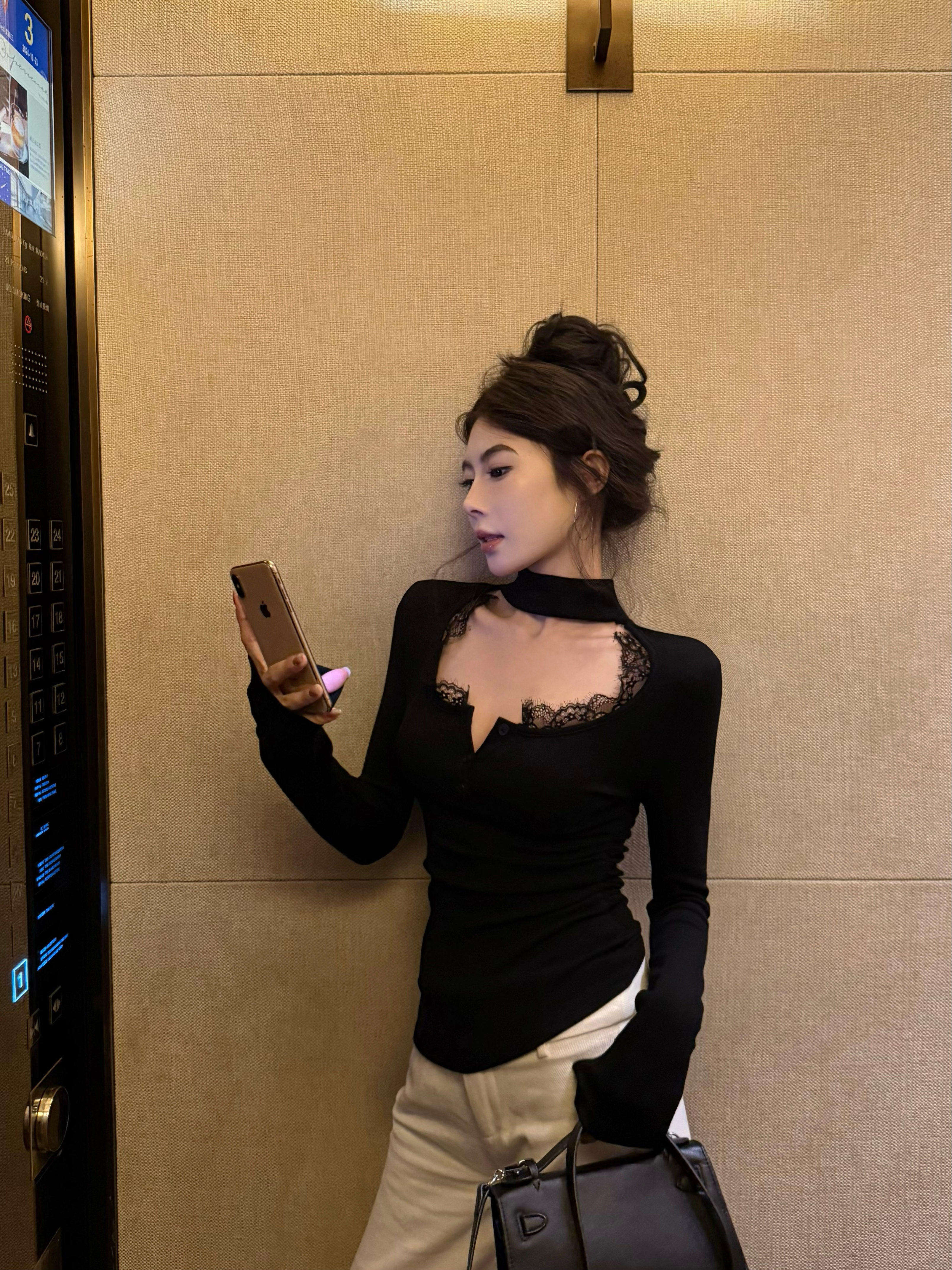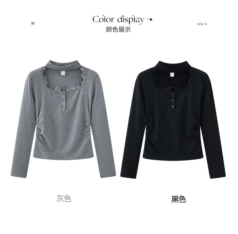 Pure Desire Halter Lace Patchwork U-Neck Long Sleeve Fleece-Lined Base Shirt for Women, New Spring and Autumn Slim Fit Inner Top