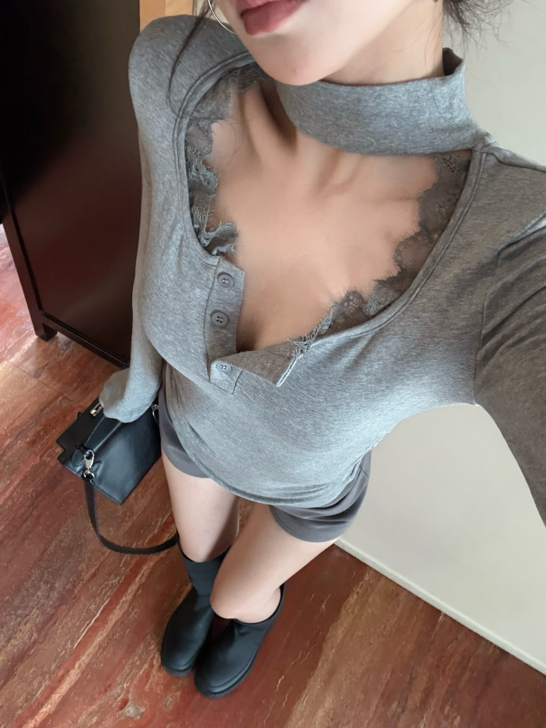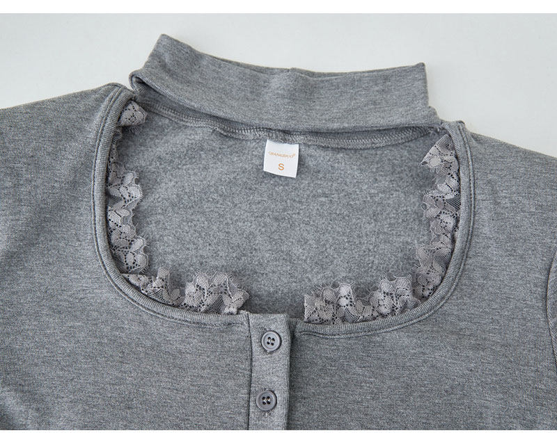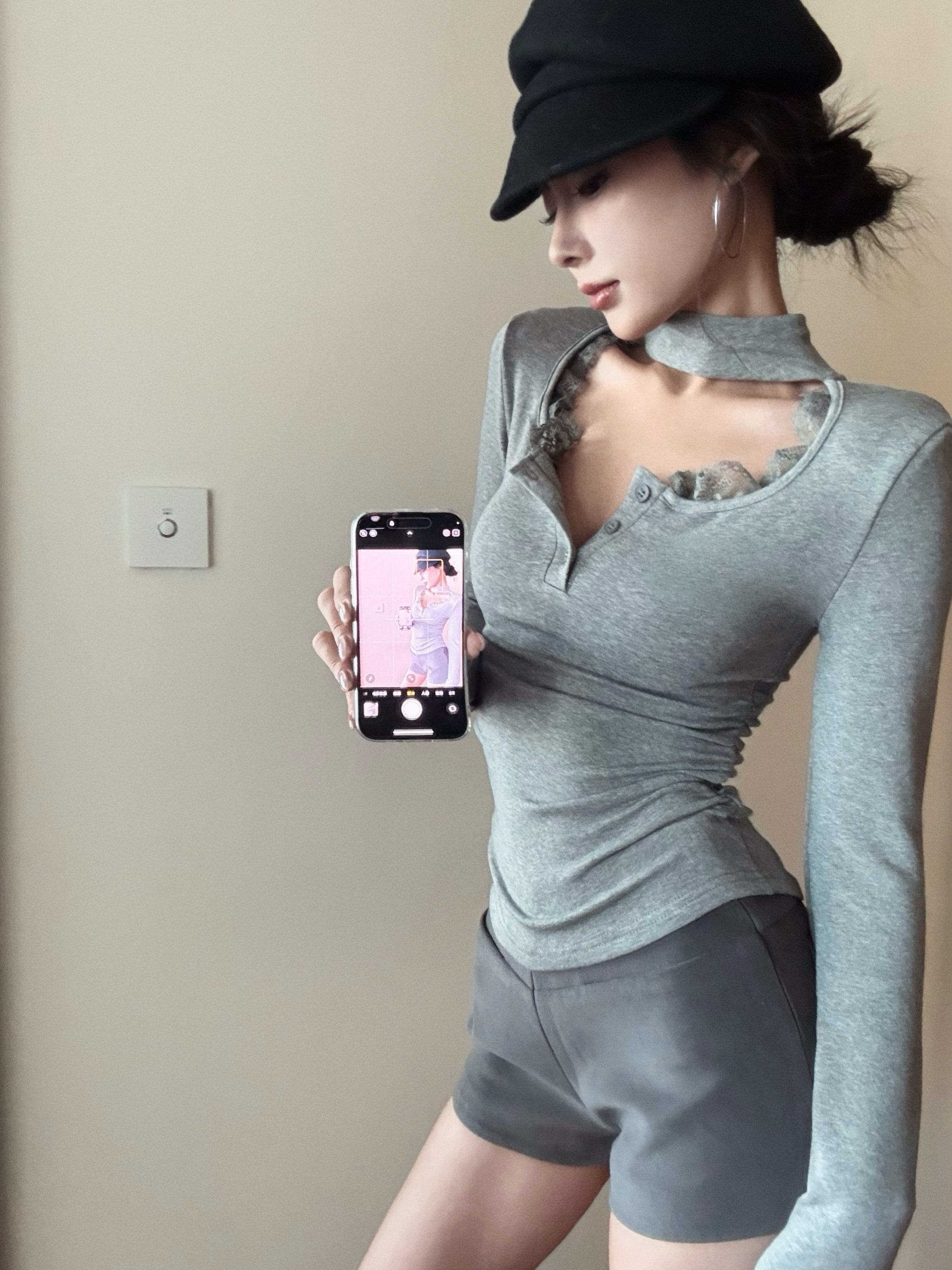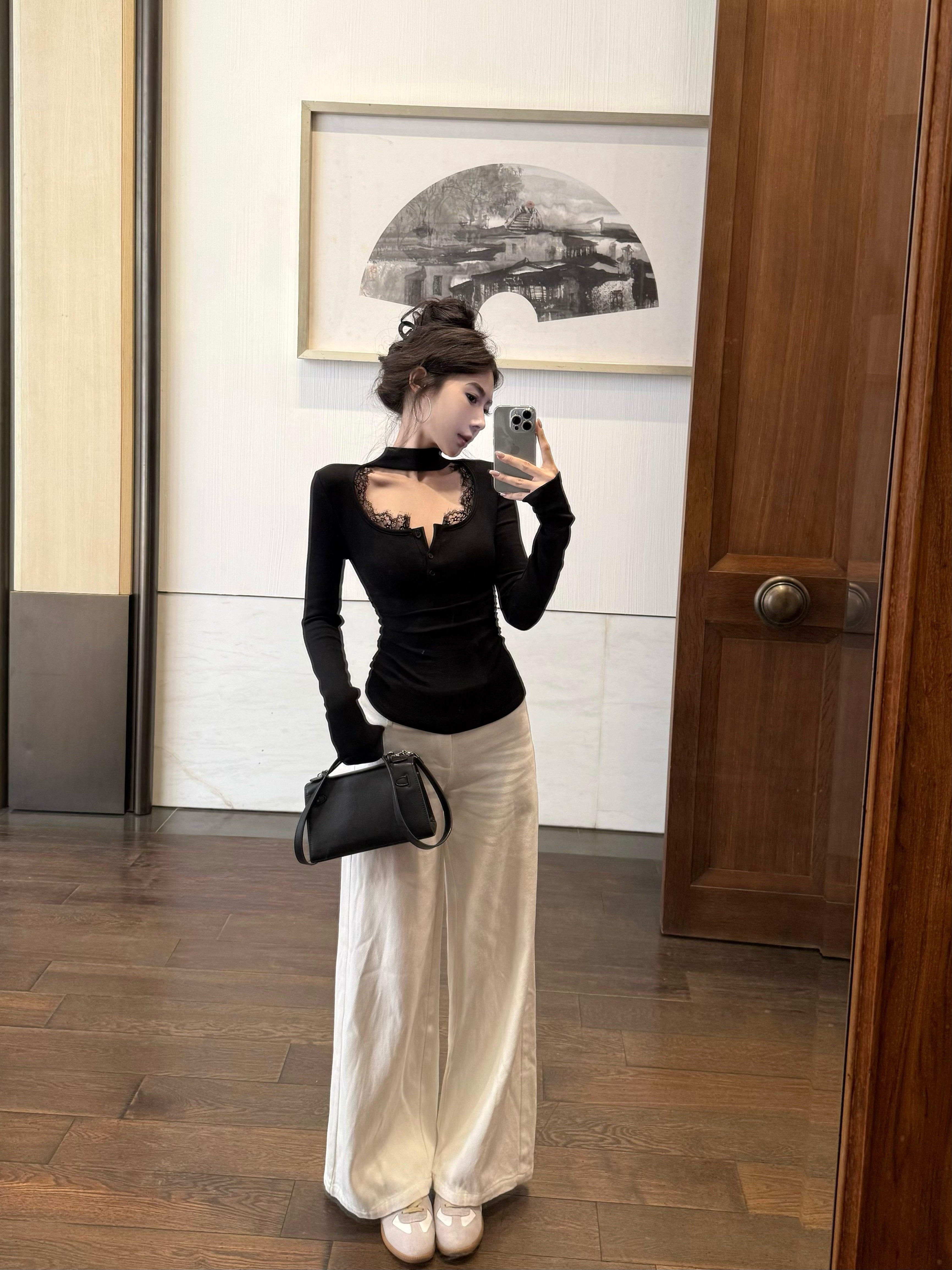 Pure Desire Halter Lace Patchwork U-Neck Long Sleeve Fleece-Lined Base Shirt for Women, New Spring and Autumn Slim Fit Inner Top