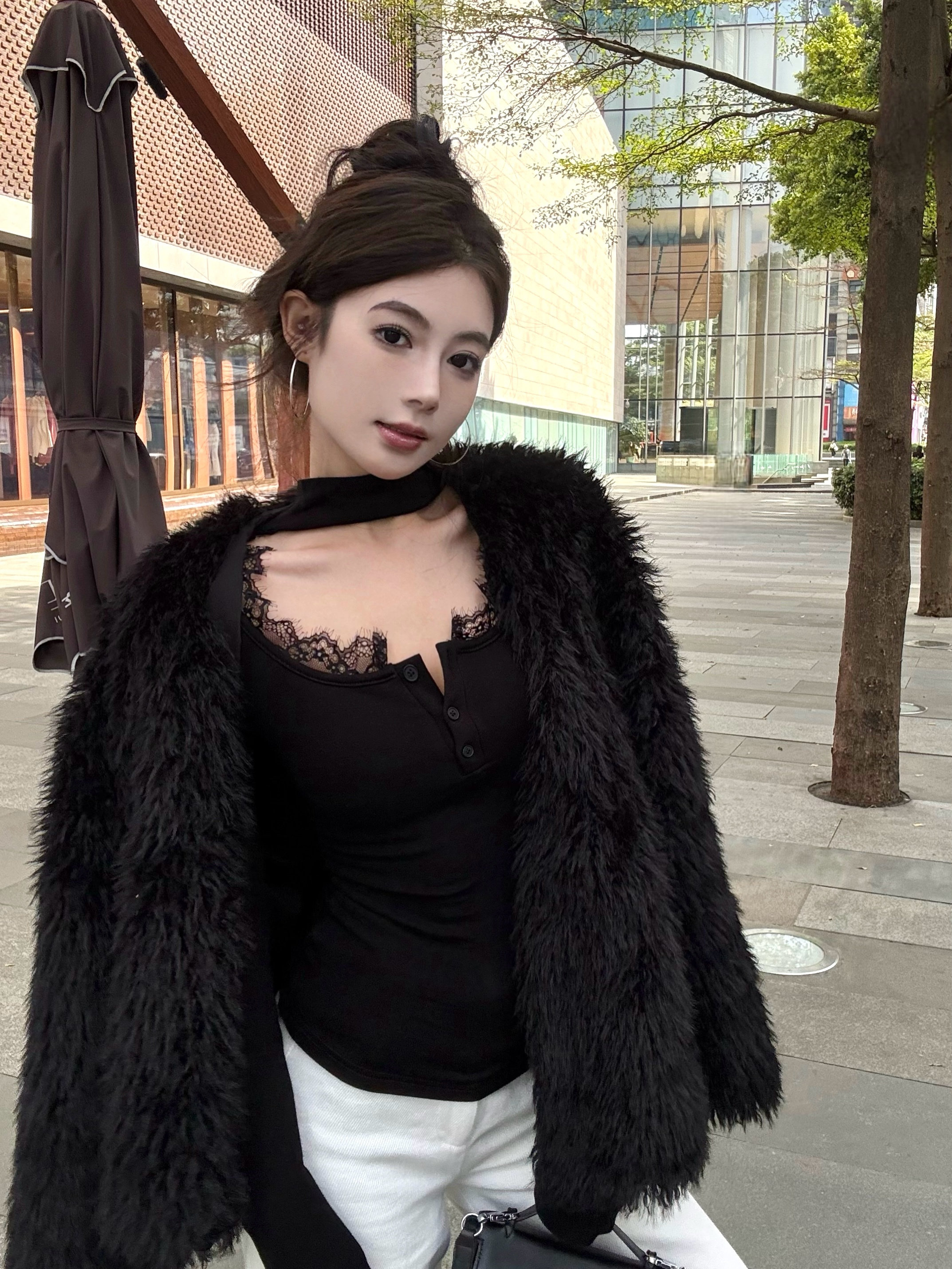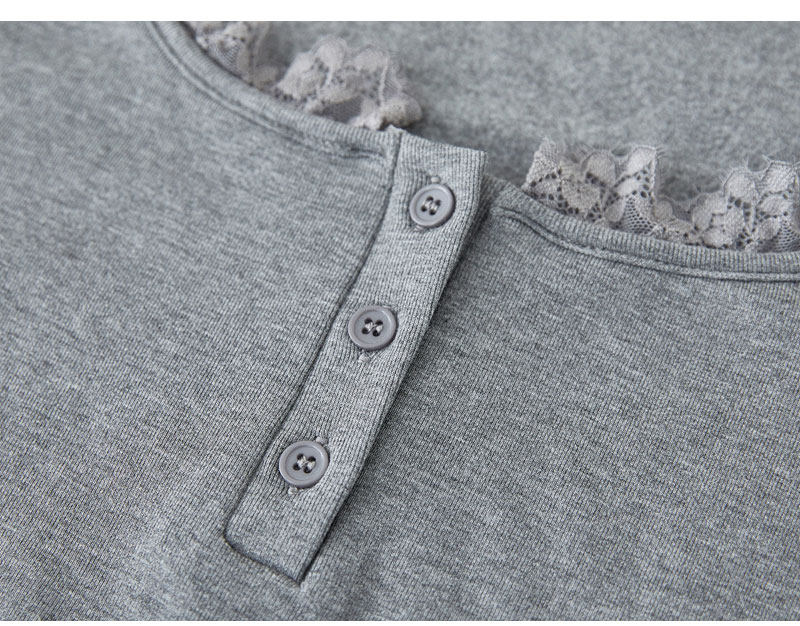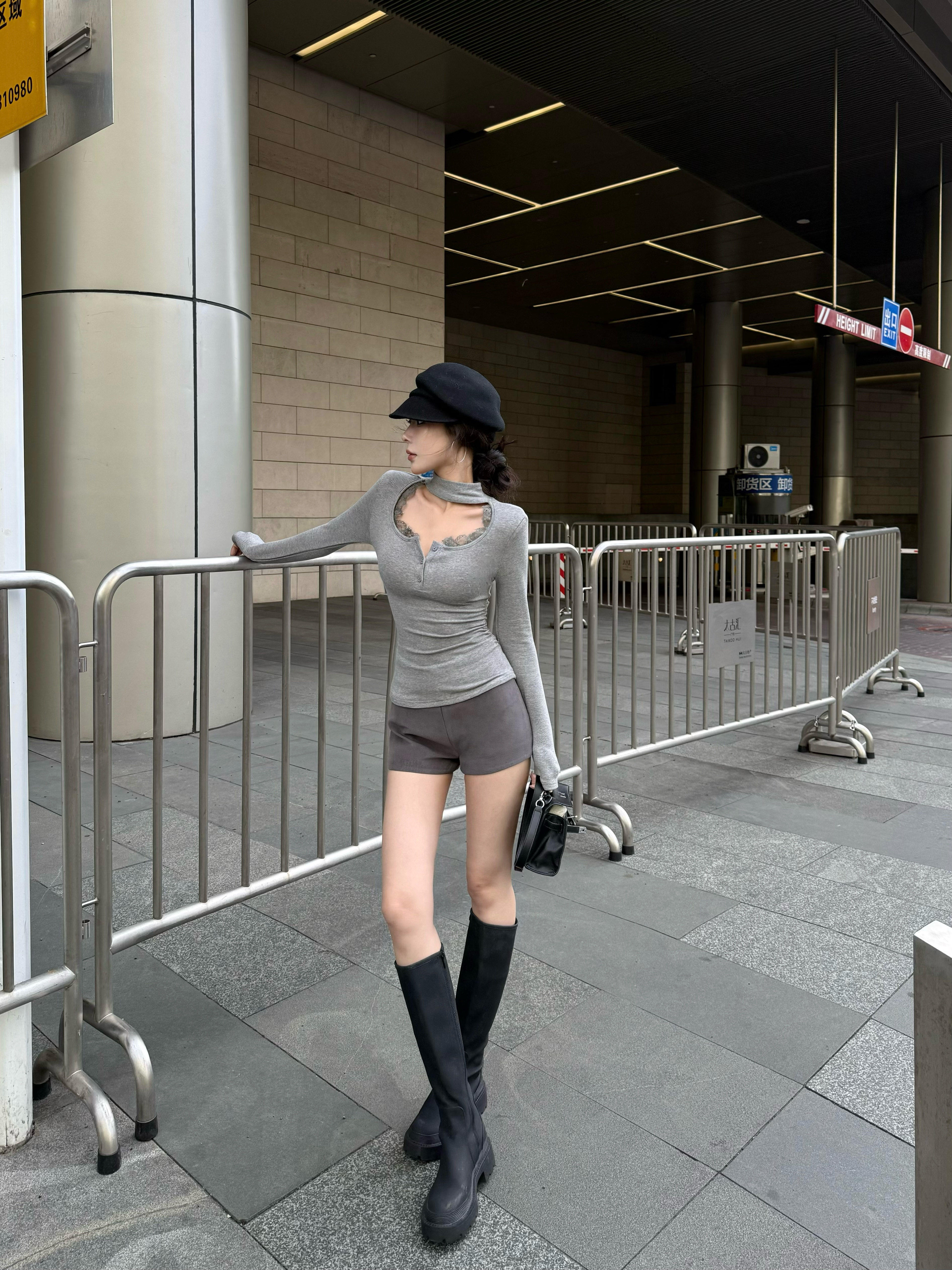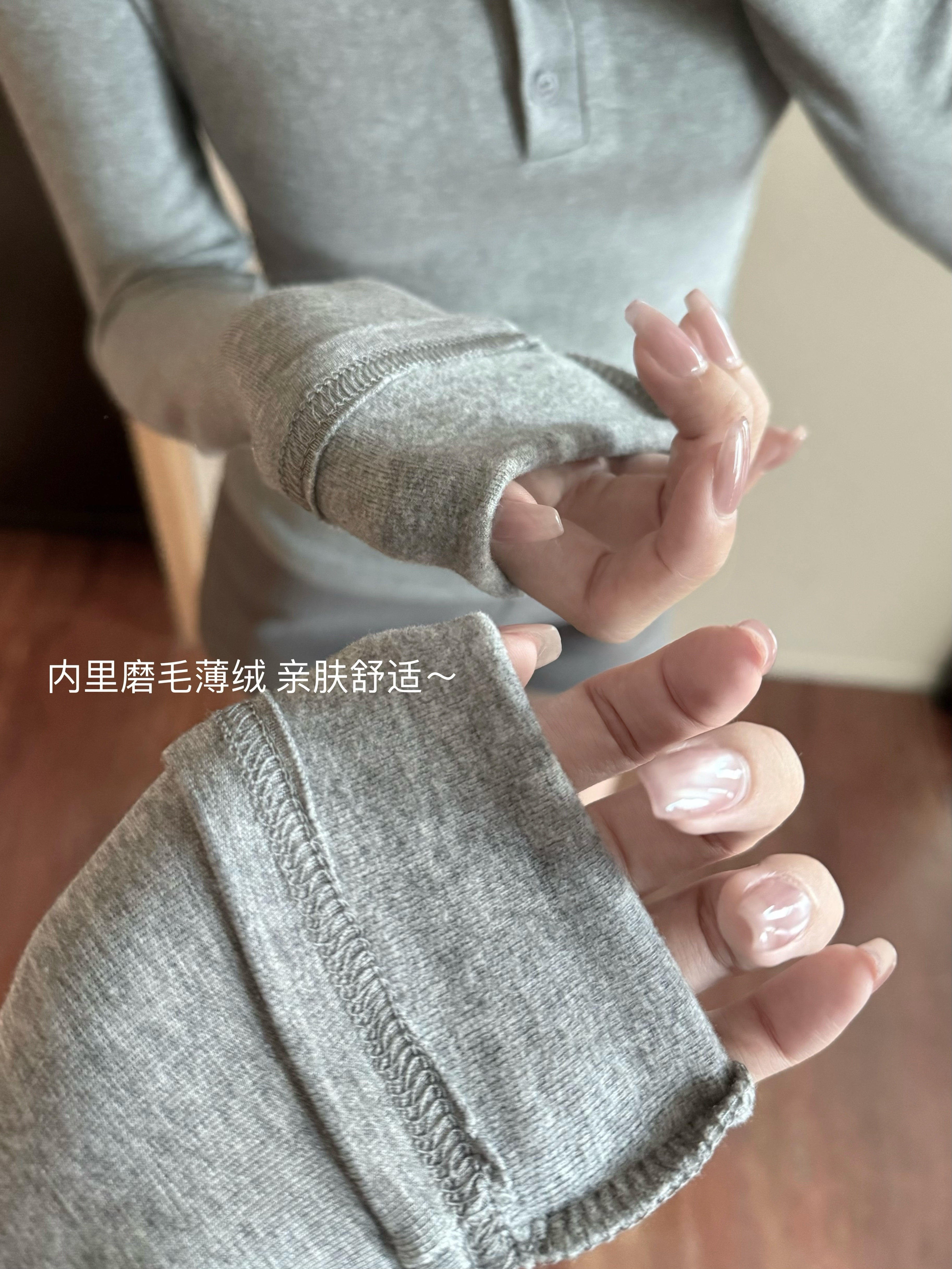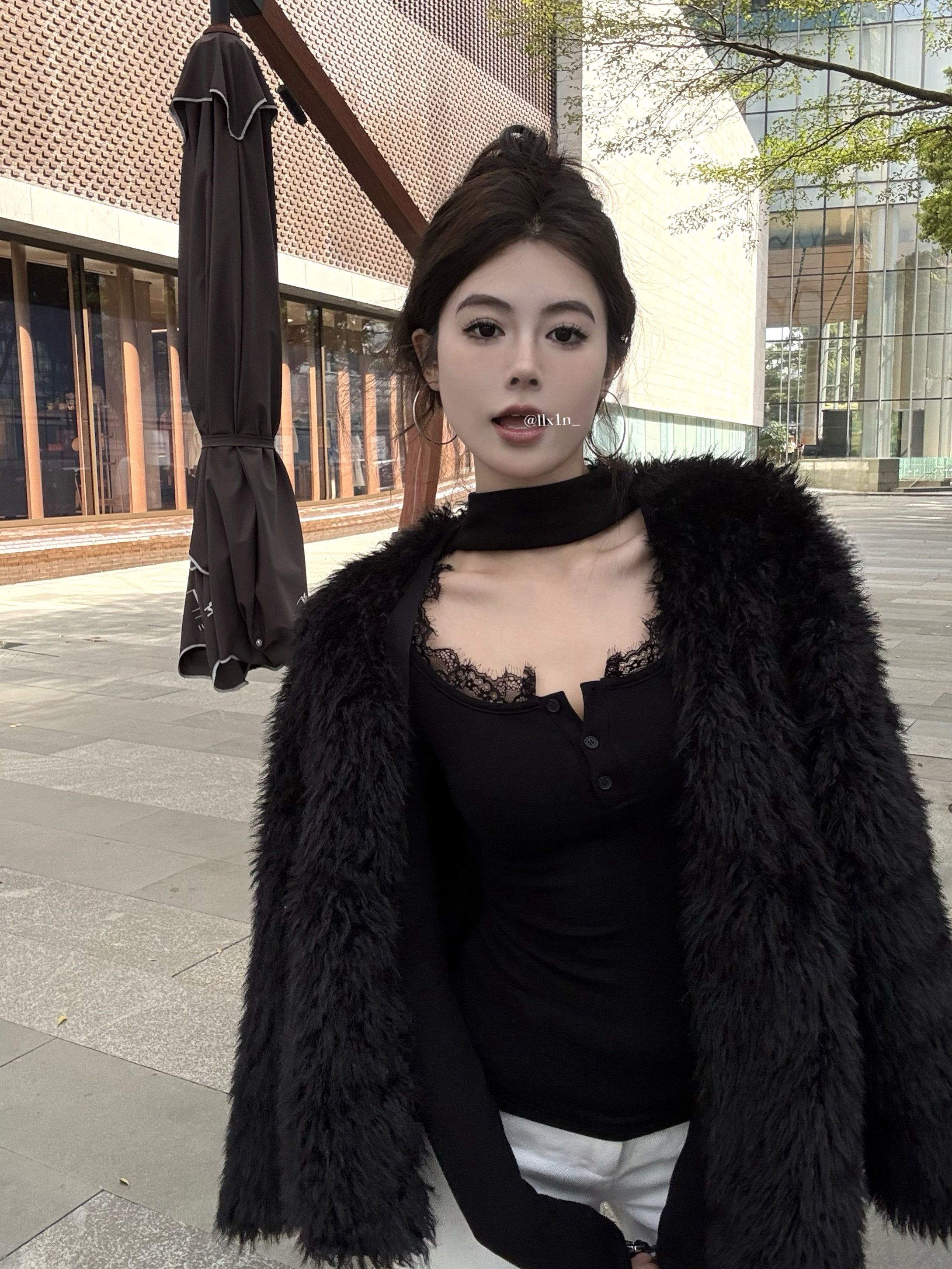Pure Desire Halter Lace Patchwork U-Neck Long Sleeve Fleece-Lined Base Shirt for Women, New Spring and Autumn Slim Fit Inner Top