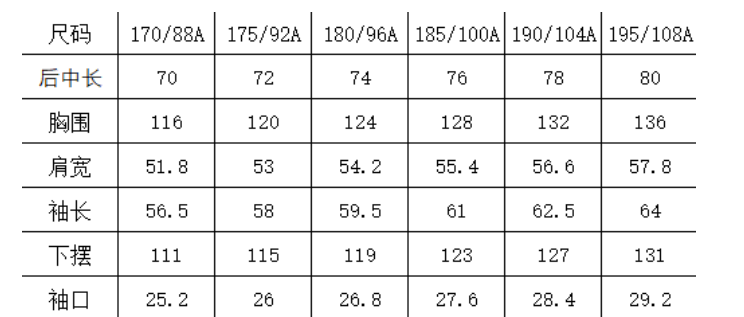 China(cm) 72-76 76-81 81-87 87-93 93-98