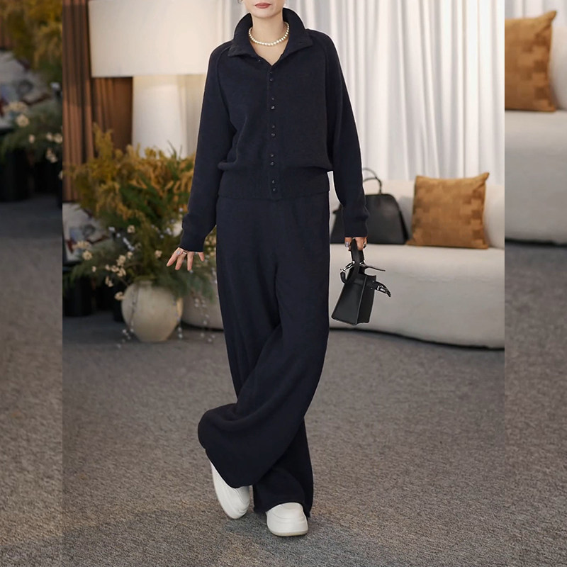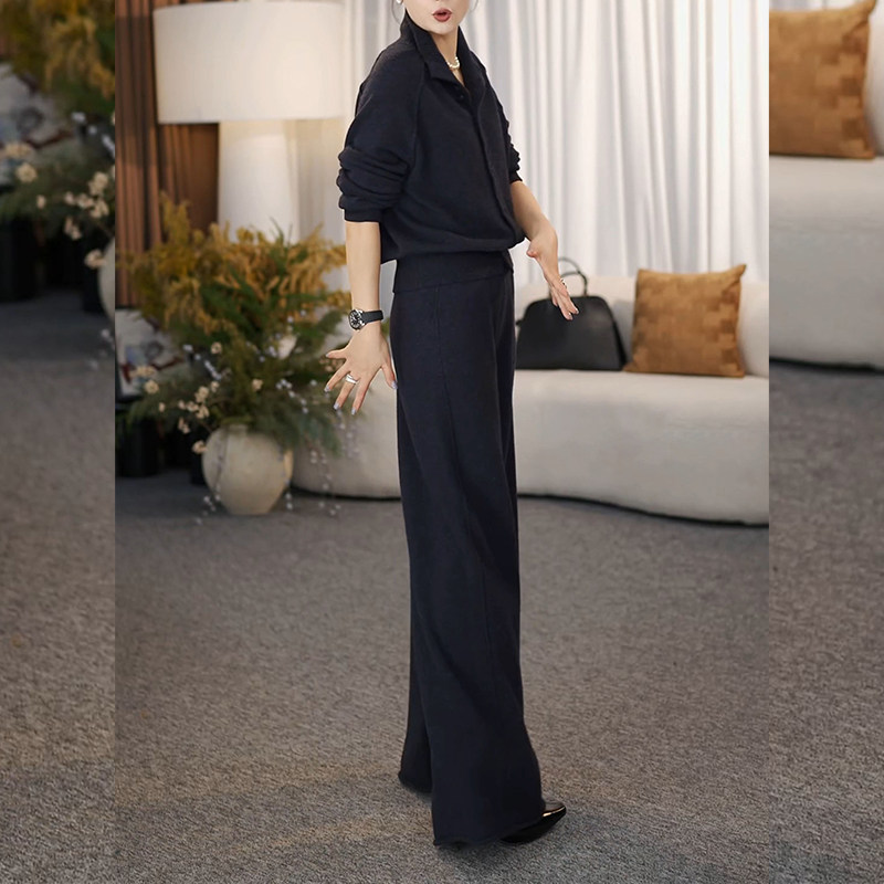 2026 Spring Western style knitwear suit plus size women's fat MM single breasted long sleeve casual slim trousers two-piece set