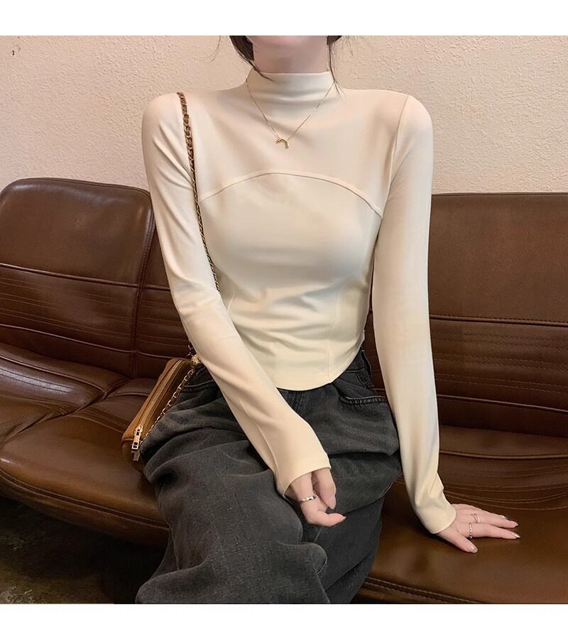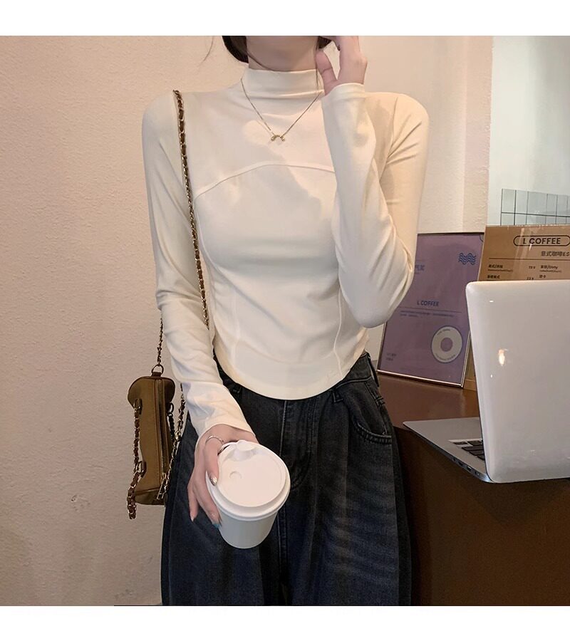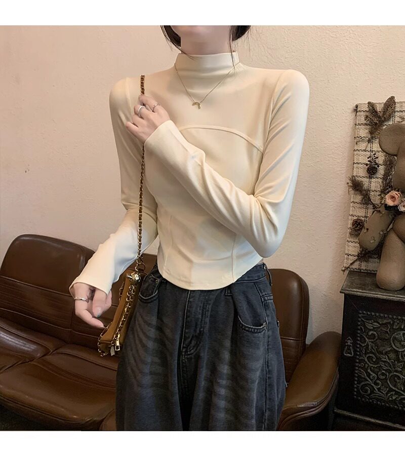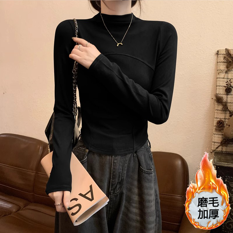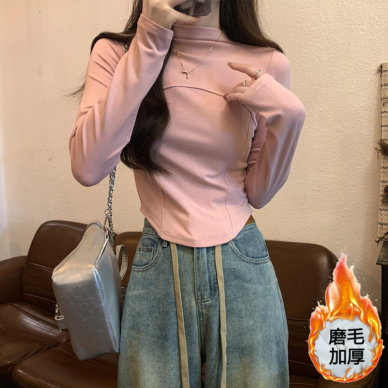 Half-High Collar Fishbone Stitching Brushed Fleece-Lined Base Shirt for Women, Autumn and Winter, Petite Size, Slimming Inner Wear, Short Top