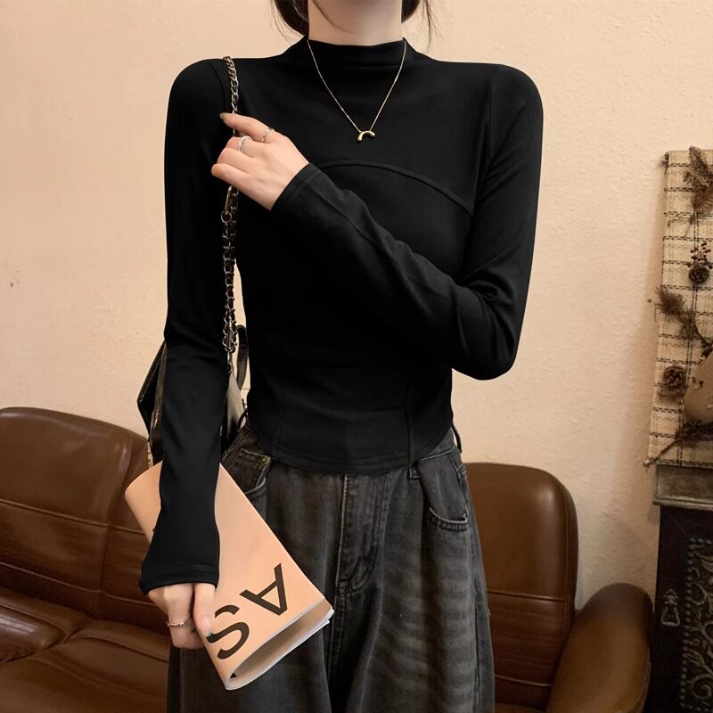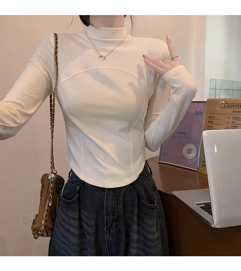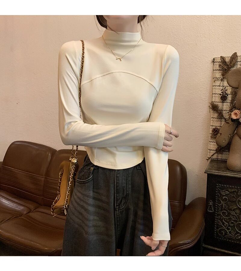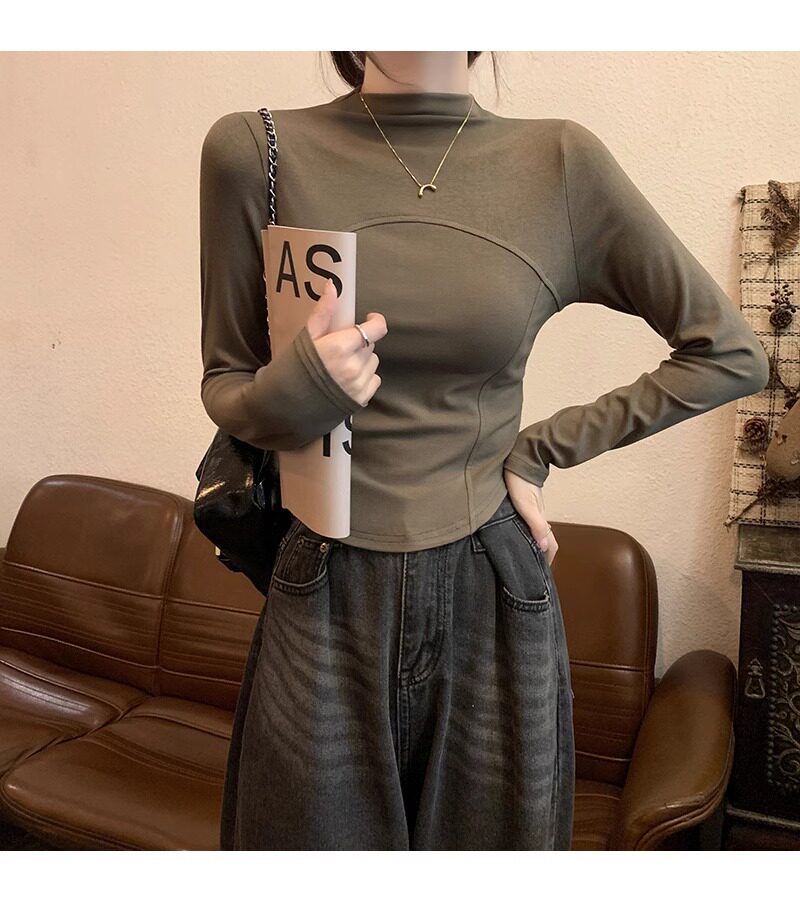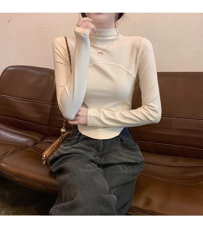 Half-High Collar Fishbone Stitching Brushed Fleece-Lined Base Shirt for Women, Autumn and Winter, Petite Size, Slimming Inner Wear, Short Top