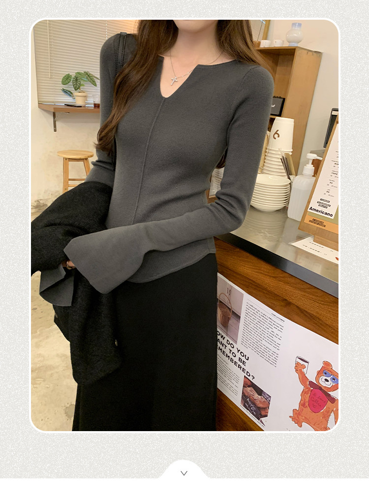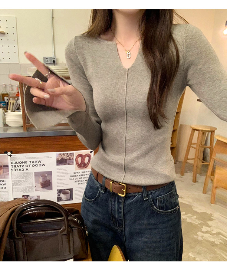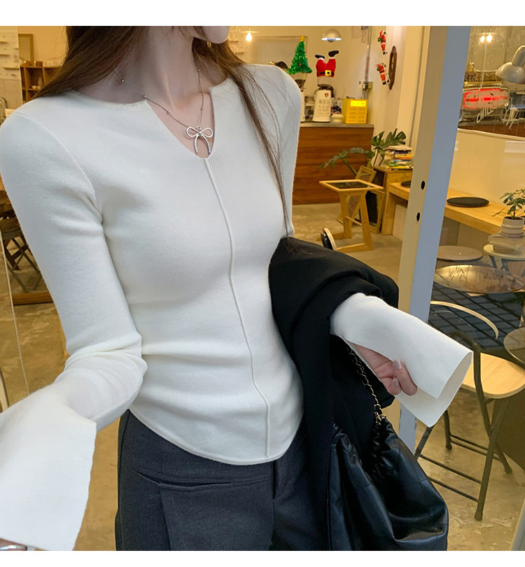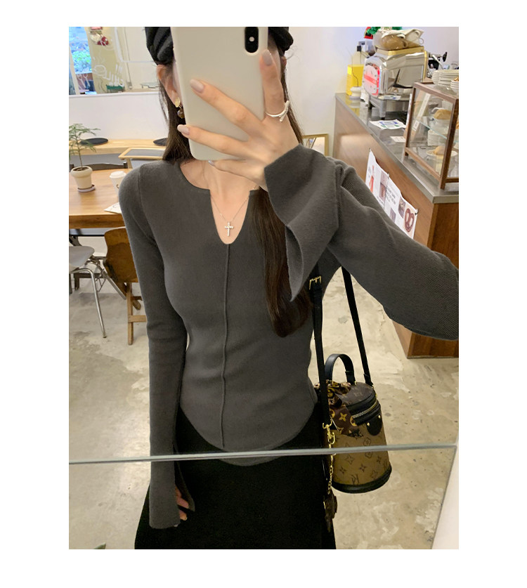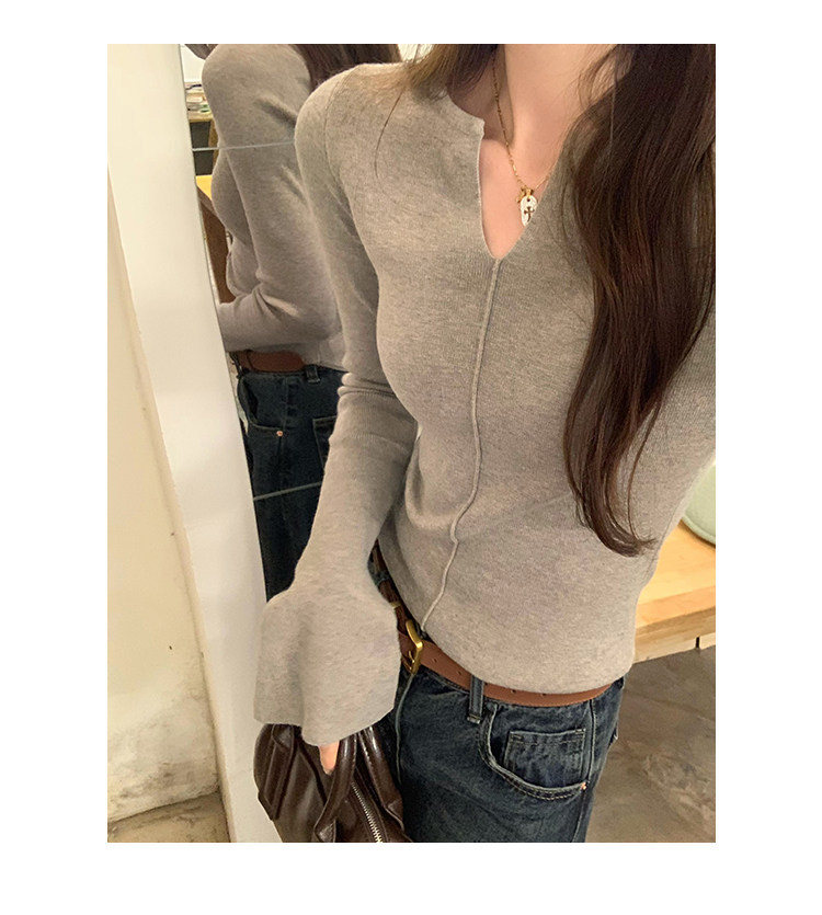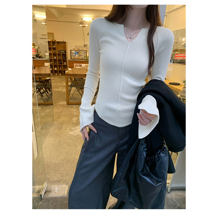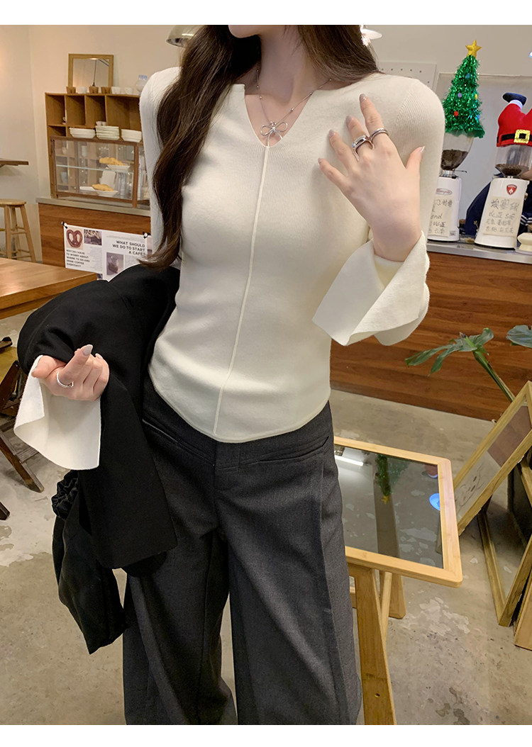 Bell-Sleeve V-Neck Long-Sleeve Knit Top for Women, Autumn and Winter, High-End, Chic, Tight-Fitting, Slimming Base Layer Top