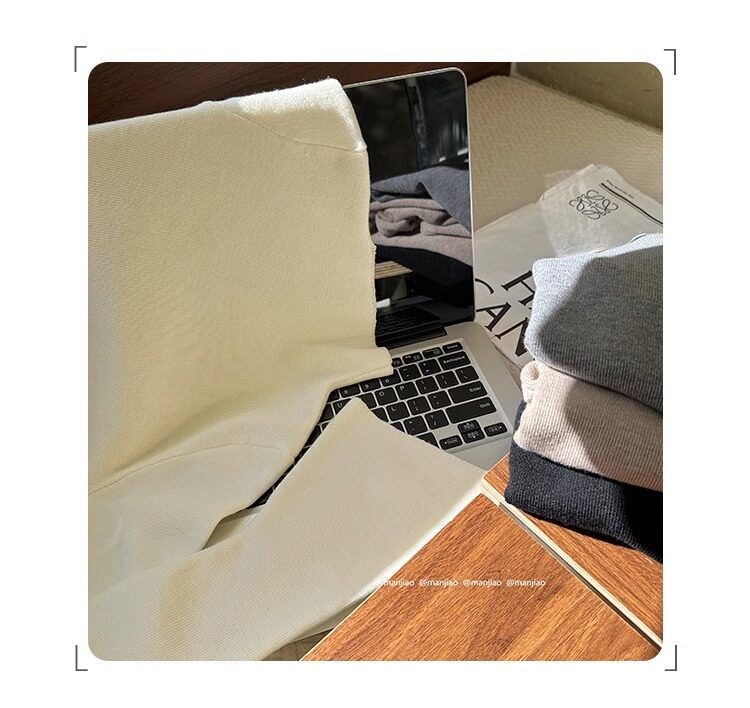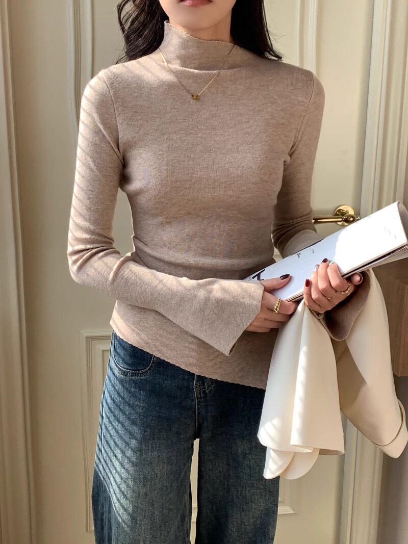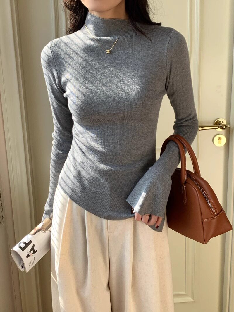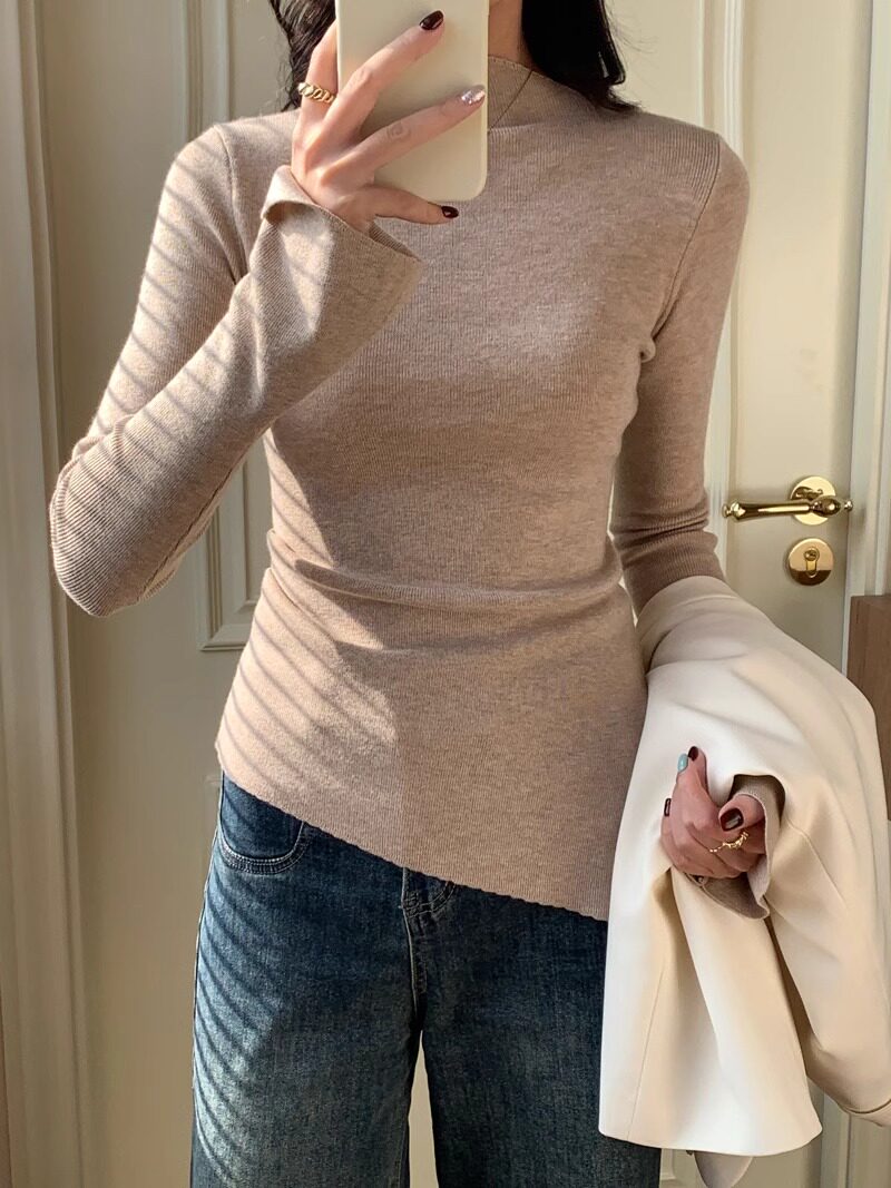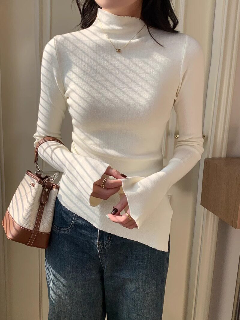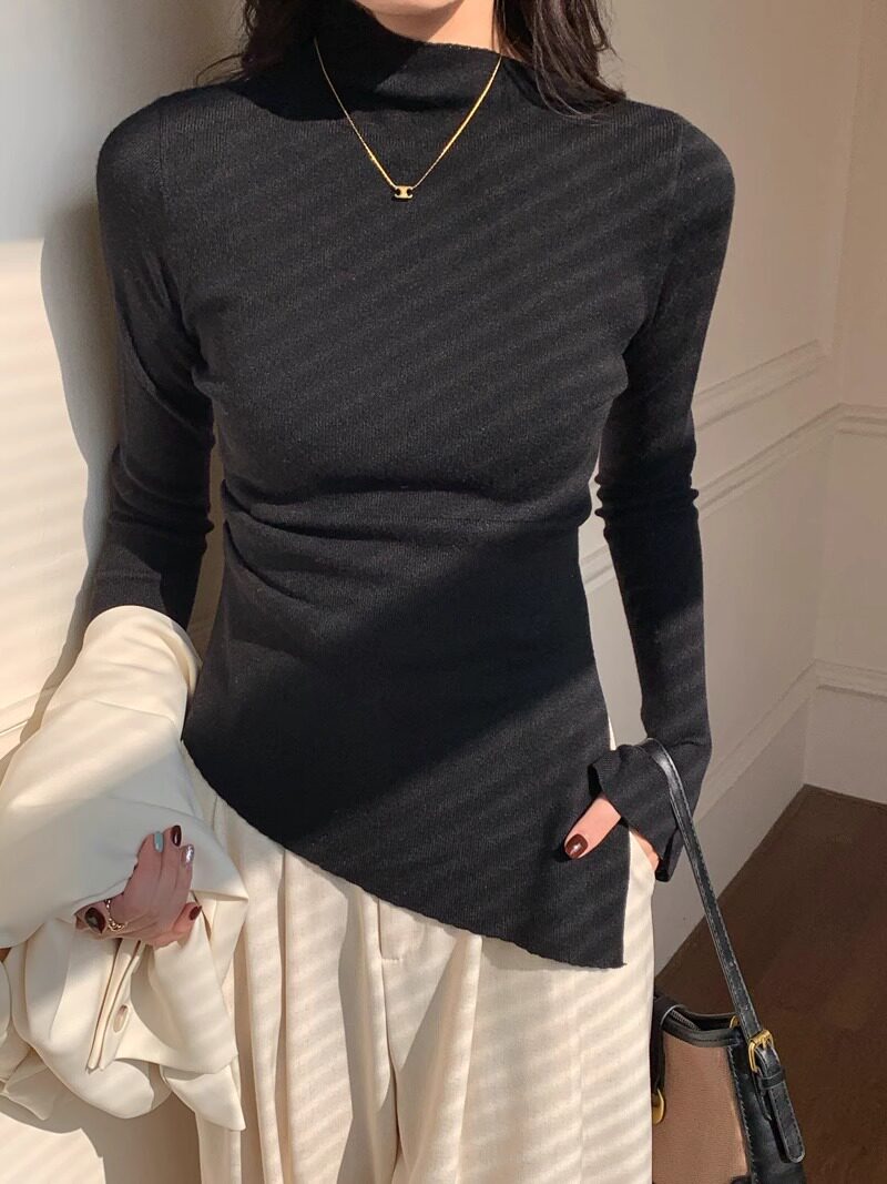 Half-Turtleneck Sweater Knitted Base Shirt for Women, Autumn and Winter, with Asymmetrical Hem, Irregular Base, Slit, Pleated, Slimming Top