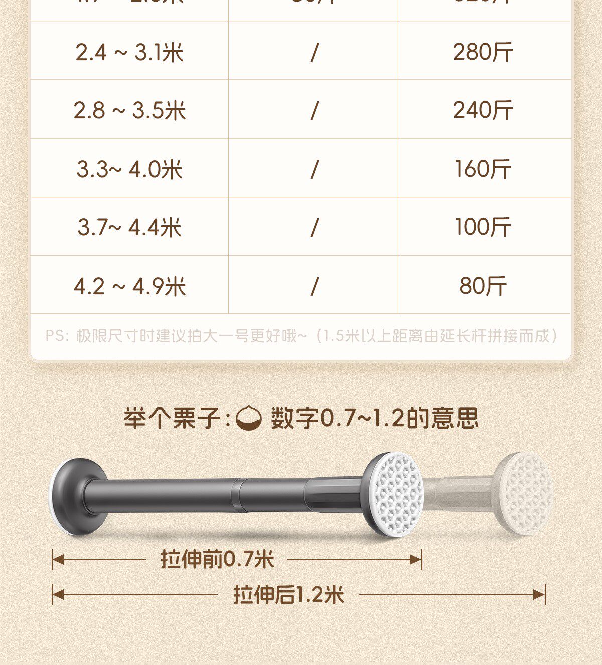 Size Retractable Range: 0 before Stretching.7~1 after Stretching.2m,Retractable Range: 1 before Stretching.0~after Stretching 1.7m,Retractable Range: 1 before Stretching.5~after Stretching 2.2m,Retractable Range: 1 before Stretching.9~after Stretching 2.6m,Retractable Range: 2 before Stretching.4~after Stretching 3.1m,Retractable Range: 2 before Stretching.8~after Stretching 3.5m,Retractable Range: 3 before Stretching.3~4 after Stretching.0m,Retractable Range: 3 before Stretching.7~4 after Stretching.4m,Retractable Range: 4 before Stretching.2~4 after Stretching.9m