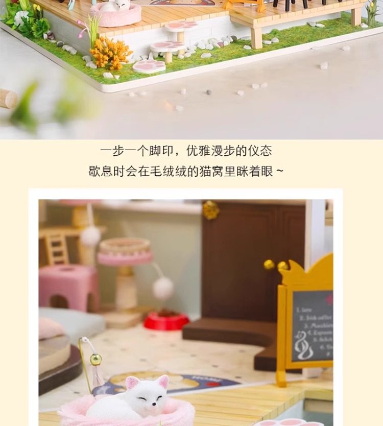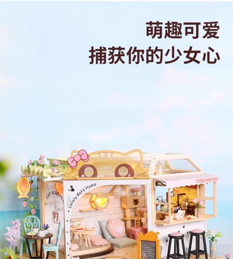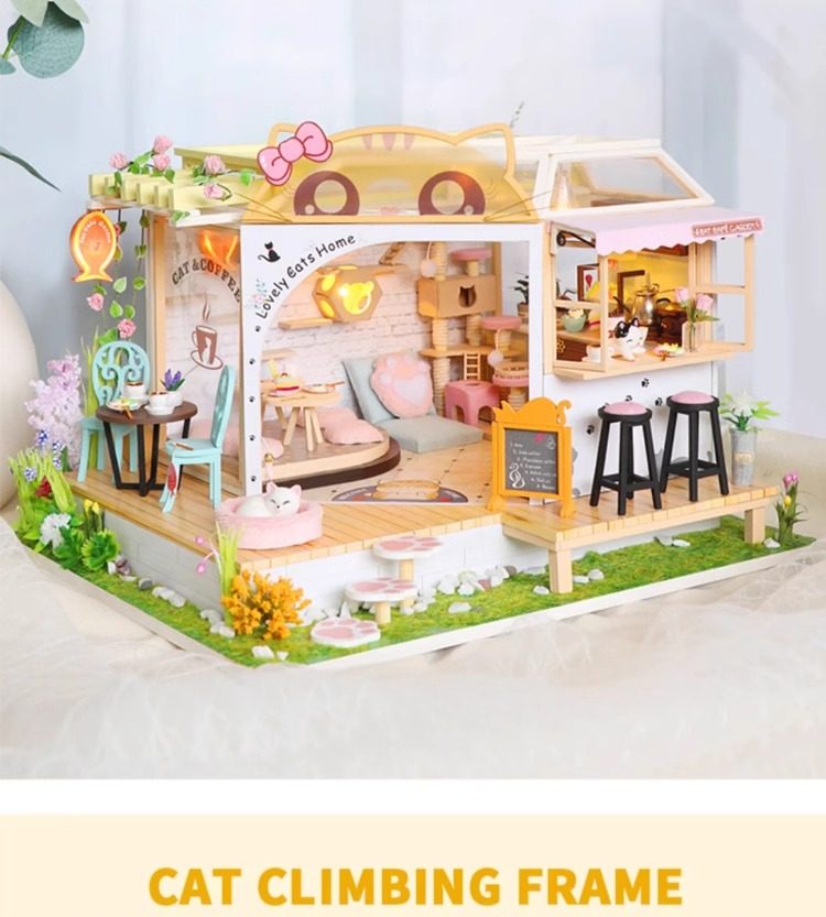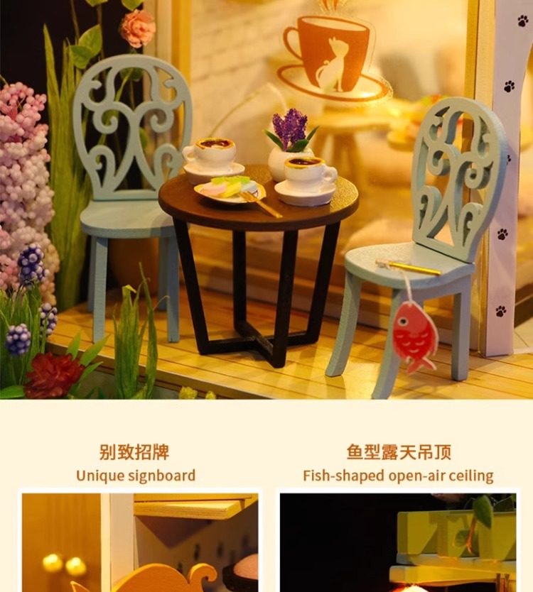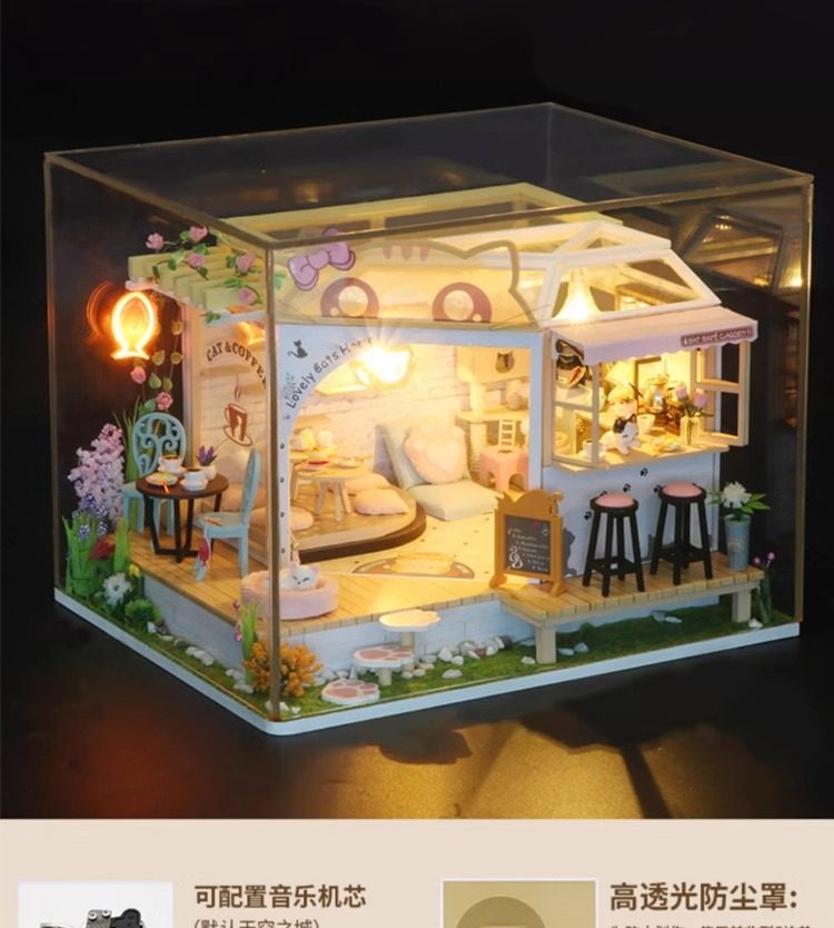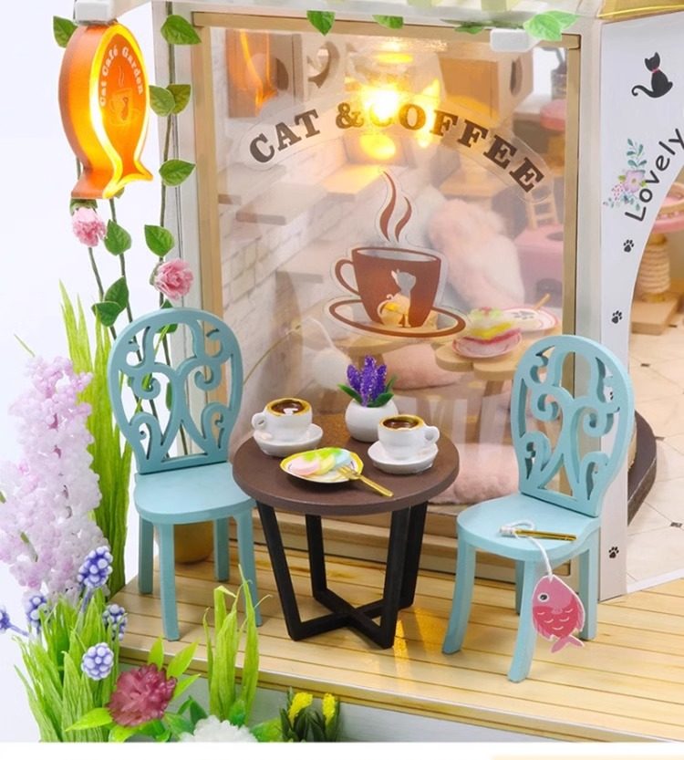 DIY Wooden Assembly Toy Miniature House Model for the Backyard of a Cat Cafe, a Birthday Gift for Girls