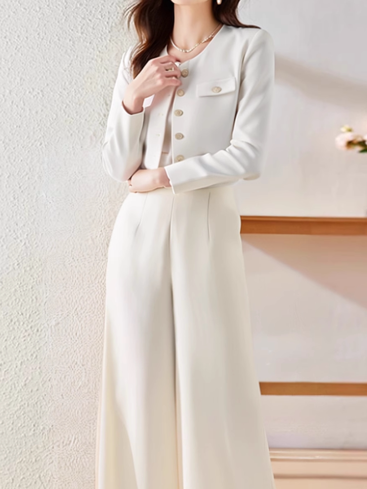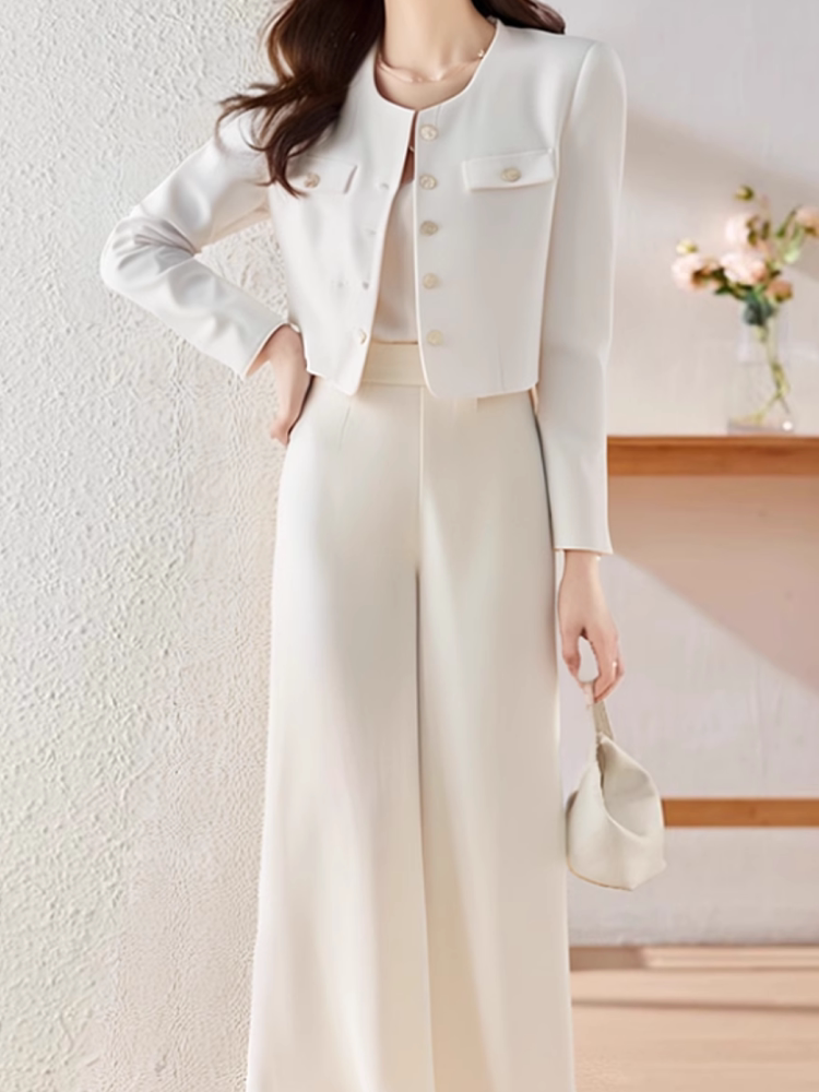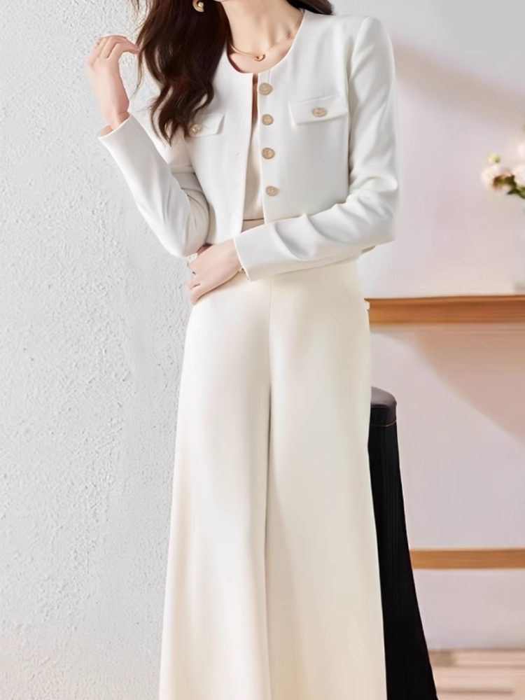 Korean Style Matching Set with a Chanel-Inspired White Jacket and Wide-Leg Pants, Elegant and High-End Two-Piece Set for Spring