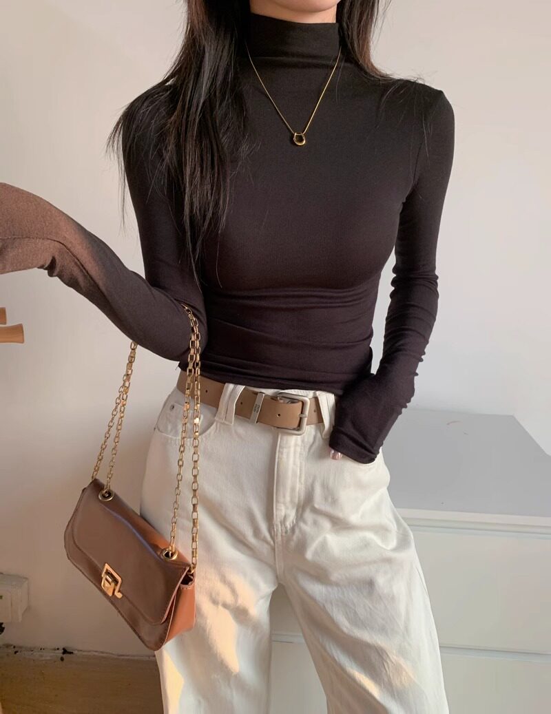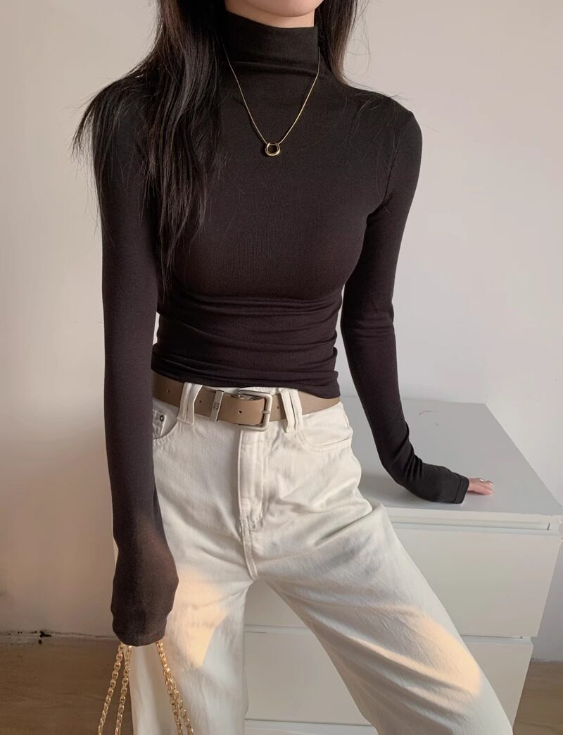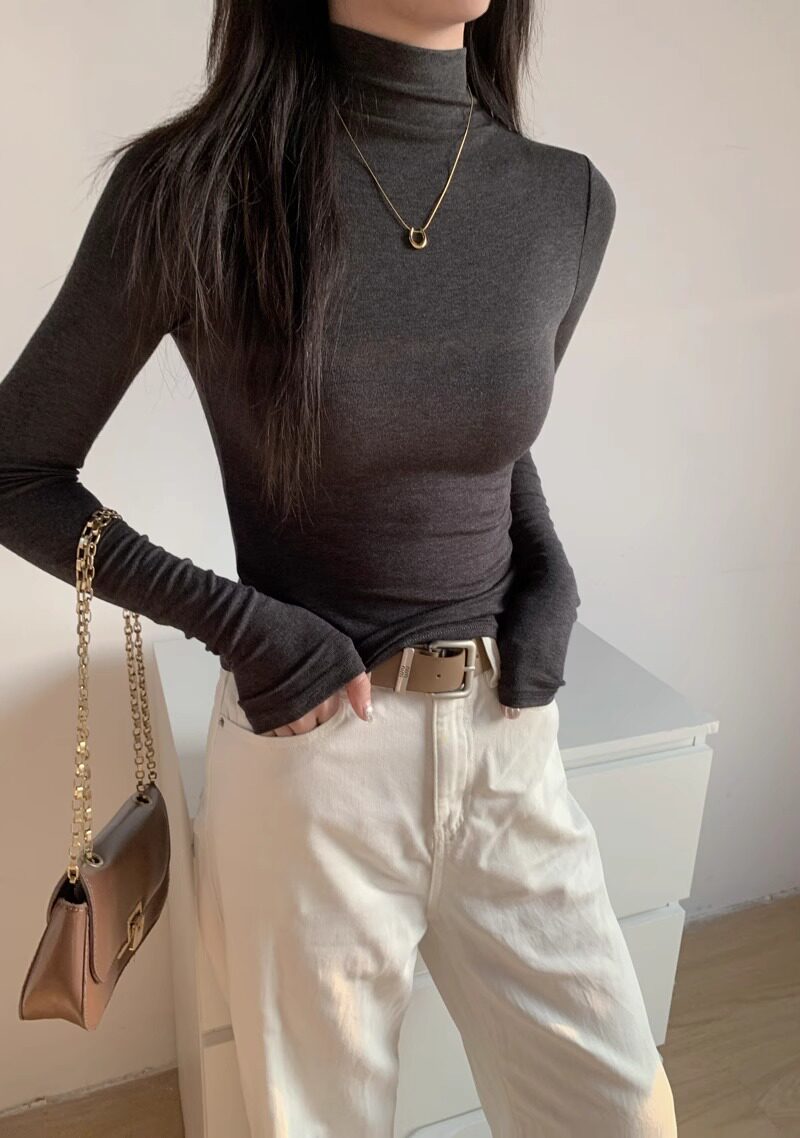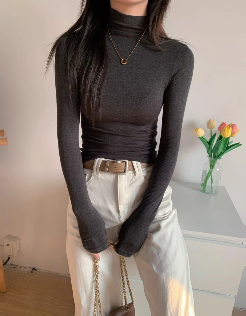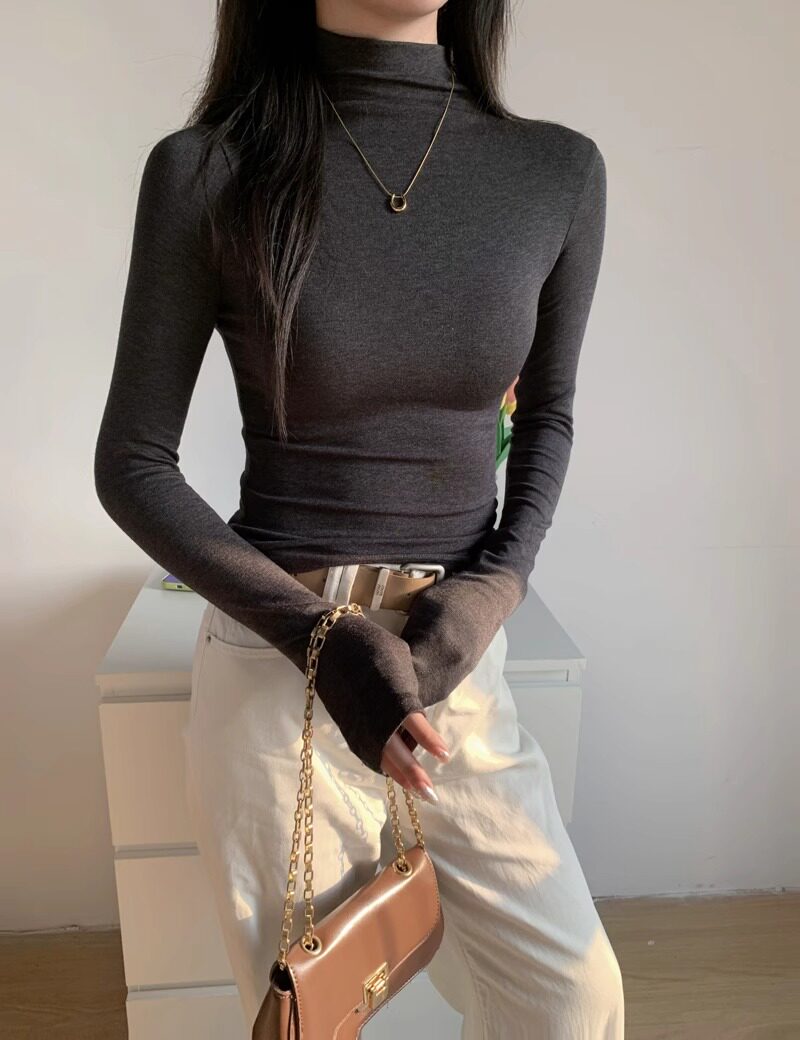 Gray Half-High Collar Base Shirt for Women, Suitable for Layering in Autumn and Winter, with Thin Fleece for Warmth, Stylish Knitted Long-Sleeve Mid-Collar Top