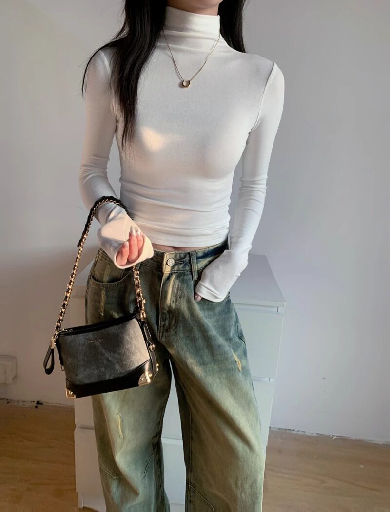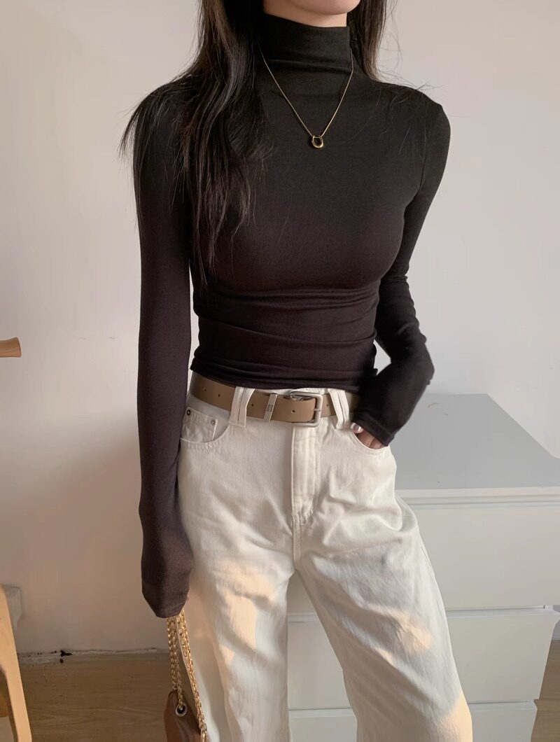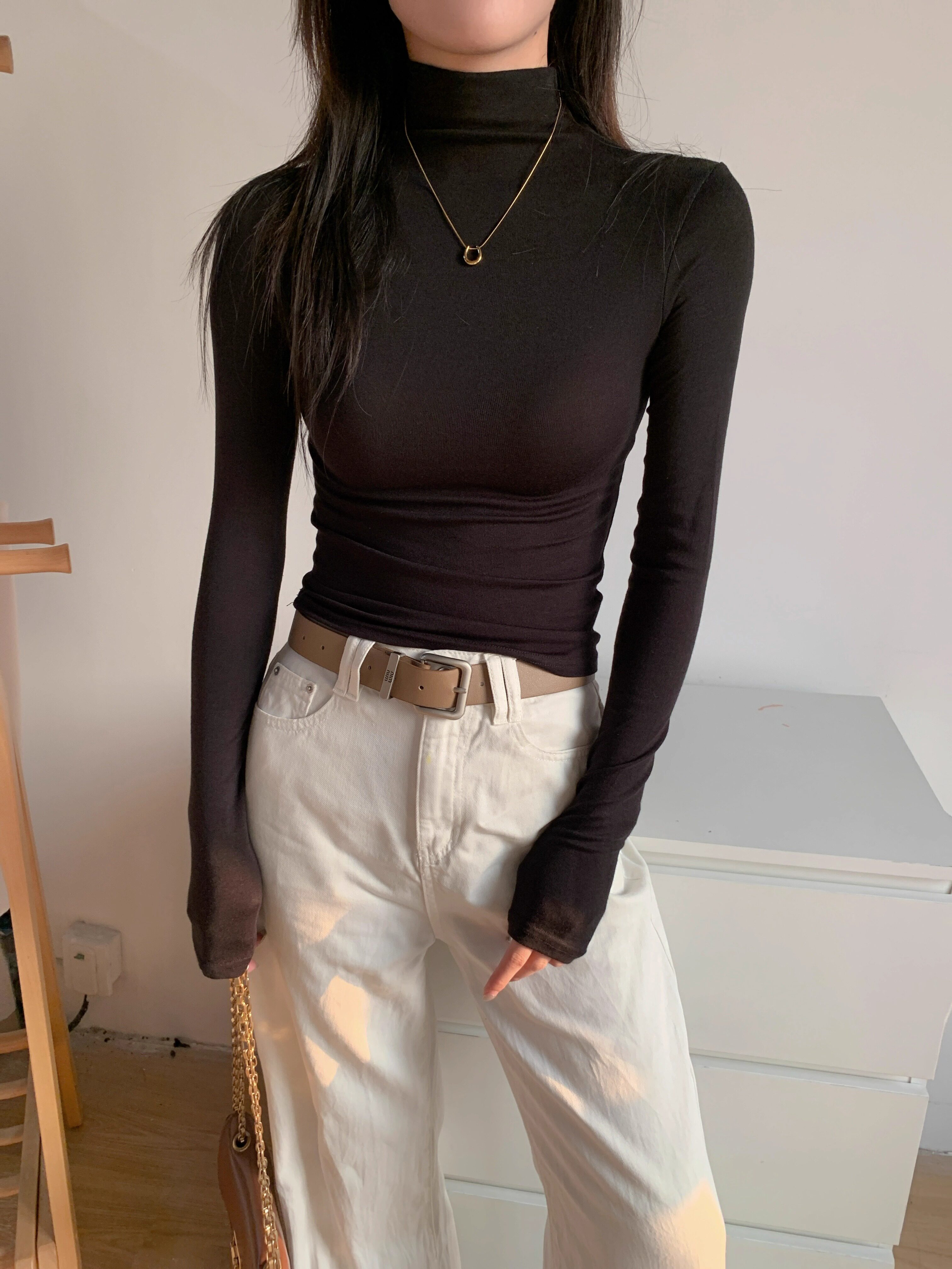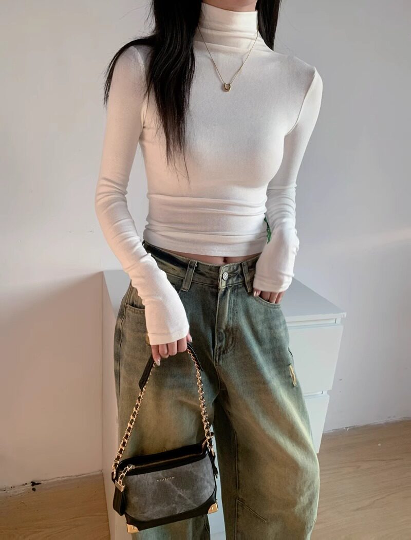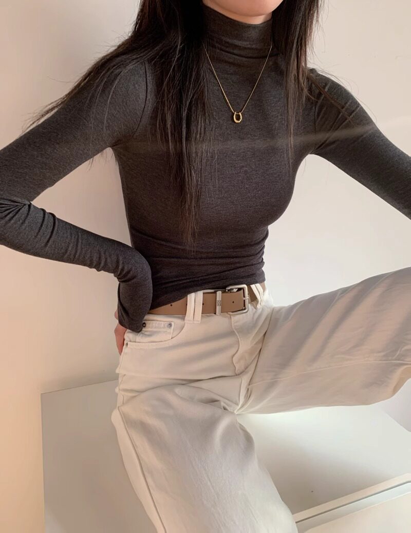 Gray Half-High Collar Base Shirt for Women, Suitable for Layering in Autumn and Winter, with Thin Fleece for Warmth, Stylish Knitted Long-Sleeve Mid-Collar Top