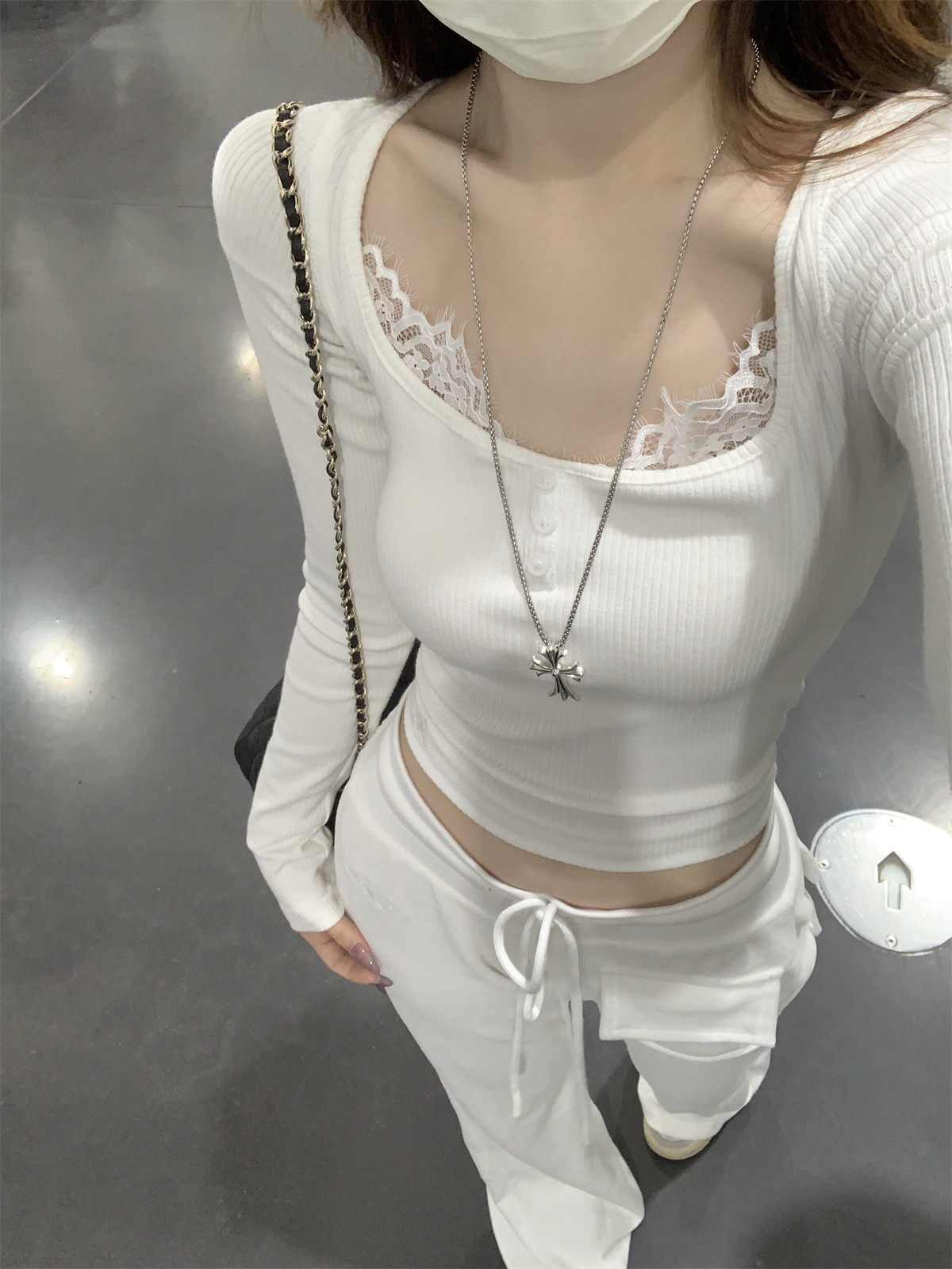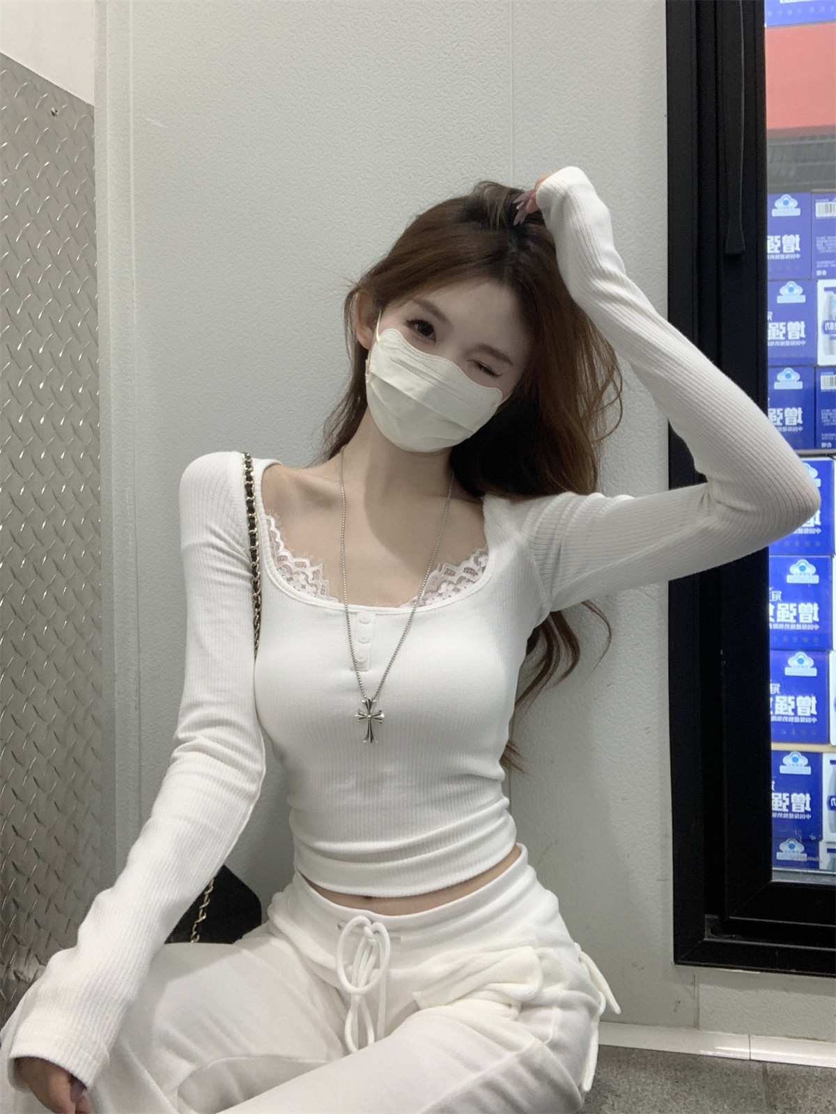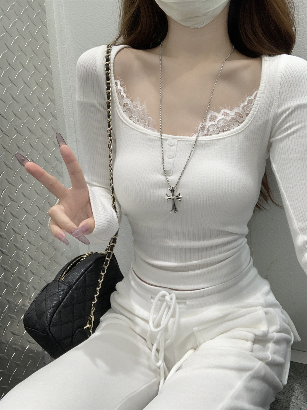 Pure Desire Style Lace Splicing Square Neck White Base Shirt for Women, New Spring and Autumn Korean Version Slim Fit Sexy Long-Sleeve T-Shirt for Women
