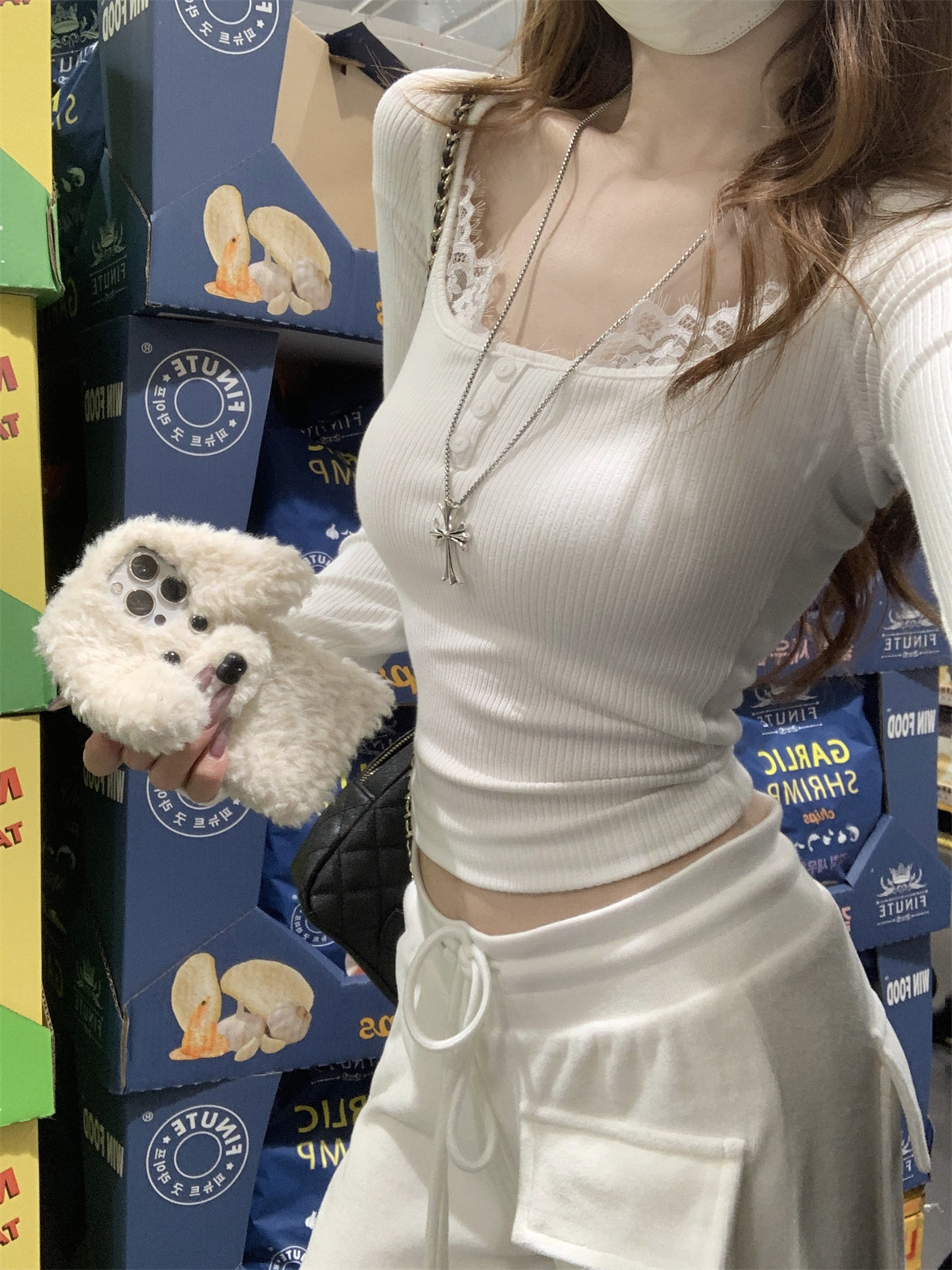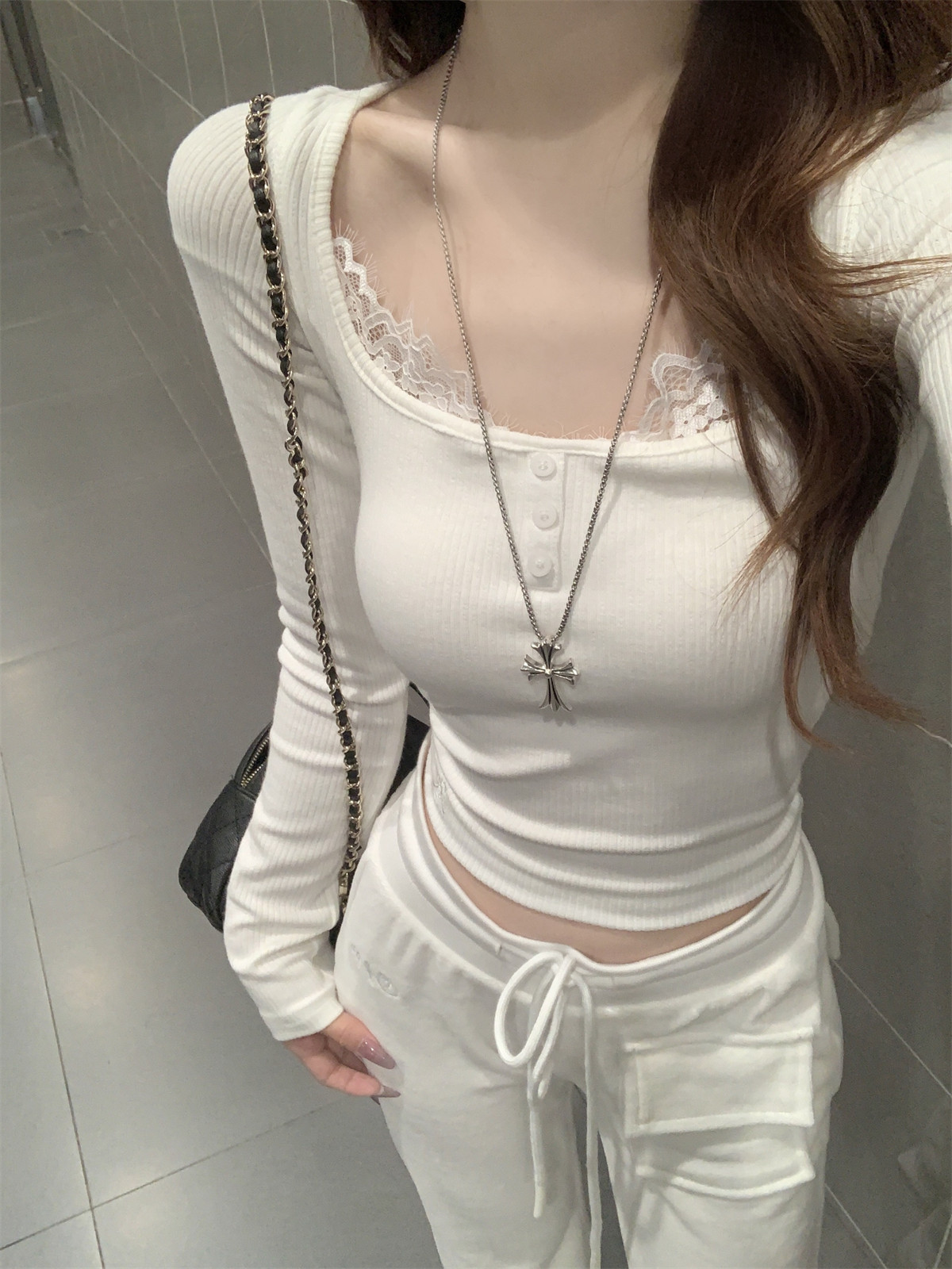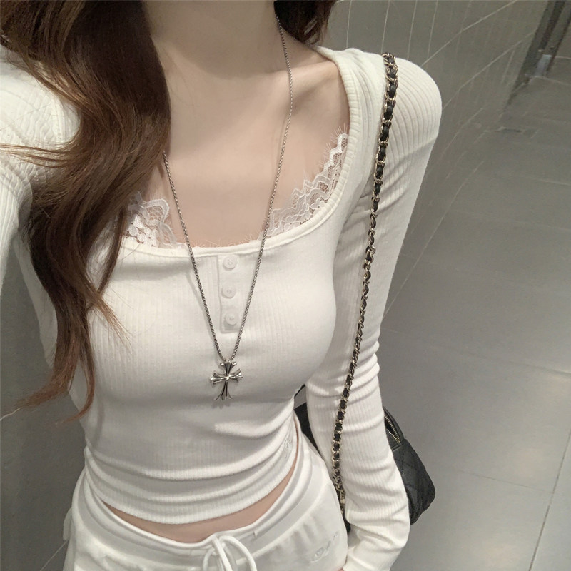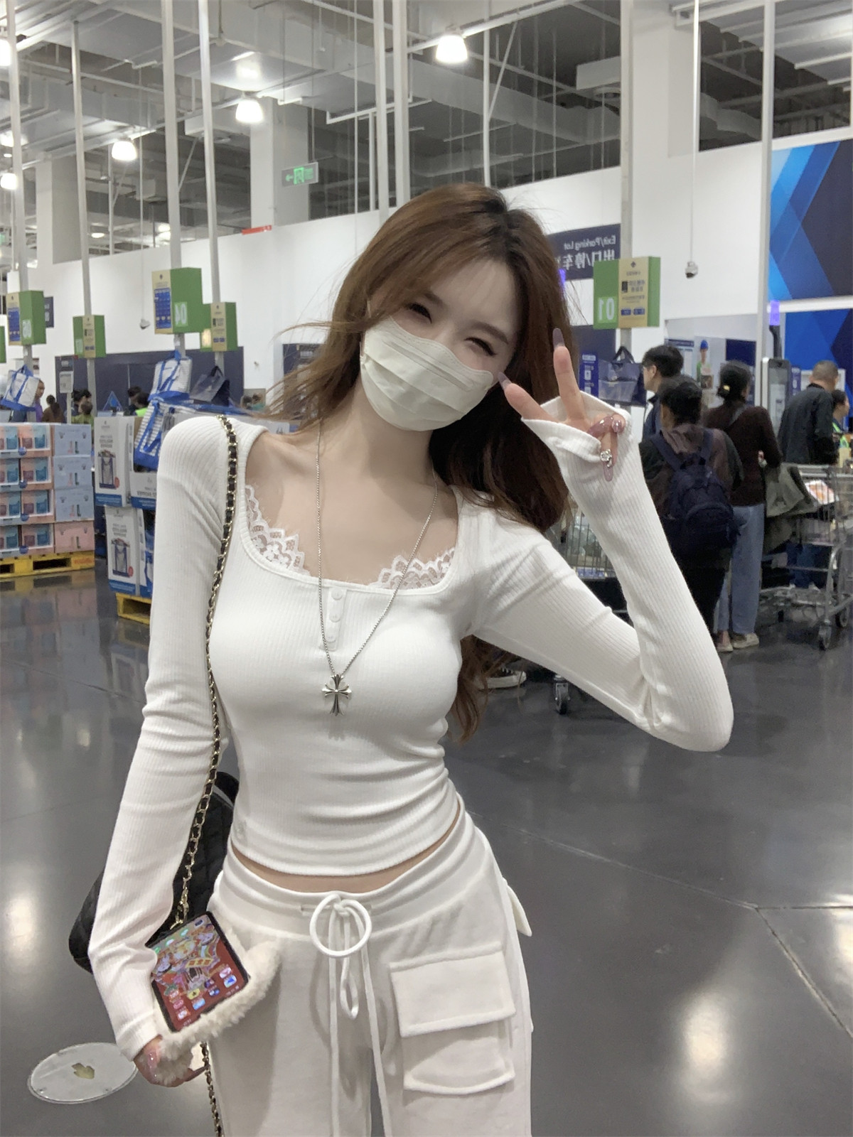 Pure Desire Style Lace Splicing Square Neck White Base Shirt for Women, New Spring and Autumn Korean Version Slim Fit Sexy Long-Sleeve T-Shirt for Women