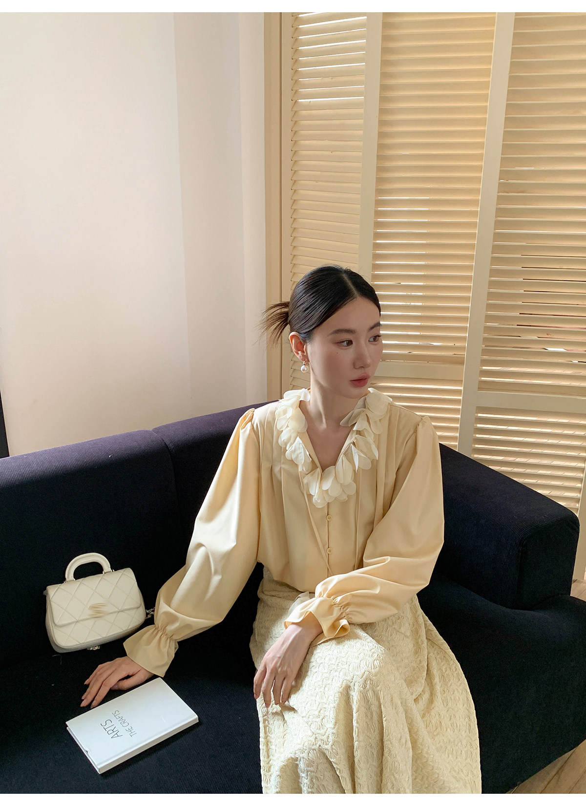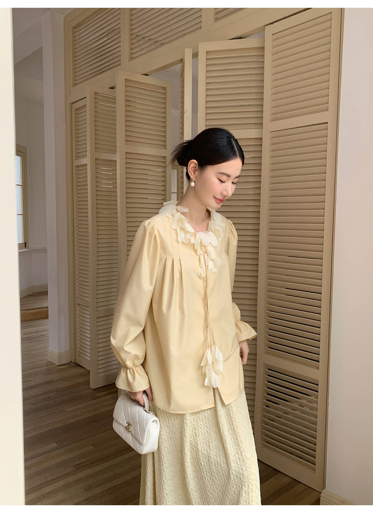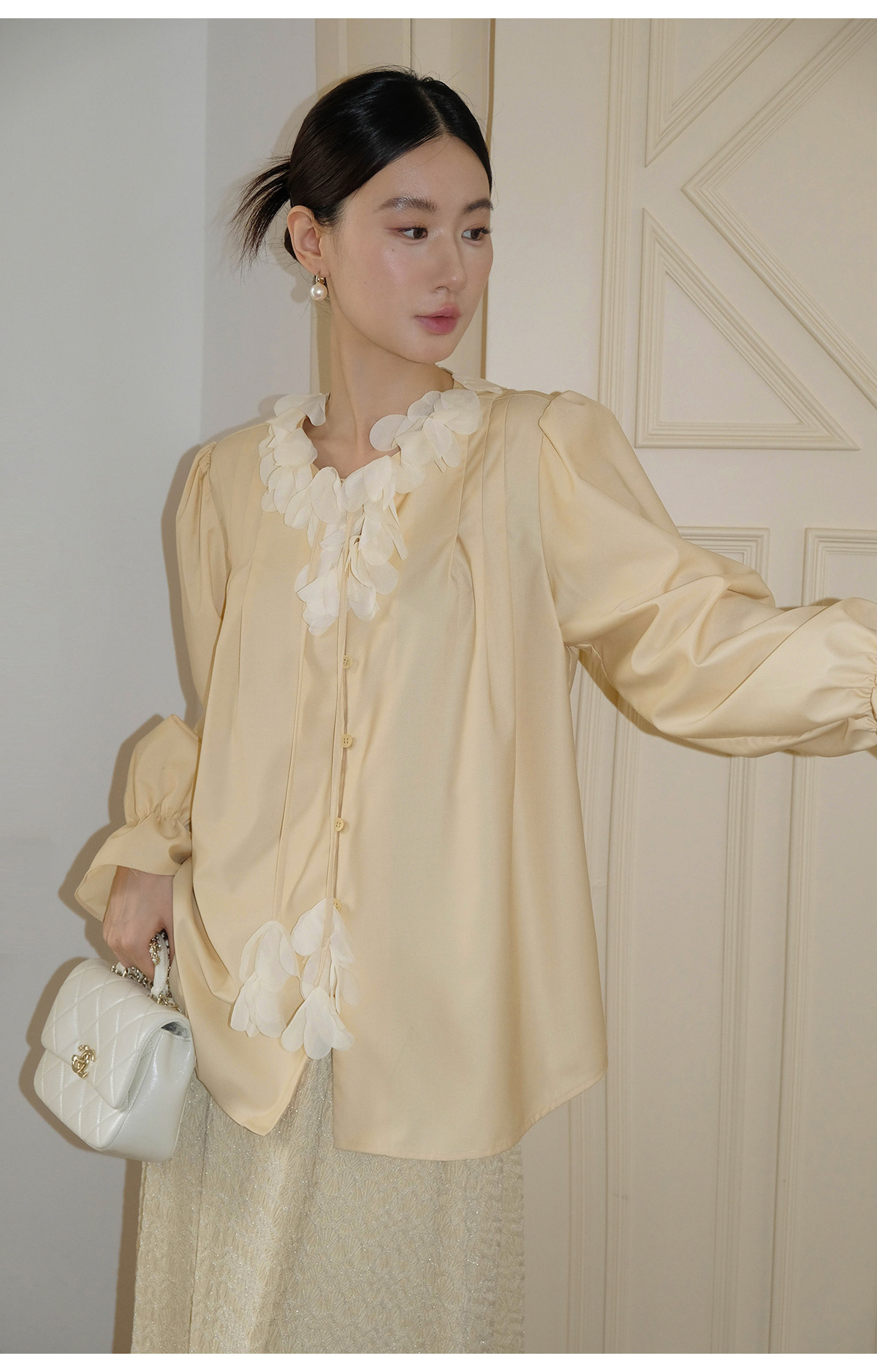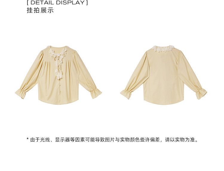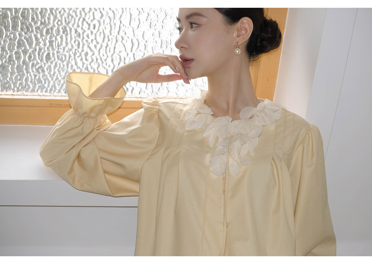 Xxning French Lace Collar Ribbon Pleated Shirt for Women, New Autumn Romantic Design Lantern Sleeve Top