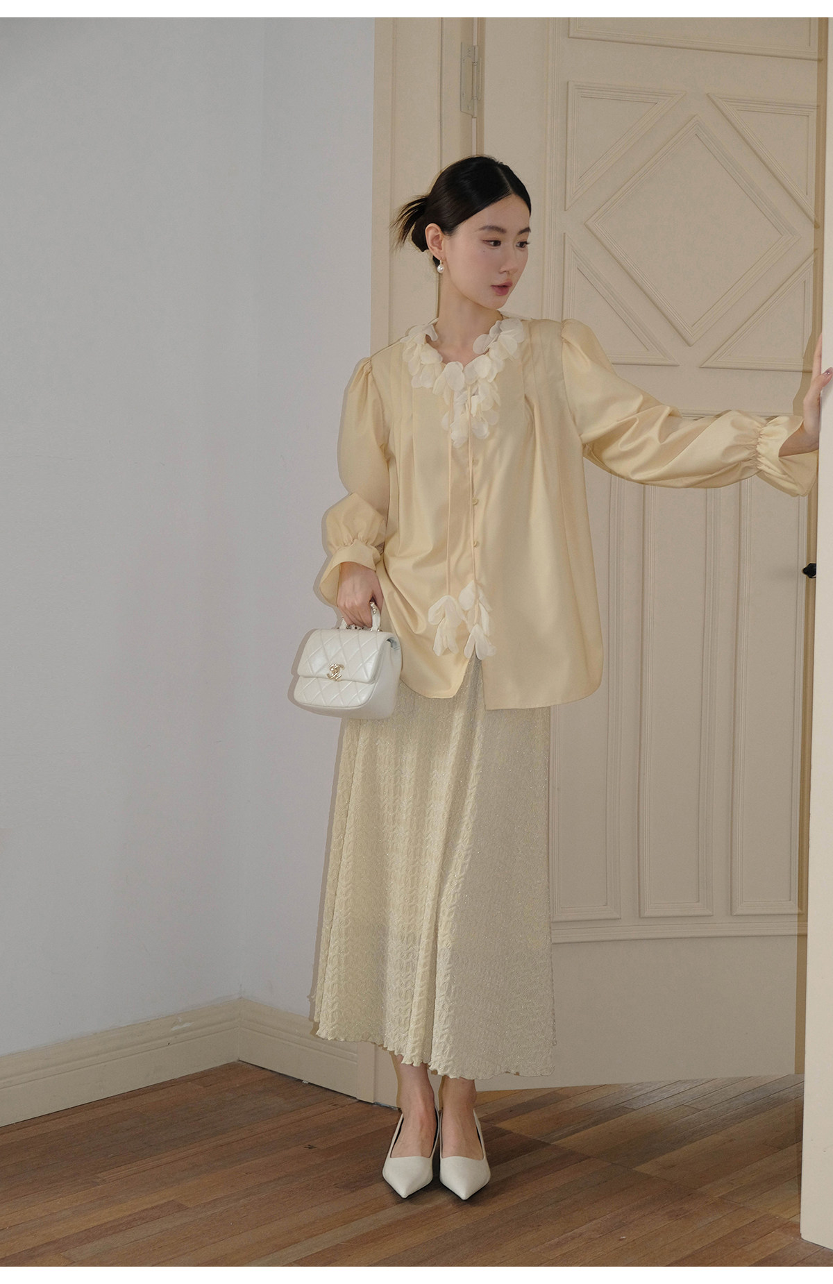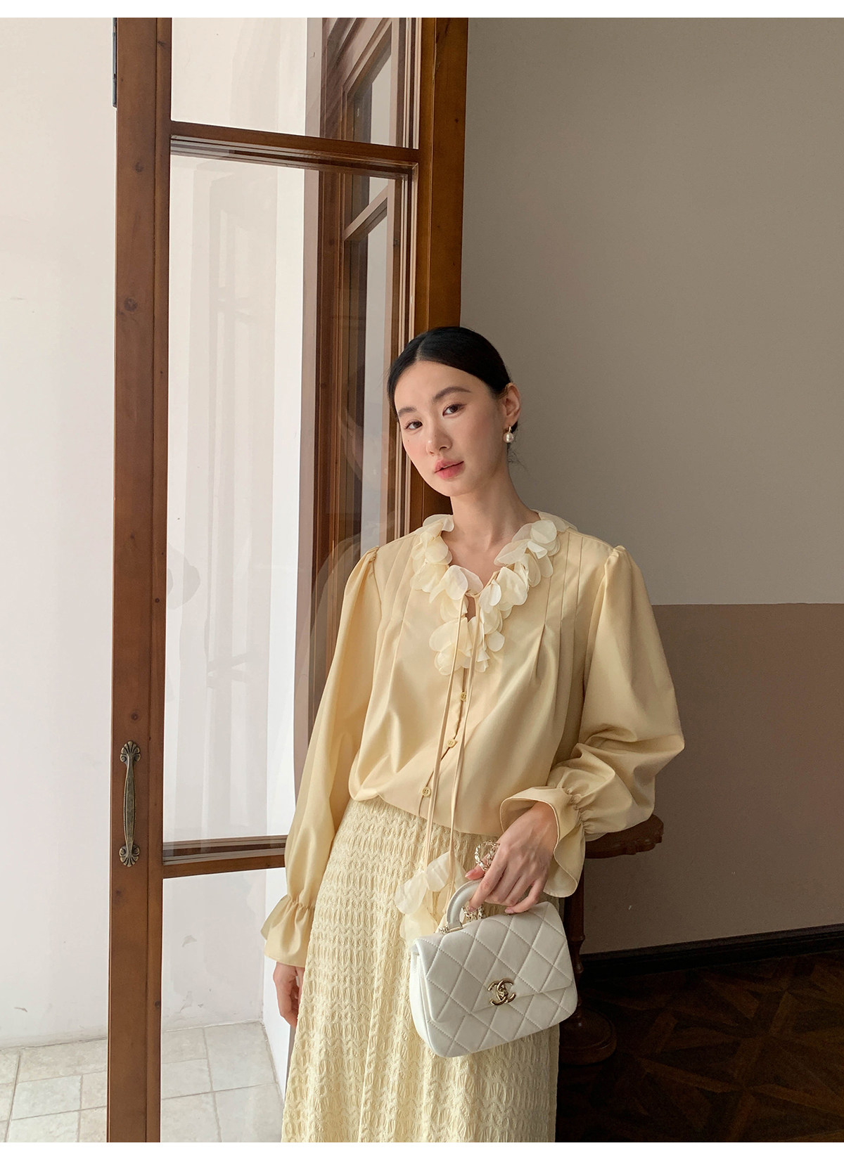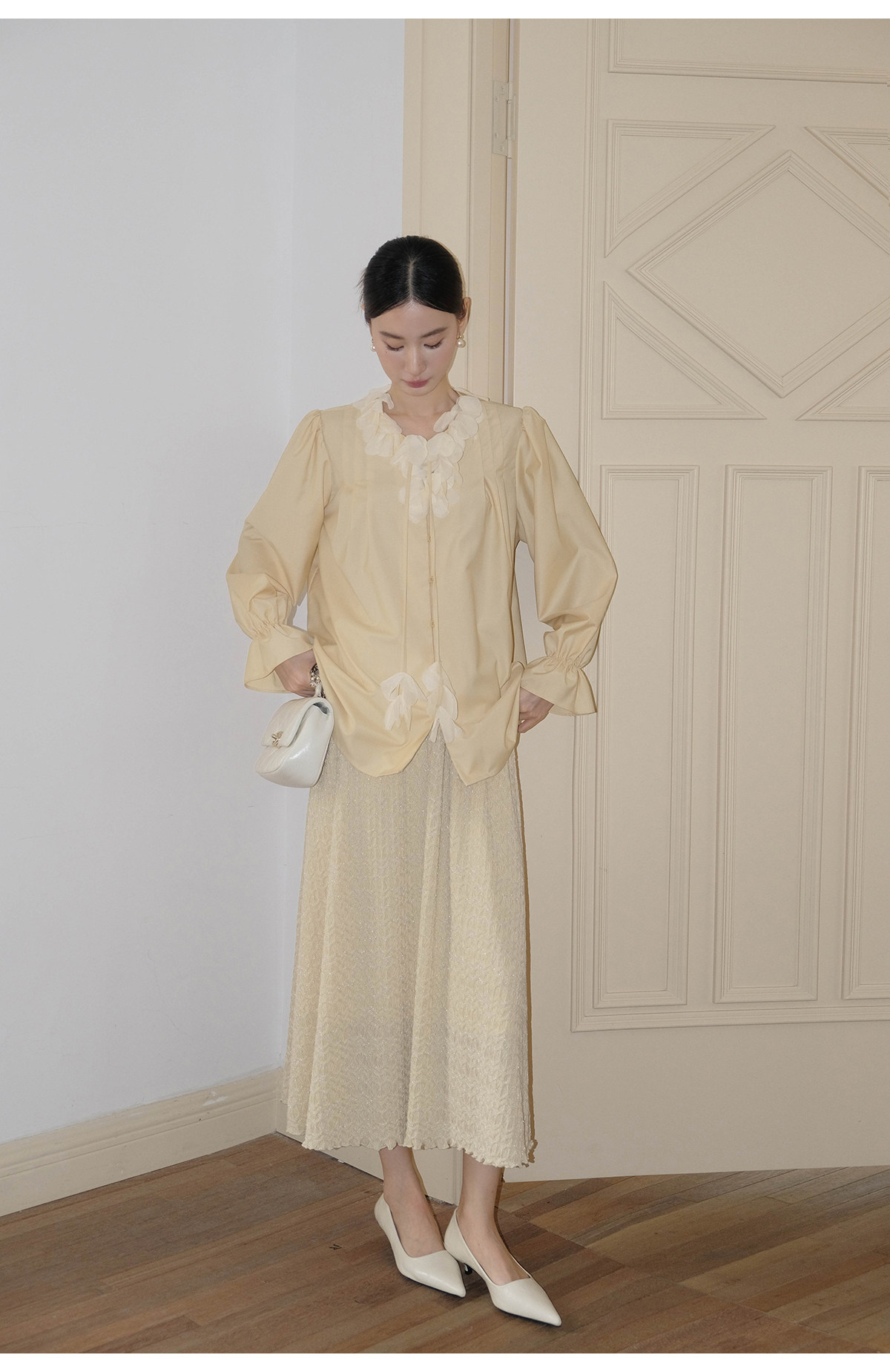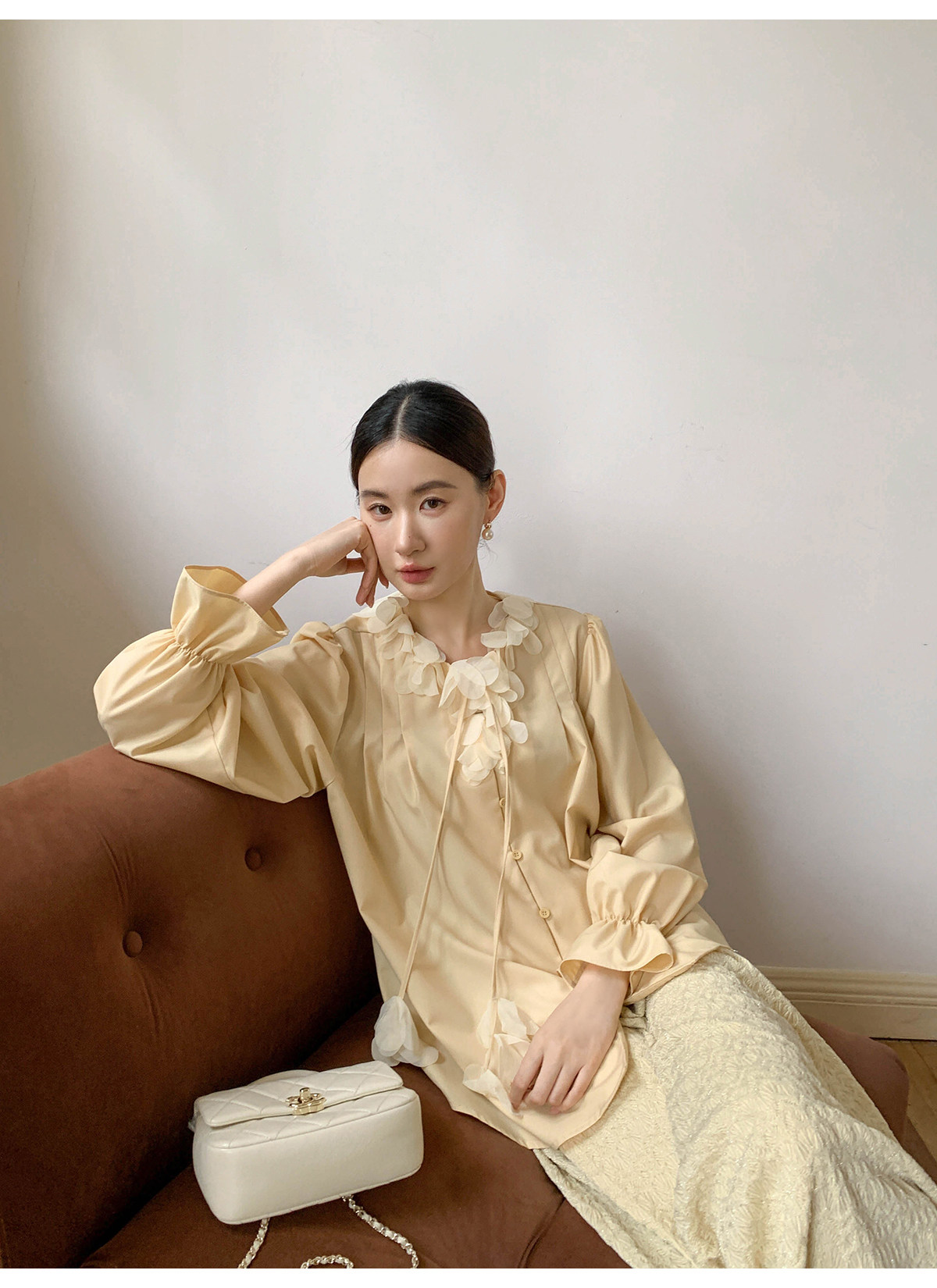 Xxning French Lace Collar Ribbon Pleated Shirt for Women, New Autumn Romantic Design Lantern Sleeve Top