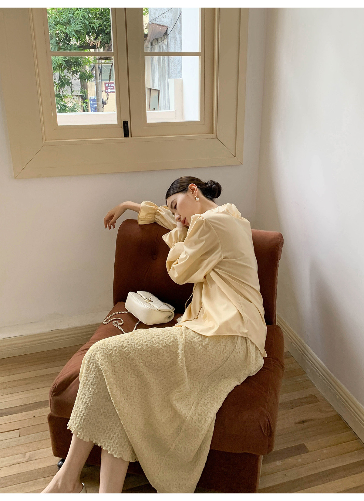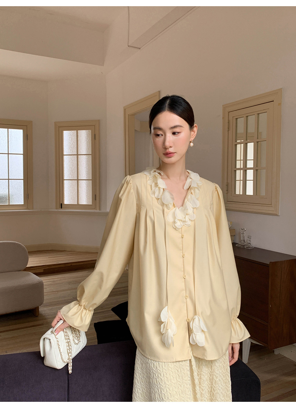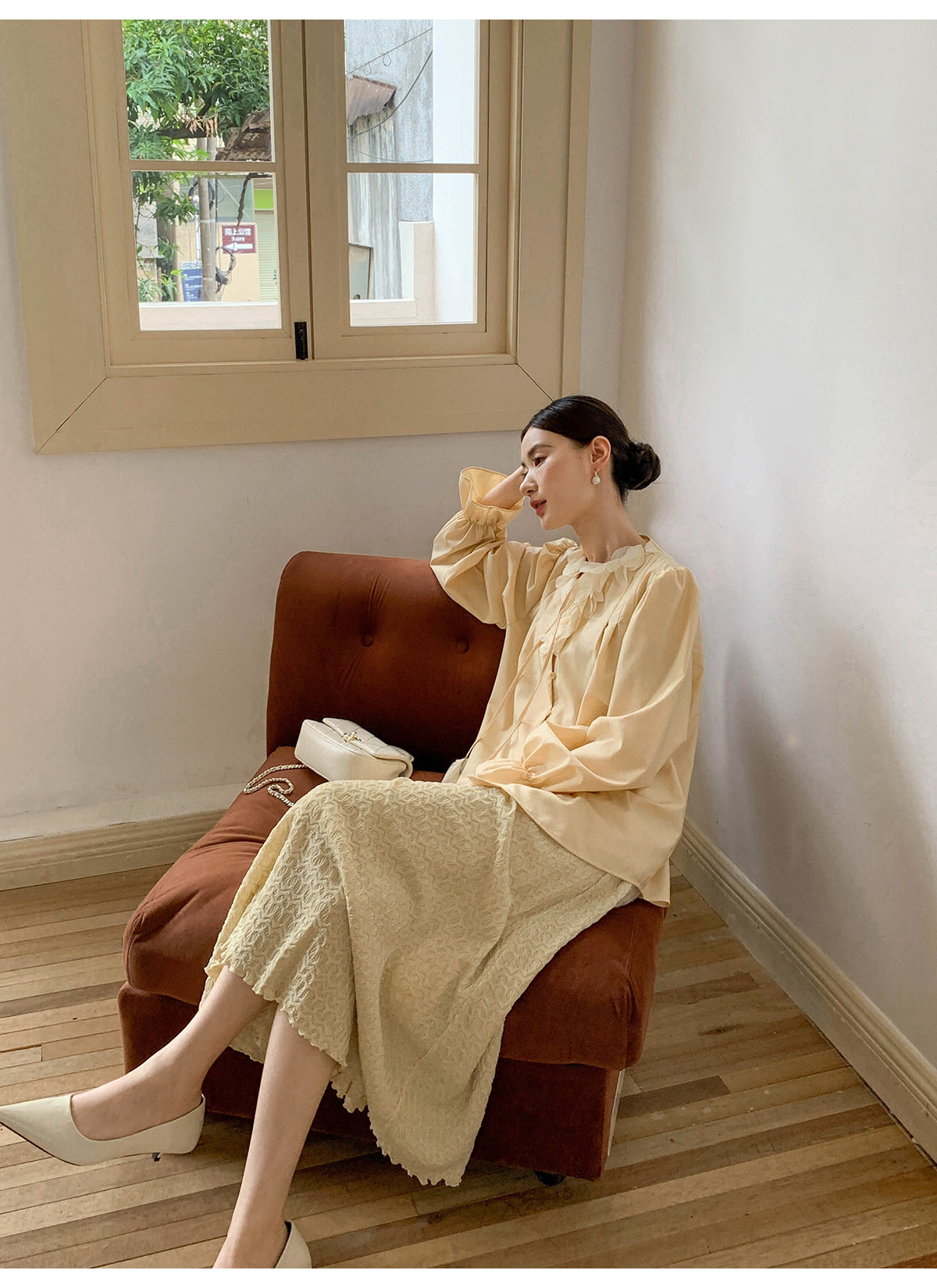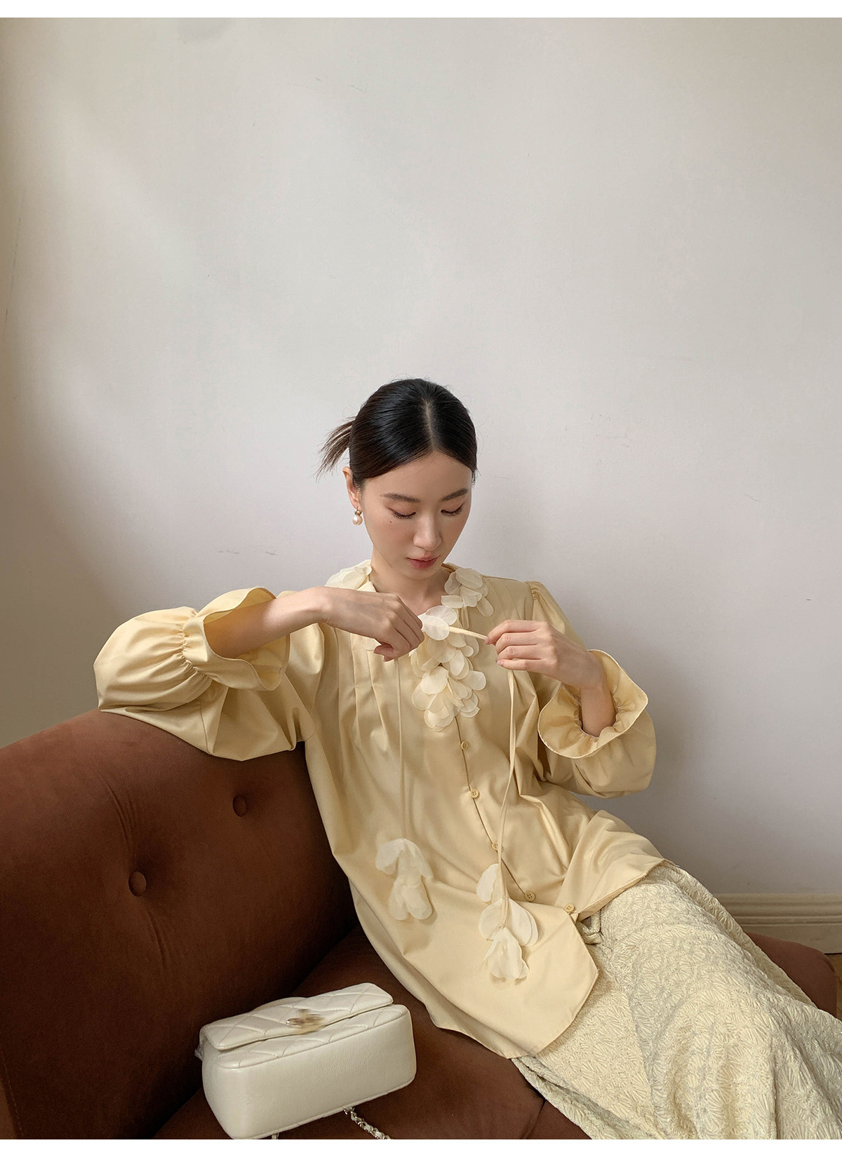 Xxning French Lace Collar Ribbon Pleated Shirt for Women, New Autumn Romantic Design Lantern Sleeve Top