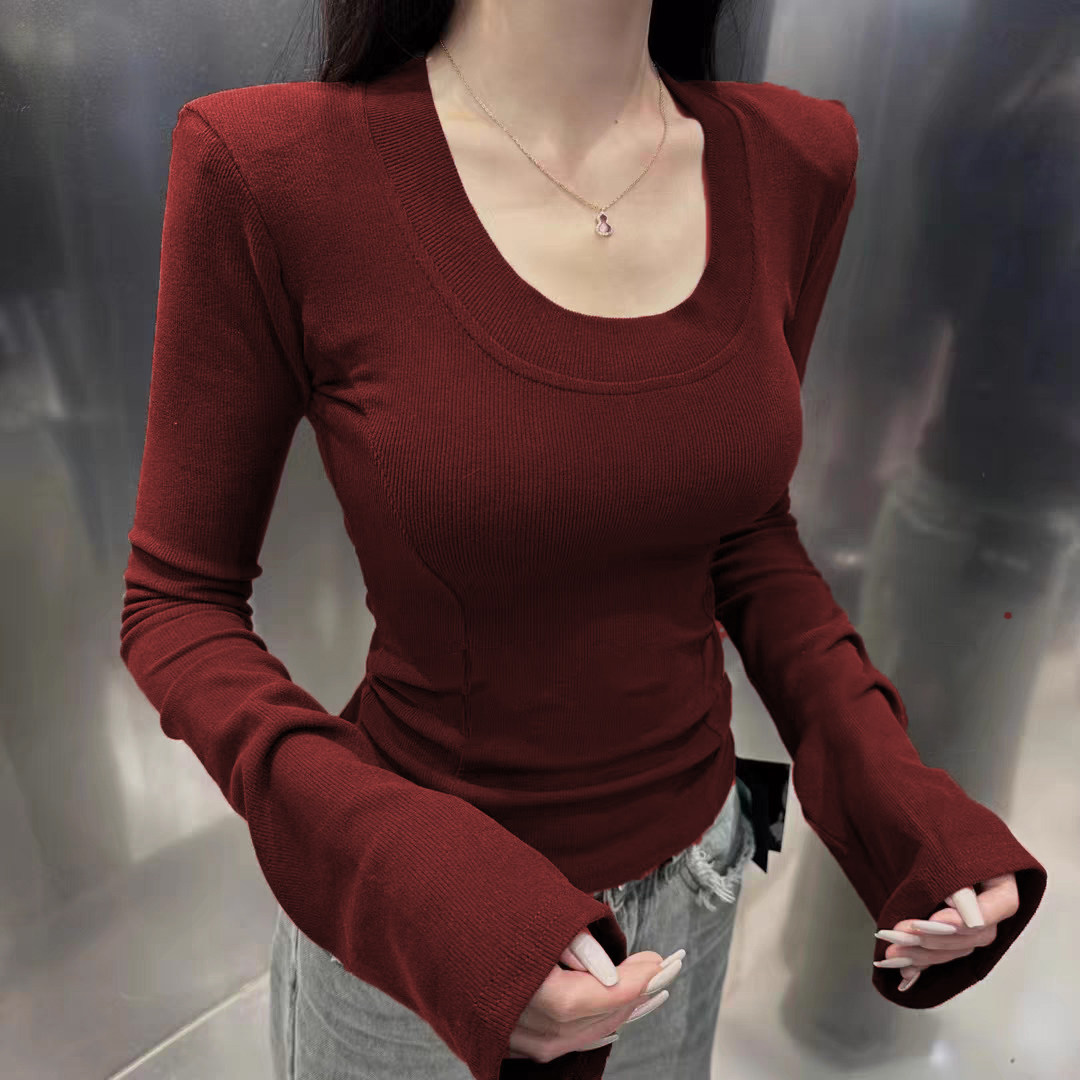 New Year Red Brushed Shoulder Pad Long-Sleeve T-Shirt for Women 2025 Winter, Sexy Short Top That Exposes Collarbone ins