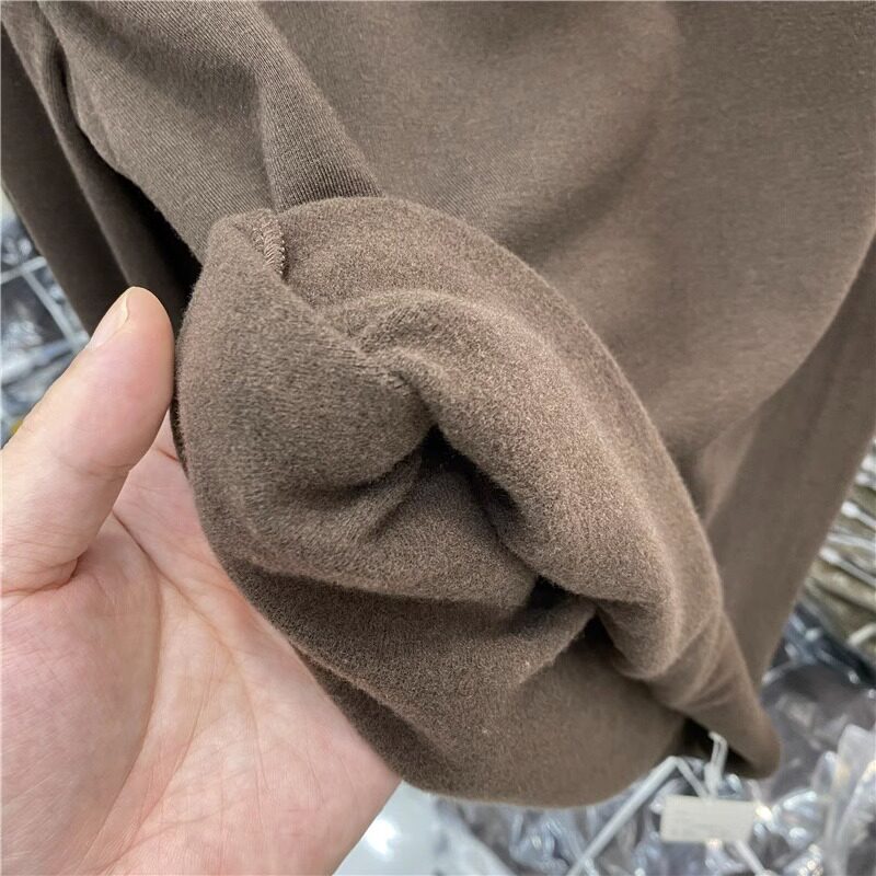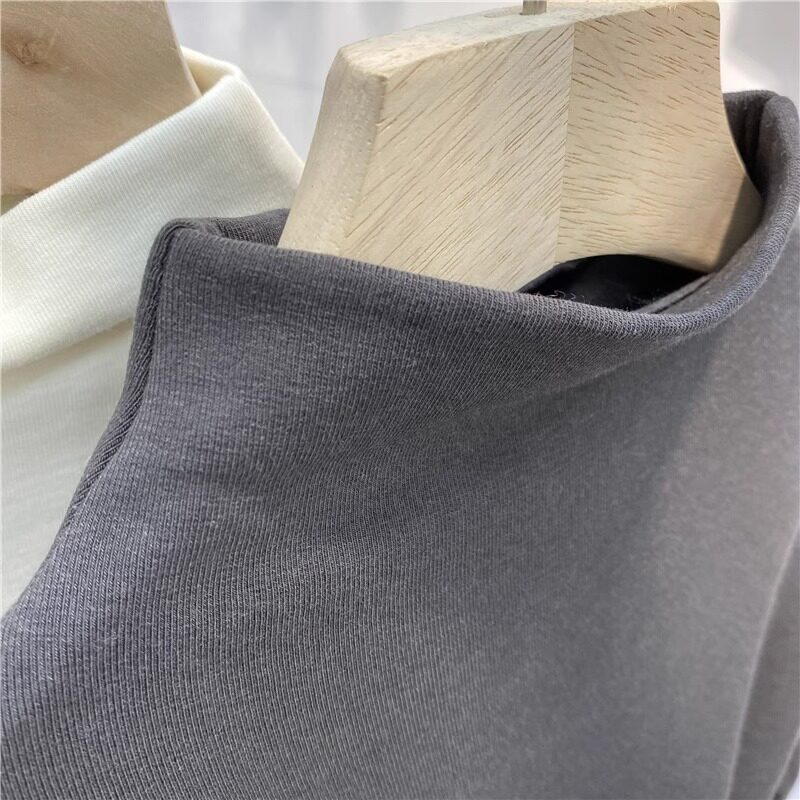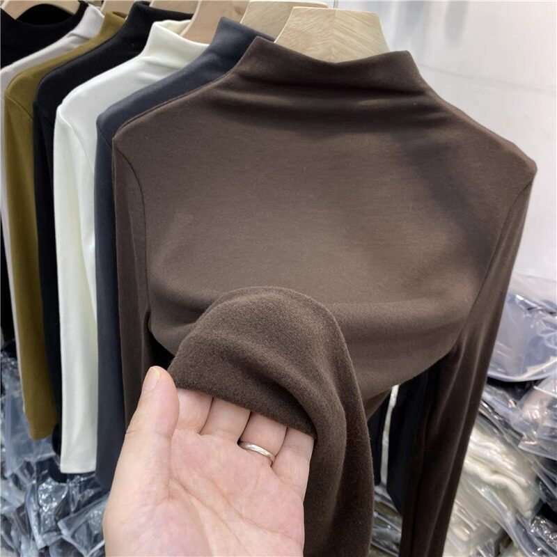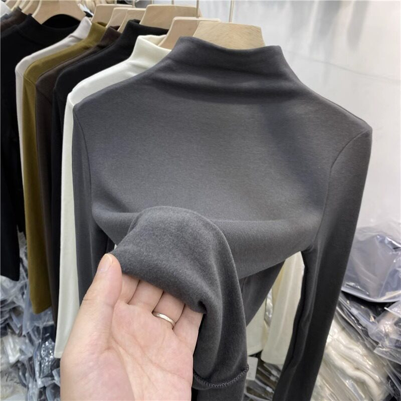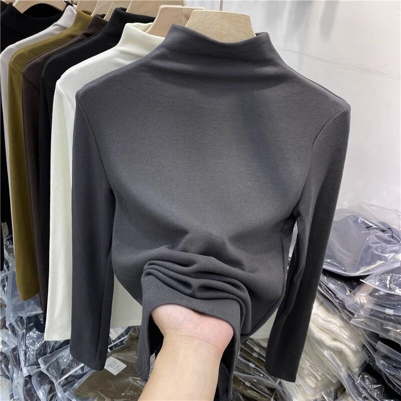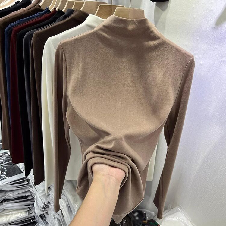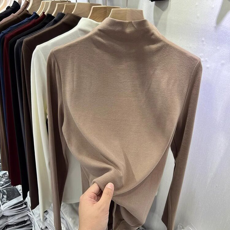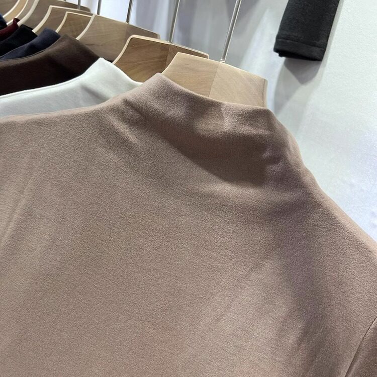 Half-High Collar, Regular Shoulder, Long-Sleeve Base Shirt for Women, Autumn and Winter T-Shirt, Stylish Layering, Slim Fit, Thin Fleece, Brushed Fabric Top