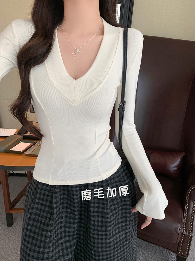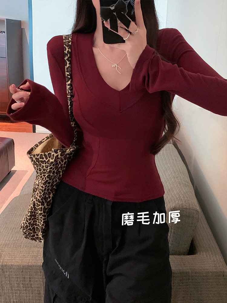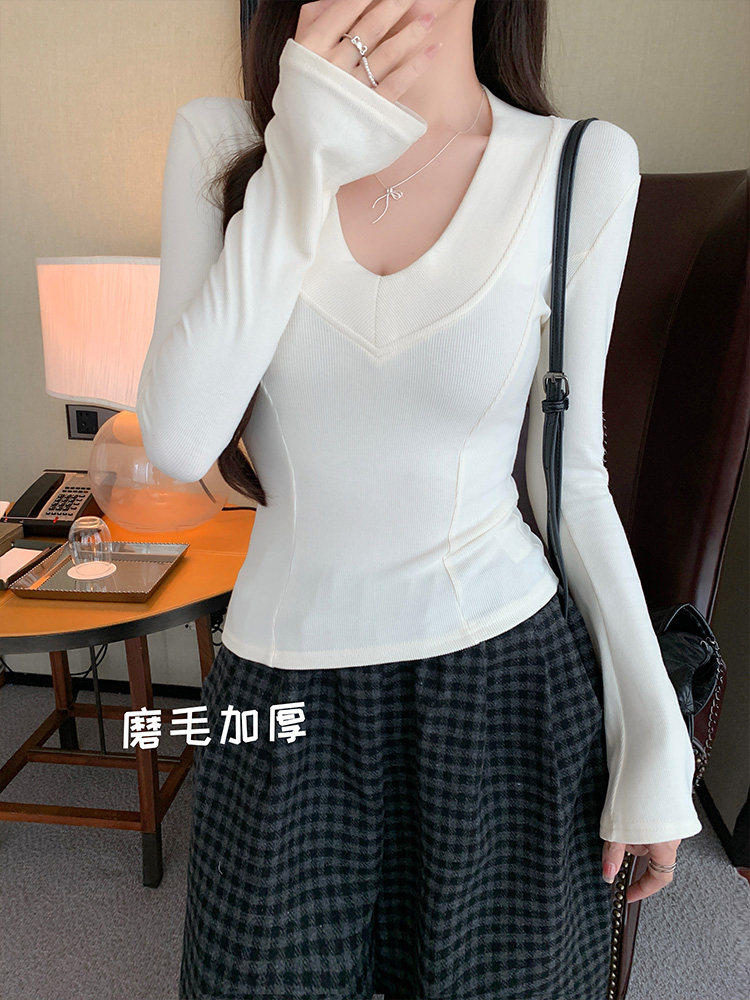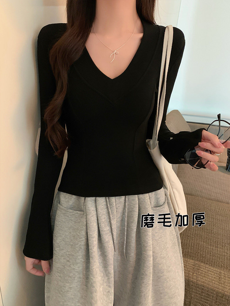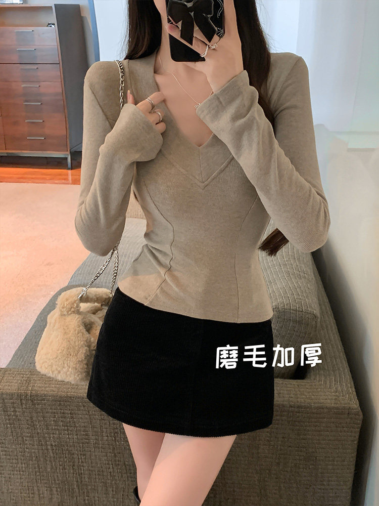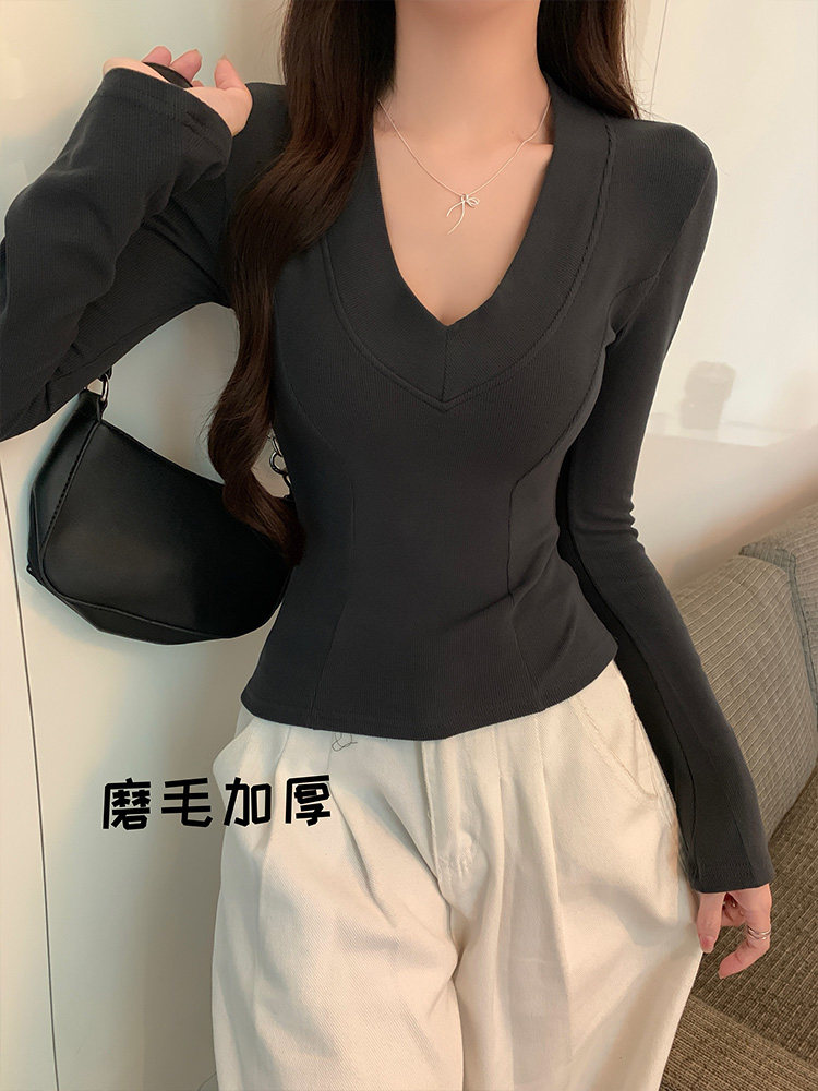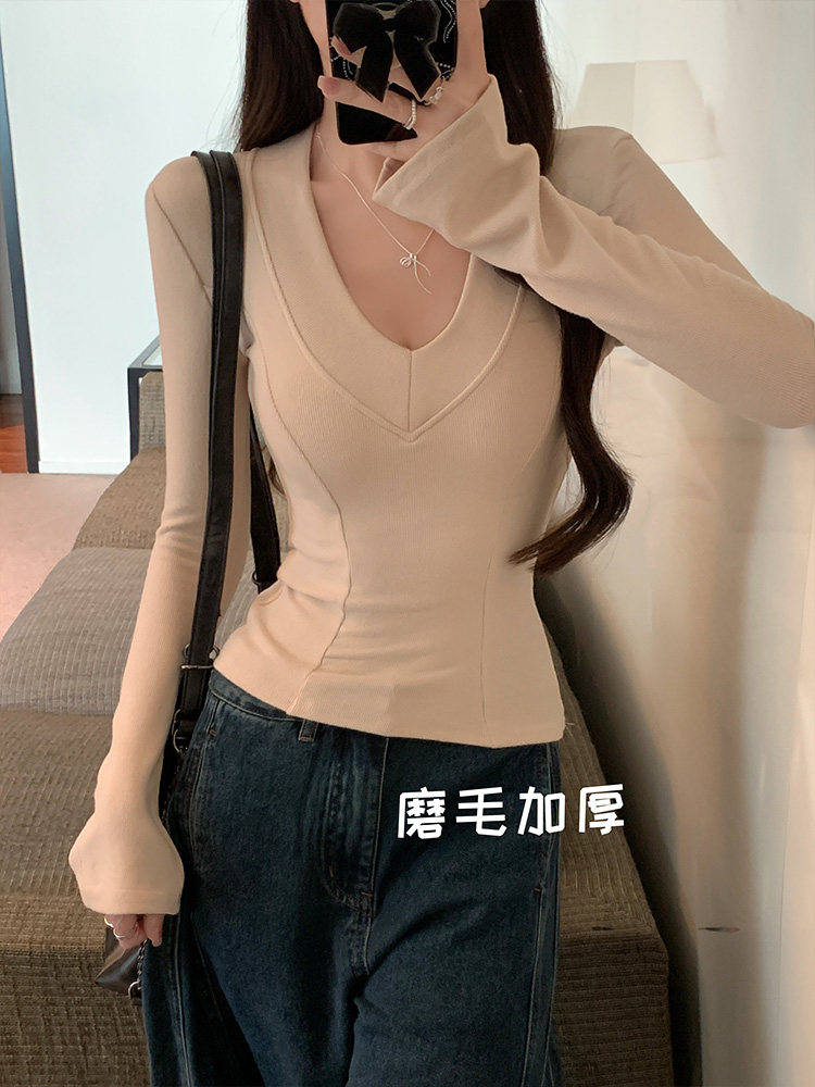 Spicy Girl Style Patchwork Fishbone V-Neck Thickened Fleece-Lined Base Shirt for Women, New Spring Korean Version Slim-Fit Waist-Cinching Long-Sleeve T-Shirt for Women