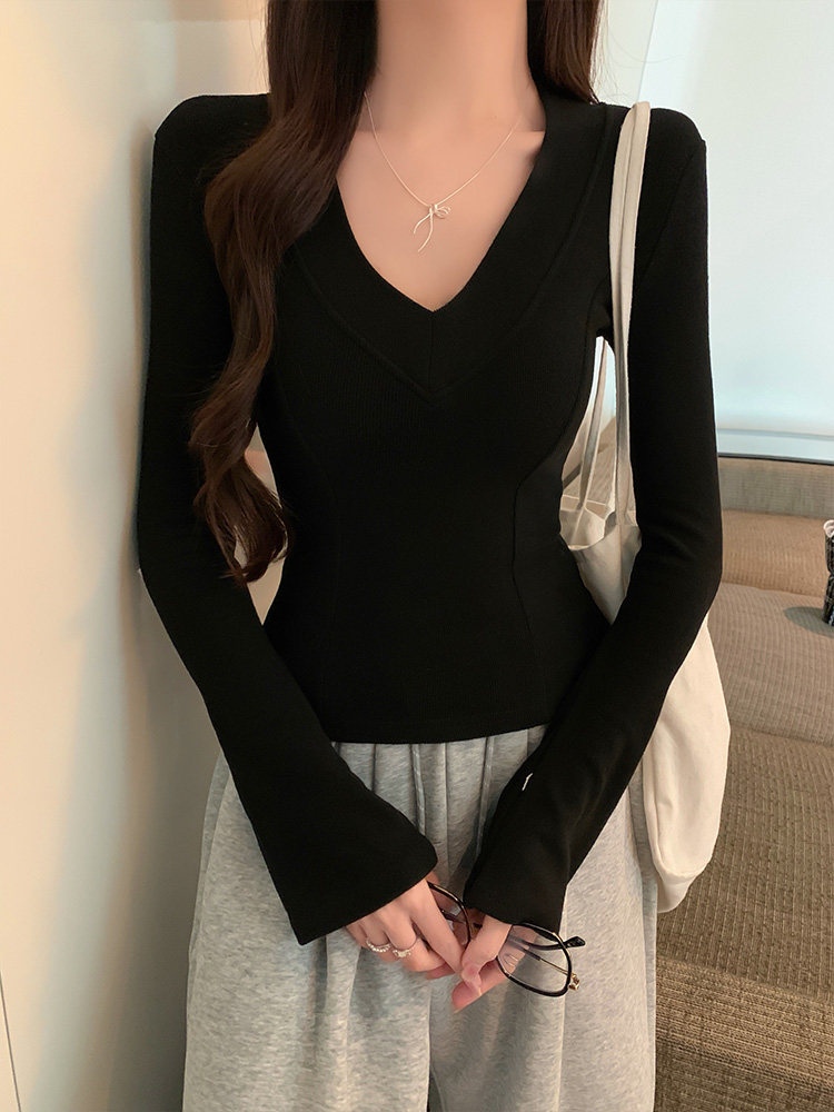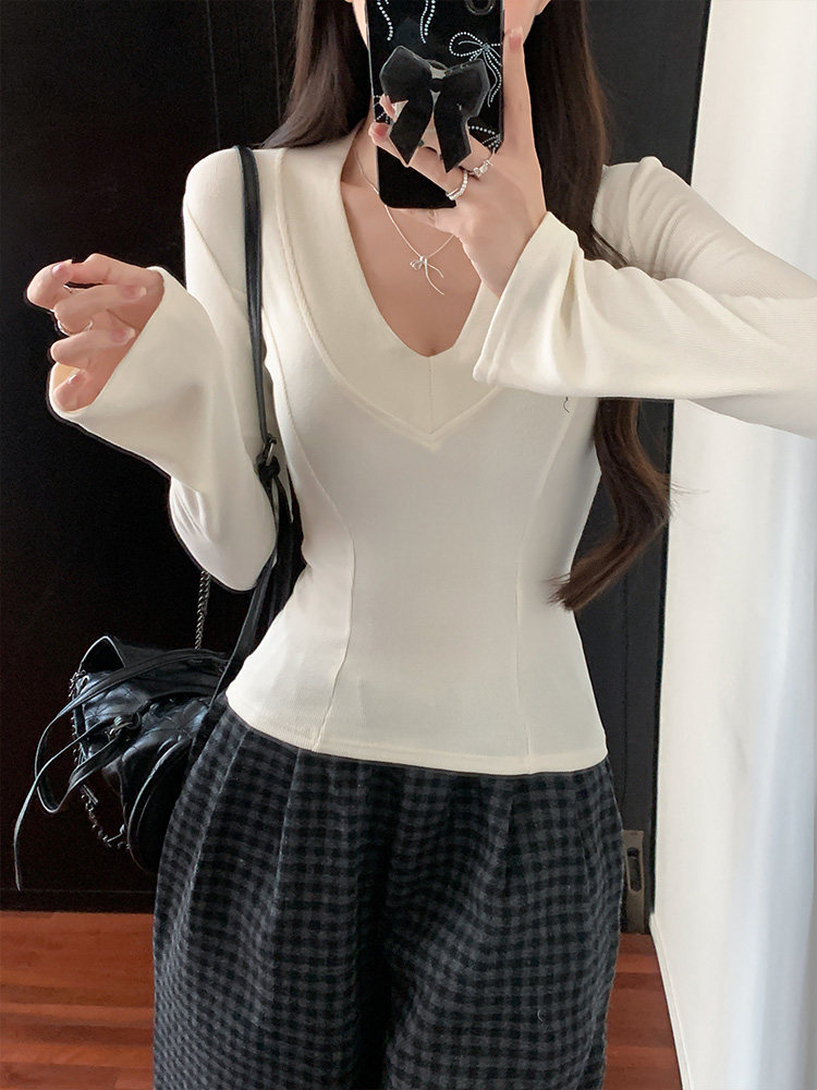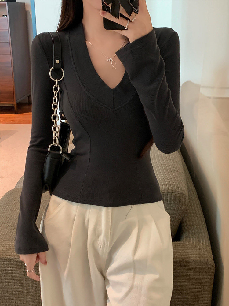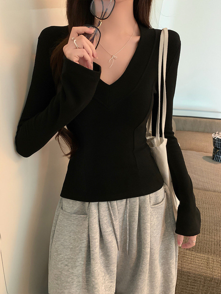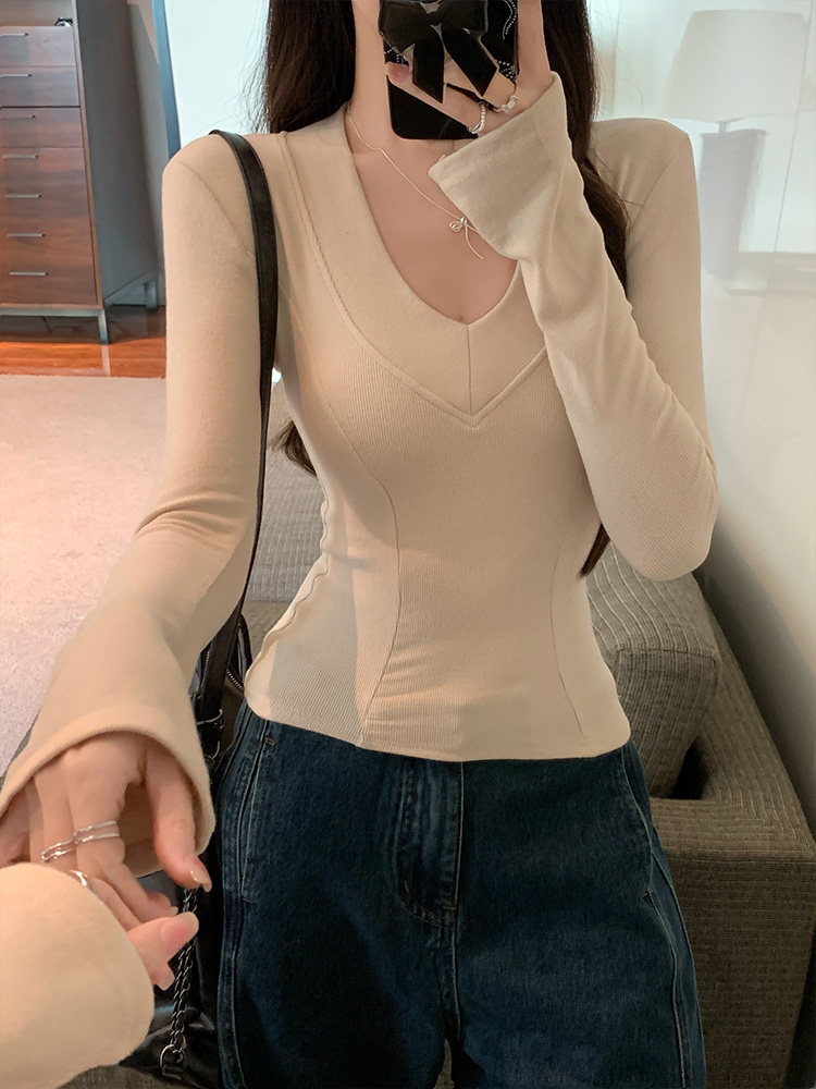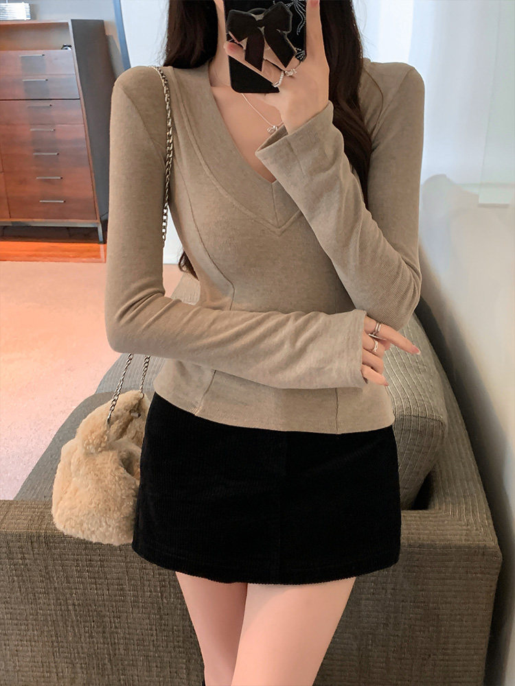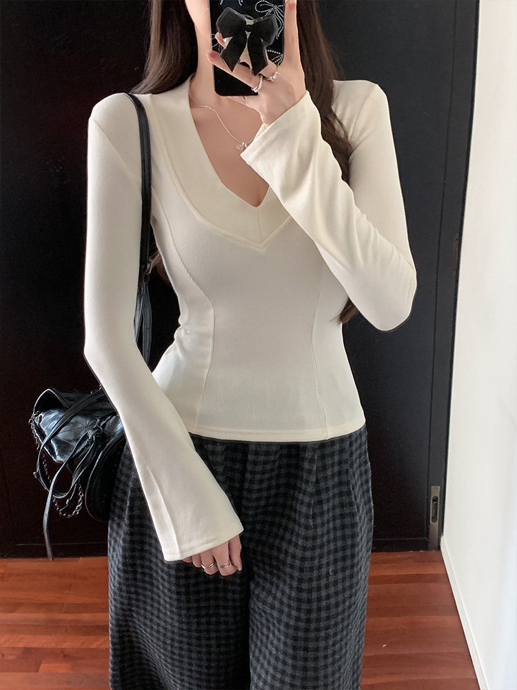 Spicy Girl Style Patchwork Fishbone V-Neck Thickened Fleece-Lined Base Shirt for Women, New Spring Korean Version Slim-Fit Waist-Cinching Long-Sleeve T-Shirt for Women